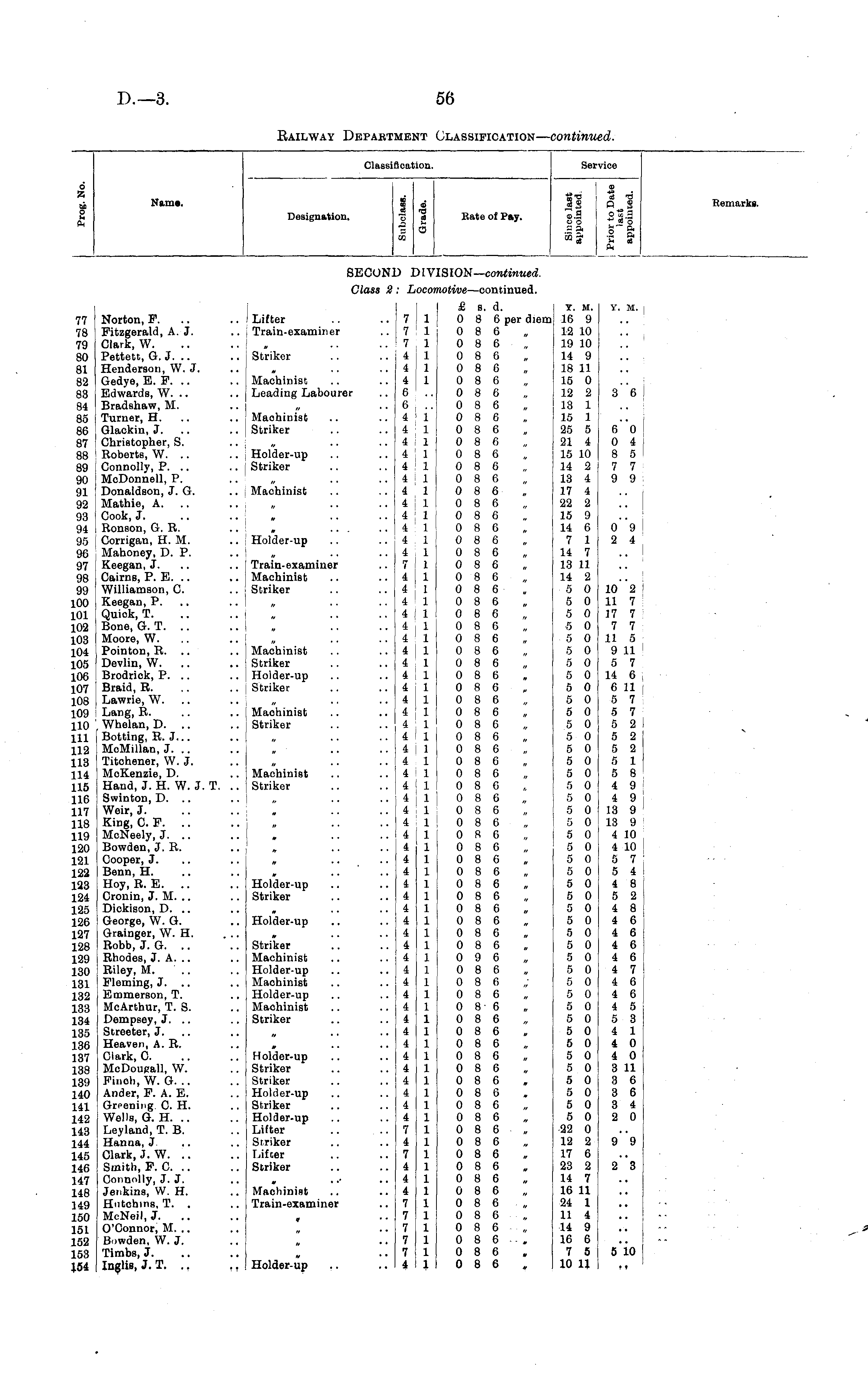 In ssi in. Service d X 00 o u Ph Name. Designation. m D 3 e 3 Rate of Fay. *i rS2 co .9 CO O 3 ft I Q I o s ©IS 9 .2 g £ * Remark SECONJ IV! SION — continued. Class 2 >cor, lotive —continued. 77 78 79 80 81 82 83 84 85 86 87 88 89 90 91 92 93 94 95 96 97 98 99 100 101 102 103 104 105 106 107 108 109 110 111 112 113 114 115 116 117 118 119 120 121 122 123 124 125 126 127 128 129 130 131 132 133 134 135 136 137 138 139 140 141 142 143 144 145 146 147 148 149 150 151 152 153 154 Norton, F. Fitzgerald, A. J. Clark, W. Pettett, G. J. .. Henderson, W. J. Gedye, E. F. .. Edwards, W. .. Bradshaw, M. Turner, H. Glackin, J. Christopher, S. Roberts, W. .. Connolly, P. .. McDonnell, P. Donaldson, J. G. Mathie, A. Cook, J. Ronson, G. R. Corrigan, H. M. Mahoney, D. P. Keegan, J. Cairns, P. E. .. Williamson, C. Keegan, P. Quick, T. Bone, G. T. .. Moore, W. Pointon, R. .. Devlin, W. Brodrick, P. .. Braid, R. Lawrie, W. .. Lang, R. Whelan, D. .. Botting, R. J... McMillan, J. .. Titchener, W.J. MoKenzie, D. Hand, J. H. W. J. T. .. Swinton, D. .. Weir, J. King, C P. McNeely, J. .. Bowden, J. R. Cooper, J. Benn, H. Hoy, R. E. Cronin, J. M. .. Dickison, D. .. George, W. G. Grainger, W. H. Robb, J. G. .. Rhodes, J. A. .. Riley, M. Fleming, J. .. Emmerson, T. McArthur, T. S. Dempsey, J. .. Streeter, J. Heaven, A. R. Clark, O. McDougall, W. Finch, W. G. .. Ander, F. A. E. Greening C H. Wells, G. H. .. Leyland, T. B. Hanna, J Clark, J. W. .. Smith, F. 0. .. Connolly, J. J. Jenkins, W. H. Hutchins, T. . McNeil, J. O'Connor, M. .. Bowden, W. J. Timbs, J. Inglis, J. T. ., Lifter Train-examiner Striker Machinist Leading Labourer Maohinist Striker Holder-up Striker Machinist Holder-up Trainexamiuer Machinist Striker Machinist Striker Holder-up Striker Machinist Striker Machinist Striker 7 7 7 4 4 4 6 G 4 4 4 4 4 4 4 4 4 4 4 4 7 4 4 4 4 4 4 4 4 4 4 4 4 4 4 4 4 4 4 4 4 4 4 4 4 4 4 4 4 4 4 4 4 4 4 4 4 4 4 4 4 4 4 4 4 4 7 4 7 4 4 4 7 7 7 7 7 4 1 1 1 1 1 1 1 1 1 1 1 1 1 1 1 1 1 1 1 1 1 1 1 1 1 1 1 1 1 1 1 1 1 1 1 1 1 1 1 1 1 1 1 1 1 1 1 1 1 1 1 1 1 1 1 1 1 1 1 1 1 1 1 1 1 1 1 1 1 1 1 1 1 1 1 1 £ s. d. 0 8 6 per diem 0 8 6 0 8 6 0 8 6 0 8 6 0 8 6 0 8 6 0 8 6 0 8 6 0 8 6 0 8 0 0 8 0 0 8 6 0 8 0 0 8 6 0 8 6 0 8 6 0 8 6 0 8 6 0 8 6 0 8 6 0 8 6 0 8 6 0 8 6 0 8 6 0 8 6 0 8 6 0 8 6 0 8 6 0 8 6 0 8 6 0 8 6 0 8 6 0 8 6 0 8 6 0 8 6 0 8 6 0 8 6 0 8 6 0 8 6 0 8 6 0 8 6 0 8 6 0 8 6 0 8 6 0 8 6 0 8 6 0 8 6 0 8 6 0 8 6 0 8 6 0 8 6 0 9 6 0 8 6 0 8 6 0 8 6 0 8 6 0 8 6 0 8 6 0 8 6 0 8 6 0 8 6 0 8 6 0 8 6 0 8 6 0 8 6 0 8 6 0 8 6 0 8 6 0 8 6 0 8 6 0 8 6 0 8 6 0 8 6 0 8 6 0 8 6 0 8 6 0 8 6 Y. M. 16 9 12 10 19 10 14 9 18 11 15 0 12 2 13 1 15 1 25 5 21 4 15 10 14 2 13 4 17 4 22 2 15 9 14 6 7 1 14 7 13 11 14 2 5 0 5 0 5 0 5 0 5 0 6 0 5 0 6 0 5 0 5 0 5 0 5 0 5 0 5 0 5 0 5 0 6 0 5 0 5 0 5 0 5 0 5 0 5 0 5 0 5 0 5 0 5 0 5 0 5 0 5 0 5 0 5 0 5 0 6 0 5 0 5 0 5 0 5 0 5 0 5 0 5 0 5 0 5 0 5 0 22 0 12 2 17 6 23 2 14 7 16 11 24 1 11 4 14 9 16 6 7 5 10 11 y. M. 3 6 6 0 0 4 8 5 7 7 9 9 o"9 2 4 10 2 11 7 17 7 7 7 11 5 9 11 5 7 14 6 j 6 11 5 7 5 7 5 2 ! 5 2 5 2 5 1 5 8 4 9 4 9 13 9 13 9 4 10 4 10 5 7 5 4 4 8 5 2 4 8 4 6 4 6 4 6 4 6 4 7 4 6 4 6 4 5 5 3 4 1 4 0 4 0 3 11 3 6 3 6 3 4 2 0 Holder-up Striker Holder-up Striker Machinist Holder-up Machinist Holder-up Machinist Striker Holder-up Striker Striker Holder-up Striker Holder-up Lifter Striker Lif ter Striker 9 9 2*3 Machinist Train-examiner a • ■ 510 Holder-up • f