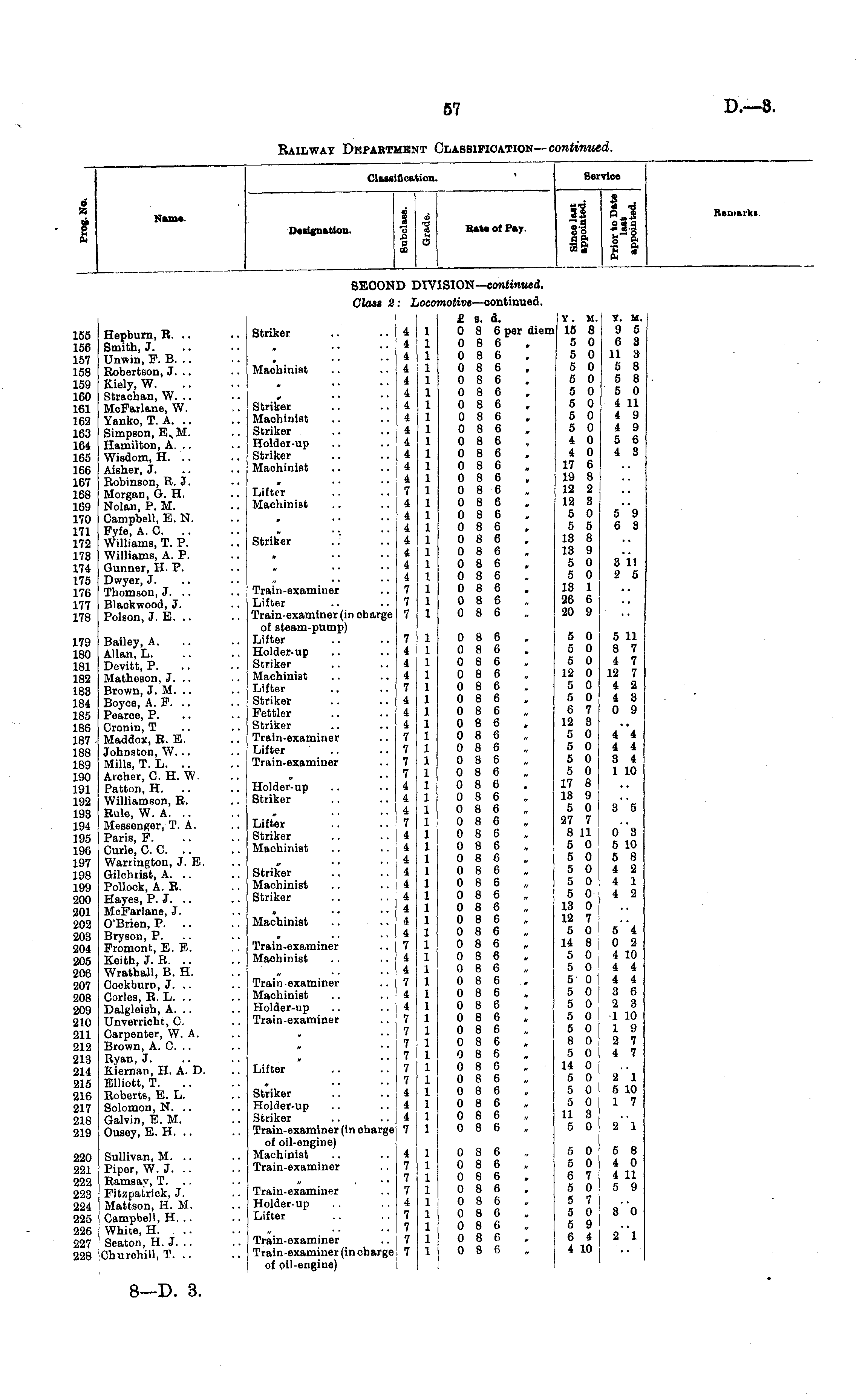 Classificatioi Service 6 X t Ph Name. Designation. CO 8 "co £ a to co •O ea c 53 Rate of Pay. o 1 S ° 2 a II i I Remarks. seoon: )IV [SION— continued. [55 [56 [57 [58 L59 [60 161 [62 [63 L64 [65 166 [67 [68 [69 [70 [71 [72 [73 [74 [75 [76 [77 [78 Hepburn, R. .. Smith, J. Unwin, F. B. .. Robertson, J. .. Kiely, W. Strachan, W. .. McFarlane, W. Yanko, T. A. Simpson, E„ M. Hamilton, A. .. Wisdom, H. .. Aisher, J. Robinson, R. J. Morgan, G. H. Nolan, P. M. Campbell, E. N. Fyfe, A. 0. Williams, T. P. Williams, A. P. Gunner, H. P. Dwyer, J. Thomson, J. .. Blackwood, J. Poison, J. E. Class 2 Striker Machinist Striker Machinist Striker Holder-up Striker Maohinist 4 4 4 4 4 4 4 4 4 4 4 4 4 7 4 4 4 4 4 4 4 7 7 7 lOCOi native —oontinued. £ s. d. 0 8 6 per diem 0 8 6 0 8 6 0 8 6 0 8 6 0 8 6 0 8 6 0 8 6 0 8 6 0 8 6 0 8 6 0 8 6 0 8 6 0 8 6 0 8 6 0 8 6 0 8 6 0 8 6 0 8 6 0 8 6 0 8 6 0 8 6 0 8 6 0 8 6 Y. M. 15 8 5 0 5 0 5 0 5 0 5 0 5 0 5 0 5 0 4 0 4 0 17 6 19 8 12 2 12 3 5 0 5 5 13 8 13 9 5 0 5 0 13 1 26 6 20 9 Y. M. 9 5 6 3 11 3 5 8 5 8 5 0 4 11 4 9 4 9 5 6 4 3 Lifter Machinist 5"9 6 3 Striker 3*ii 2 5 .79 [80 [81 [82 .83 .84 .85 .86 .87 .88 .89 .90 .91 [92 [93 [94 195 [96 .97 .98 [99 !00 !01 !02 !03 104 !05 !06 !07 208 !09 !10 ill !12 !13 !14 .15 !16 217 218 219 Bailey, A. Allan, L. Devitt, P. MatheBon, J. Brown, J. M. .. Boyce, A. F. Pearce, P. Cronin,T Maddox, R. E. Johnston, W. .. Mills, T. L. .. Archer, 0. H. W. Patton, H. Williamson, R. Rule, W. A. Messenger, T. A. Paris, F. Curie, CO. Warrington, J. E. Gilchrist, A. .. Pollock, A. R. Hayes, P. J. McFarlane, J. O'Brien, P. .. Bryson, P. Fromont, E. E. Keith, J. R. Wrathall, B. H. Cockburn, J. .. Corles, R. L. Dalgleish, A. .. Unverriohr, 0. Carpenter, W. A. Brown, A. 0. Ryan, J. Kiernan, H. A. D. Elliott, T. Roberts, E. L. Solomon, N. .. Galvin, E. M. Ousey, E. H. Train-examiner Lifter Train-examiner (in oharge of steam-pump) Lifter Holder-up Striker Machinist Lifter Striker Fettler Striker Train-examiner Lifter Train-examiner 7 4 4 4 7 4 4 4 7 7 7 7 4 4 4 7 4 4 4 4 4 4 4 4 4 7 4 4 7 4 4 7 7 7 7 7 7 4 4 4 7 0 8 6 0 8 6 0 8 6 0 8 6 0 8 6 0 8 6 0 8 6 0 8 6 0 8 6 0 8 6 0 8 6 0 8 6 0 8 6 0 8 6 0 8 6 0 8 6 0 8 6 0 8 6 0 8 6 0 8 6 0 8 6 0 8 6 0 8 6 0 8 6 0 8 6 0 8 6 0 8 6 0 8 6 0 8 6 ,. 0 8 6 0 8 6 0 8 6 0 8 6 0 8 6 0 8 6 0 8 6 0 8 6 0 8 6 0 8 6 0 8 6 0 8 6 5 0 5 0 5 0 12 0 5 0 5 0 6 7 12 3 5 0 5 0 5 0 5 0 17 8 13 9 5 0 27 7 8 11 5 0 5 0 5 0 5 0 5 0 13 0 12 7 5 0 14 8 5 0 5 0 5 0 5 0 5 0 5 0 5 0 8 0 5 0 14 0 5 0 5 0 5 0 11 3 5 0 5 11 8 7 4 7 12 7 4 2 4 3 0 9 4 4 4 4 3 4 1 10 Holder-up Striker 3"5 Lifter Striker Machinist 0 3 5 10 5 8 4 2 4 1 4 2 Striker Machinist Striker Machinist .. 5 4 0 2 4 10 4 4 4 4 3 6 2 3 1 10 1 9 2 7 4 7 Train-examiner Machinist Train examiner Machinist Holder-up Train-examiner Lifter Striker Holder-up Striker Train-examiner (in oharge of oil-engine) Machinist Train-examiner 2 1 5 10 1 7 2 1 220 221 222 223 224 225 226 227 228 Sullivan, M. Piper, W. J. .. Ramsay, T. Pitzpatrick, J. Mattson, H. M. Campbell, H. .. White, H. Seaton, H.J. Churchill, T. .. 4 7 7 7 4 7 7 7 7 0 8 6 0 8 6 0 8 6 0 8 6 0 8 6 0 8 6 0 8 6 0 8 6 0 8 6 5 0 5 0 6 7 5 0 5 7 5 0 5 9 6 4 4 10 5 8 4 0 4 11 5 9 Train-examiner Holder-up Lifter 3"o Train-examiner Train-examiner (in charge of oil-engine) 2 1