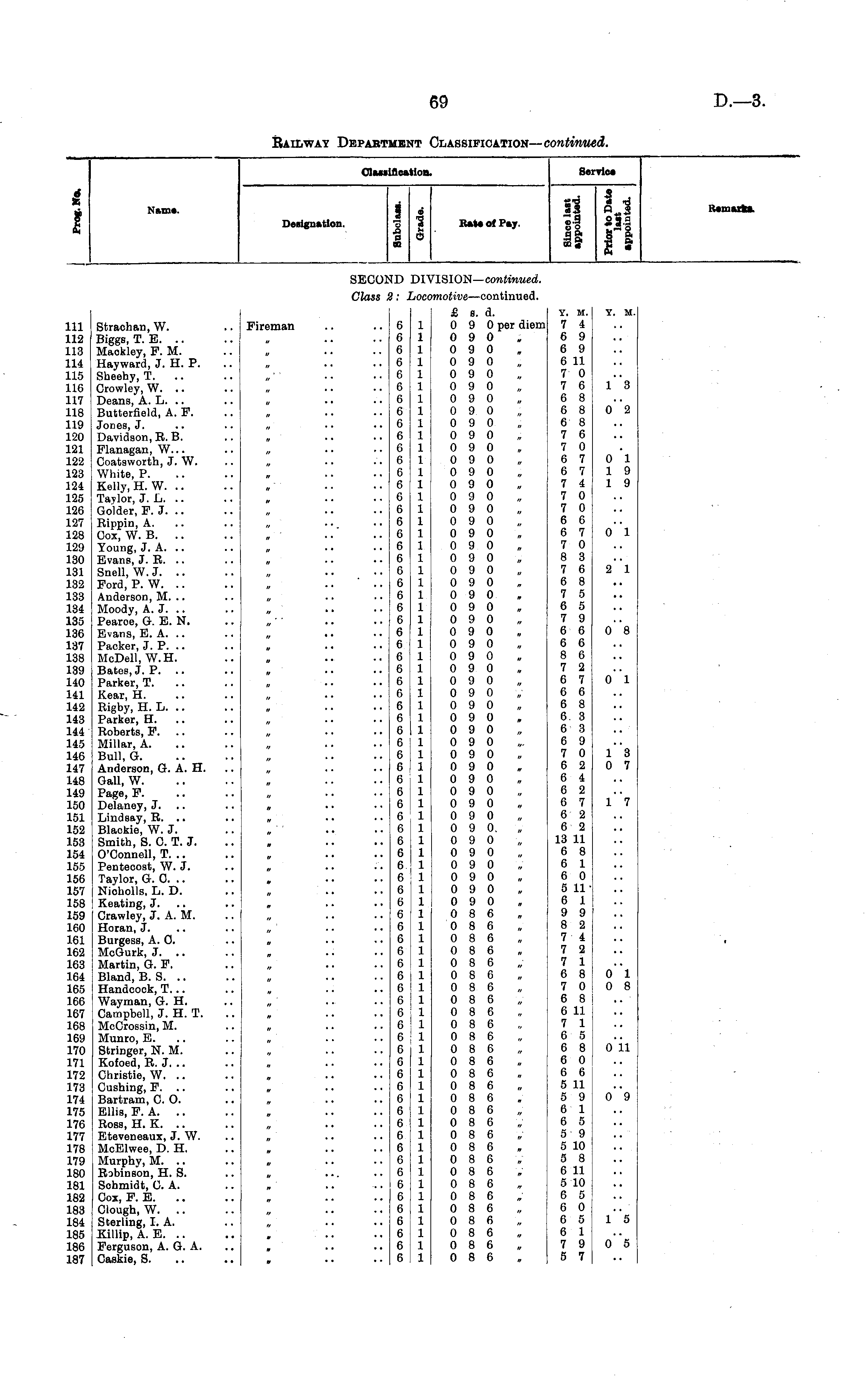Ion. I Name. Designation. m So toco OS rj U a 53 n Rate of Pay. 33 •I •9§ ta id R co HaHH o to a Z~ ° o o> •S B> Remark*. seco: D Dr VISION— continued. Class .OC( rmotive —continued. 111 112 113 114 115 116 117 118 119 120 121 122 123 124 125 126 127 128 129 130 131 132 133 134 135 136 137 138 139 140 141 142 143 144 145 146 147 148 149 150 151 152 153 154 155 156 157 158 159 160 161 162 163 164 165 166 167 168 169 170 171 172 173 174 175 176 177 178 179 180 181 182 183 184 185 186 187 Strachan, W. Biggs, T. E. .. Maokley, F. M. Hayward, J. H. P. Sheehy, T. Crowley, W. .. Deans, A. L. Butterfield, A. F. Jones, J. Davidson, R. B. Flanagan, W... Coatsworth, J. W. White, P. Kelly, H. W. .. Taylor, J. L. Golder, P. J. Rippin, A. Cox, W. B. Young, J. A. Evans, J. R. Snell, W.J. Ford, P. W. Anderson, M. .. Moody, A. J. Pearoe, G. E. N. Evans, E. A. .. Packer, J. P. McDell, W.H. Bates, J. P. .. Parker, T. Kear, H. Rigby, H. L. Parker, H. Roberts, F. .. Millar, A. Bull, G. Anderson, G. A. H. Gall, W. Page, F. Delaney, J. Lindsay, R. .. Blackie, W. J. Smith, S. 0. T. J. O'Connell, T. .. Pentecost, W. J. Taylor, G. 0. .. Nioholls, L. D. Keating, J. Crawley, J. A. M. Horan, j. Burgess, A. 0. McGurk, J. .. Martin, G. F. Bland, B. S. Handcock, T... Wayman, G. H. Campbell, J. H. T. McCrossin, M. Munro, E. Stringer, N. M. Kofoed, R. J. .. Christie, W. .. Cushing, F. .. Bartram, 0. O. Ellis, F. A. Ross, H. K. Eteveneaux, J. W. MoElwee, D. H. Murphy, M. .. Robinson, H. S. Sohmidt, 0. A. Cox, P. E. Clough, W. .. Sterling, I. A. Killip, A. E. Ferguson, A. G. A. Caskie, S. Fireman 0 6 6 6 6 G 6 C G 0 6 6 6 6 6 6 0 0 6 6 6 G 6 0 6 6 6 6 6 6 0 6 6 6 G G 6 G G 0 6 G 6 6 6 6 6 6 6 0 6 G 6 6 6 6 6 0 0 6 G 6 6 6 G 6 6 6 6 6 6 G G G G G 0 6 1 1 1 1 1 1 1 1 1 1 1 1 1 1 1 1 1 1 1 1 1 1 1 1 1 1 1 1 1 1 1 1 1 1 1 1 1 1 1 1 1 1 1 1 1 1 1 1 1 1 1 1 1 1 1 1 1 1 1 1 1 1 1 1 1 1 1 1 1 1 1 1 1 1 1 1 1 £ s. d. 0 9 0 per diem 0 9 0 0 9 0 0 9 0 0 9 0 0 9 0 0 9 0 0 9 0 0 9 0 0 9 0 0 9 0 0 9 0 0 9 0 0 9 0 0 9 0 0 9 0 0 9 0 0 9 0 0 9 0 0 9 0 0 9 0 0 9 0 0 9 0 0 9 0 0 9 0 0 9 0 0 9 0 0 9 0 0 9 0 0 9 0 0 9 0 0 9 0 0 9 0 0 9 0 0 9 0 0 9 0 0 9 0 0 9 0 0 9 0 0 9 0 0 9 0 0 9 0. „ 0 9 0 0 9 0 0 9 0 0 9 0 0 9 0 0 9 0 0 8 6 0 8 6 0 8 6 0 8 6 0 8 6 0 8 6 0 8 6 0 8 6 0 8 6 0 8 6 0 8 6 0 8 6 0 8 6 0 8 6 0 8 6 0 8 6 0 8 6 0 8 6 0 8 6 0 8 6 0 8 6 0 8 6 0 8 6 0 8 6 0 8 6 0 8 6 0 8 6 0 8 6 0 8 6 Y. M. 7 4 6 9 6 9 6 11 7 0 7 6 6 8 6 8 6 8 7 6 7 0 6 7 6 7 7 4 7 0 7 0 6 6 6 7 7 0 8 3 7 6 6 8 7 5 6 5 7 9 6 6 6 6 8 6 7 2 6 7 6 6 6 8 6. 3 6 3 6 9 7 0 6 2 6 4 6 2 6 7 6 2 6 2 13 11 6 8 6 1 6 0 5 116 1 9 9 8 2 7 4 7 2 7 1 6 8 7 0 6 8 6 11 i 7 1 6 5 6 8 6 0 6 6 5 11 5 9 6 1 6 5 5 9 5 10 5 8 6 11 5 10 6 5 6 0 6 5 6 1 7 9 5 7 Y. M. l"3 0 - 2 0 1 1 9 1 9 o"i 2 1 o"8 0 1 l"3 0 7 i"t 0 0 o"i 0 8 oil 0 - 9 0 i"e 0 - 5 0