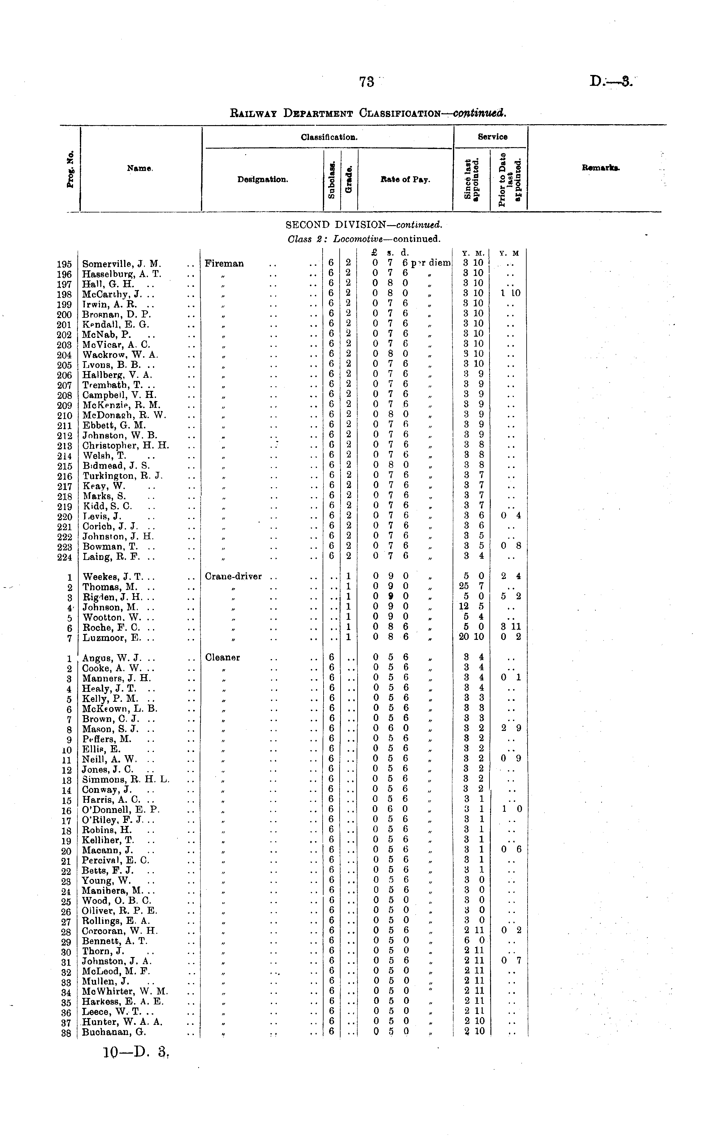 Classi ifical ;ion. Service d Z Bo s a. Name. Designation. 1 3 in 6 e Bate of Pay. $ t IS Remark*. secon: )iv: SION— cont inued. Class 2 iOCOI totive —continued. 1.95 196 L97 198 199 >00 !01 102 !08 !04 >05 106 807 208 !09 210 211 us 818 H4 215 J 1C 217 218 J 19 120 121 12-2 828 224 Somerville, J. M. Hasselburg, A. T. Hall, G. H. .. McCarthy, J. .. Irwin, A. K. Brosnan, D. P. Kendall, E. G. McNab, P. MoVioar, A. O. Wackrow, W. A. Lvons, B. B. .. Hallberg, V. A. Tremhath, T. .. Campbell, V. H. MeKenzie, B. M. McDonaah, R. W. Ebbett, G. M. Johnston, W. B. Christopher, H. H. Welsh, T. Bidtnead, J. S. Turkington, R. J. Kfav, W. Marks, S. Kidd, S. C. .. I.evis, J. Corich, J. J. Johnston, J. H. Bowman, T. .. Lairjg, R. P. .. Fireman 6 6 6 6 6 6 6 6 6 6 6 6 G 6 6 6 6 6 6 6 f> 6 6 6 6 6 6 6 6 6 2 2 2 2 ■2 2 •2 2 2 2 2 2 2 2 2 2 2 2 2 2 2 2 2 2 2 2 2 2 2 2 £ s. a. 0 7 6 diem 0 7 6 0 8 0 0 8 0 0 7 6 0 7 6 0 7 6 0 7 6 0 7 6 0 8 0 0 7 6 0 7 6 0 7 6 0 7 6 0 7 6 0 8 0 0 7 6 0 7 6 0 7 6 0 7 6 0 8 0 0 7 6 0 7 6 0 7 6 0 7 6 0 7 6 0 7 6 0 7 6 0 7 6 0 7 6 Y. M. 3 10 3 10 3 10 3 10 3 10 3 10 3 10 3 10 3 10 3 10 3 10 3 9 3 9 3 9 3 9 3 9 3 9 3 9 3 8 3 8 3 8 3 7 3 7 3 7 3 7 3 6 3 6 3 5 3 5 3 4 Y. M lio 0 4 o"s 1 2 8 4 5 6 7 Weekes, J. T. .. Thomas, M. .. Rigien, J. H. .. Johnson, M. .. Wootton. W. .. Roche, P. C. Luzmoor, E. .. Crane-driver .. 1 1 1 1 1 1 1 0 9 0 0 9 0 0 9 0 0 9 0 0 9 0 0 8 6 0 8 6 5 0 25 7 5 0 12 5 5 4 5 0 20 10 2 4 5 2 3 ii 0 2 1 2 3 4 5 6 7 8 9 10 11 12 13 14 15 16 17 18 19 20 21 22 28 21 25 26 27 28 29 30 31 32 83 34 35 36 37 38 Angus, W. J. .. Cooke, A. W. Manners, J. H. Healy, J. T. Kelly, P. M. .. McKeown, L. B. Brown, 0. J. Mason, S. J. .. PeHers, M. Ellis, E. Neill, A. W. .. Jones, J. C. Simmons, R. H. L. Conway, J. Harris, A. C. O'Donnell, E. P. O'Riley, P. J. .. Robins, H. Kelliher, T. .. Macann, J. Peroival, E. C. Betts, P. J. Young, W. .. Manihera, M. .. Wood, O. B. C. Olliver, R. P. E. Rollings, E. A. Corcoran, W. H. Bennett, A. T. Thorn, J. Johnston, J. A. McLeod, M. P. Mullen, J. MoWhirter, W. M. Harkess, E. A. E. Leece, W, T. .. Hunter, W. A. A. Buchanan, G. Cleaner 6 6 6 6 6 6 6 6 6 6 6 6 6 6 6 6 6 6 6 6 6 6 6 6 6 6 6 6 6 6 6 6 6 6 6 6 6 6 0 5 6 0 5 6 0 5 6 0 5 6 0 5 6 0 5 6 0 5 6 0 6 0 0 5 6 0 5 6 0 5 6 0 5 6 0 5 6 0 5 6 0 5 6 0 6 0 0 5 6 0 5 6 0 5 6 0 5 6 0 5 6 0 5 6 0 5 6 0 5 6 0 5 0 0 5 0 0 5 0 0 5 6 0 5 0 0 5 0 0 5 6 0 5 0 0 5 0 0 5 0 0 5 0 0 5 0 0 5 0 0 5 0 3 4 3 4 3 4 3 4 3 3 3 3 3 3 3 2 3 2 3 2 3 2 3 2 3 2 3 2 3 1 3 1 3 1 3 1 3 1 3 1 3 1 3 1 3 0 3 0 3 0 3 0 3 0 2 11 6 0 2 11 2 11 2 11 2 11 2 11 2 11 2 11 2 10 2 10 0 1 2 9 0 9 10 o"6 0 2 0 7 1 11