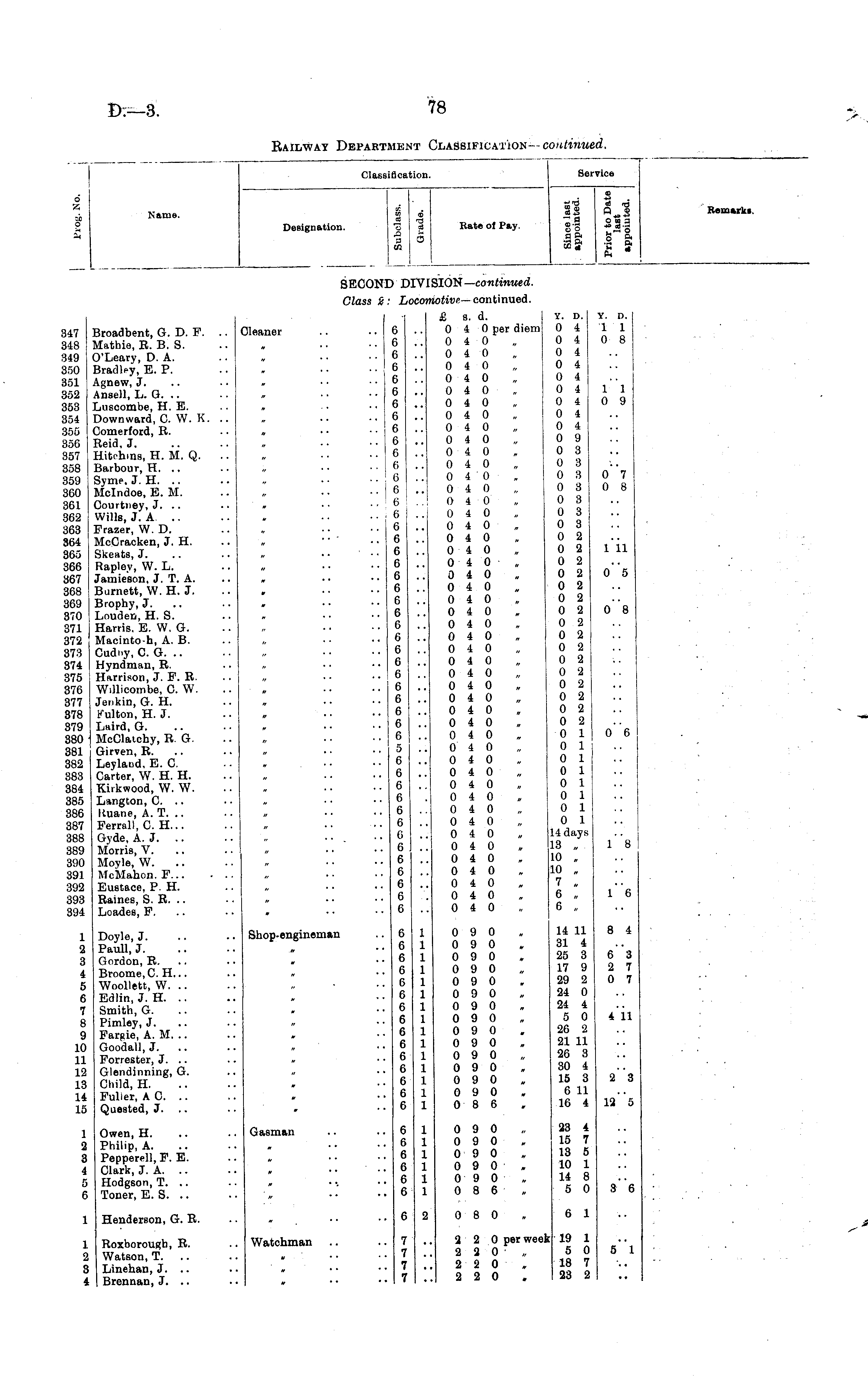 Class: ification. Service o" to p Name. Designation. tr. tu a o j=i y 9 •3 1 3 Rate of Pay. £"3 (J rg §h? 0„1 • ■S SS-2 ° 2 Z™ ° oft g a a* I i Ph Remarks. SECONI HV SION— continued. Class 2: ,OCO: notive— con ti nued. 347 348 349 350 351 352 353 354 355 356 357 358 359 360 361 362 363 364 365 366 367 368 369 370 371 372 373 874 375 376 377 378 379 380 381 382 383 384 385 386 387 388 389 390 391 392 393 394 Broadbent, G. D. P. Mathie, R. B. S. O'Leary, D. A. Bradley, E. P. Agnew, J. Ansell, L. G. .. Luscombe, H. E. Downward, C W. K. .. Comerford, R. Reid, J. Hitchms, H. M. Q. Barbour, H. .. Syme, J. H. .. Mclndoe, E. M. Courtney, J. .. Wills, J. A .. Frazer, W. D. McCracken, J. H. Skeats, J. Rapley, W. L. Jamieson, J. T. A. Burnett, W. H. J. Brophy, J. Louden,H. S. Harris. E. W. G. Macinto-b, A. B. Cudny, C. G. .. Hyndman, R. Harrison, J. F. R. Willicombe, 0. W. Jenkin, G. H. f'ulton, H. J. Laird, G. McClatchy, R. G. Girven, R. Leylaud. E. C. Carter, W. H. H. Kirk wood, W. W. Langton, 0. .. Ruane, A. T. .. Ferrall, C H... Gyde, A. J. .. Morria, V. Moyle, W. McMahon. F Eustace, P. H. Raines, S. R. .. Loades, F. Cleaner 6 0 6 6 6 G G G G 6 6 0 6 G o 0 6 G 6 0 0 G 6 6 6 6 6 6 6 0 G G G 6 5 6 6 0 0 6 6 G 6 6 6 G G 6 £ 8. d. 0 4 0 per diem 0 4 0 0 4 0 0 4 0 0 4 0 0 4 0 0 4 0 0 4 0 0 4 0 0 4 0 0 4 0 0 4 0 0 4 0 0 4 0 0 4 0 0 4 0 0 4 0 0 4 0 0 4 0 0 4 0 „ 0 4 0 0 4 0 0 4 0 0 4 0 0 4 0 0 4 0 0 4 0 0 4 0 0 4 0 0 4 0 0 4 0 0 4 0 0 4 0 0 4 0 0 4 0 0 4 0 0 4 0 0 4 0 0 4 0 0 4 0 0 4 0 0 4 0 , I 0 4 0 . I 0 4 0 . 1 0 4 0 . I 0 4 0 0 4 0 0 4 0 Y. D. 0 4 0 4 0 4 0 4 0 4 0 4 0 4 0 4 0 4 0 9 0 3 0 3 0 3 0 3 0 3 0 3 0 3 0 2 0 2 0 2 0 2 0 2 0 2 0 2 0 2 0 2 0 2 0 2 0 2 0 2 0 2 0 2 0 2 0 1 0 1 0 1 0 1 0 1 0 1 0 1 0 1 14 days 13 „ 10 „ 10 „ 7 „ 6 „ 6 , Y. D. 1 1 0 8 1 1 0 9 0 - 7 0 8 111 o"5 0 8 ,. • • • * o"6 18 16 1 2 3 4 5 6 7 8 9 10 11 12 13 14 15 Doyle, J. Paull, J. Gordon, R. Broome, C H... Woollett, W. .. Edlin, J. H. .. Smith, G. Pimley, J. Farsie, A. M. .. Goodall, J. Forrester, J. .. Glendinning, G. Child, H. Fuller, AC... Quested, J. Shop-engineman 6 G 6 6 G 6 6 6 G 6 G G 0 G 6 1 1 1 1 1 1 1 1 1 1 1 1 1 1 1 0 9 0 0 9 0 0 9 0 0 9 0 0 9 0 0 9 0 0 9 0 0 9 0 0 9 0 0 9 0 0 9 0 0 9 0 0 9 0 0 9 0 0 8 6 14 11 31 4 25 3 17 9 29 2 24 0 24 4 5 0 26 2 21 11 26 3 30 4 15 3 6 11 16 4 8 4 6 3 2 7 0 7 4 11 23 12 5 1 2 3 4 5 6 Owen, H. Philip, A. Pepperell, P. E. Clark, J. A. .. Hodgson, T. .. Toner, E. S. .. Gasman 6 0 6 6 6 C 1 1 1 1 1 1 0 9 0 0 9 0 0 9 0 0 9 0. 0 9 0 „ 0 8 6 23 4 15 7 13 5 10 1 14 8 5 0 3"6 1 Henderson, G. R. G 2 0 8 0 6 1 1 2 3 4 Roxborough, R. Watson, T. .. Linehan, J. .. Brennan, J. .. Watchman 7 7 7 7 2 2 0 per week 2 2 0 „ 2 2 0 2 2 0 : 19 1 5 0 18 7 23 2 51
