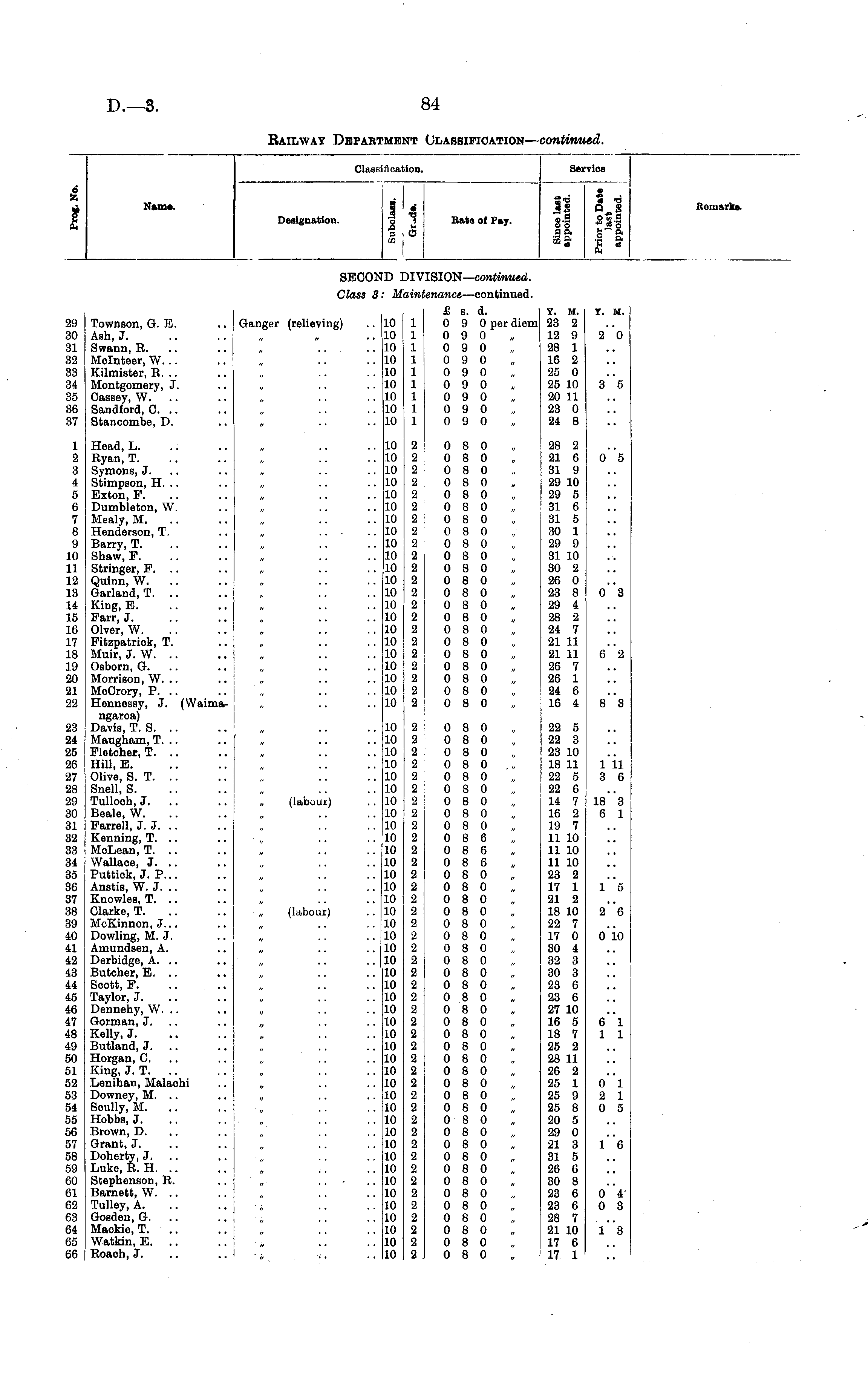 Classi .fi cation. Service 6 X i r, 9h Name. Designation. I I CO 4 ■a e r. 53 Rate of Pay. e «'S 3 Til d| CO Q CO rH HH r-l u « 9 ° «> 9 CO O ? & o a a t a ■* f * Ph Remark* SECO* »rv TSION — continued. Class 3 'An, 'enance —continued. 29 30 81 32 33 34 35 36 37 Townson, G. E. Ash, J. Swann, R. Molnteer, W. .. Kilmister, R. .. Montgomery, J. Oassey, W. Sandford, 0. .. Stancombe, D. Ganger (relieving) 10 10 10 10 10 10 10 10 10 1 1 1 1 1 1 1 1 1 £ s. d. 0 9 0 per diem 0 9 0 0 9 0 0 9 0 0 9 0 0 9 0 0 9 0 0 9 0 0 9 0 Y. M. 23 2 12 9 28 1 16 2 25 0 25 10 20 11 23 0 24 8 Y. M. 2"o 3"5 1 2 3 4 5 6 7 8 9 10 11 12 18 14 15 16 17 18 19 20 21 22 Head, L. .: Ryan, T. Symons, J. Stimpson, H. .. Exton, F. Dumbleton, W. Mealy, M. Henderson, T. Barry, T. Shaw, F. Stringer, F. .. Quinn, W. Garland, T. .. King, E. Farr, J. Olver, W. Fitzpatrick, T. Muir, J. W. .. Osborn, G. Morrison, W. .. McOrory, P. .. Hennessy, J. (Waimangaroa) Davis, T. S. .. Maugham, T. .. Fletoher, T. .. Hill, E. Olive, S. T. .. Snell, S. Tulloch, J. .. Beale, W. Farrell, J. J. .. Kenning, T. .. MoLean, T. .. Wallace, J. .. Puttick, J. P... Anstis, W. J. .. Knowles, T. .. Clarke, T. McKinnon, J... Dowling, M. J. Amundsen, A. Derbidge, A. .. Butcher, E. .. Scott, P. Taylor, J. Dennehy, W. .. Gorman, J. Kelly, J. Rutland, J. Horgan, C. King, J. T. Lenihan, Malachi Downey, M. .. Soully, M. Hobbs, J. Brown, D. Grant, J. Doherty, J. Luke, R. H. .. Stephenson, R. Barnett, W. .. Tulley, A. Gosden, G. .. Mackie, T. .. Watkin, E. .. Roaoh, J. 10 10 10 10 10 10 10 10 10 10 10 10 10 10 10 10 10 10 10 10 10 10 2 2 2 2 2 2 2 2 2 2 2 2 2 2 2 2 2 2 2 2 2 2 0 8 0 0 8 0 0 8 0 0 8 0 0 8 0 , 0 8 0 0 8 0 0 8 0 0 8 0 0 8 0 0 8 0 0 8 0 0 8 0 0 8 0 0 8 0 0 8 0 0 8 0 0 8 0 0 8 0 0 8 0 0 8 0 0 8 0 28 2 21 6 31 9 29 10 29 5 31 6 31 5 30 1 29 9 31 10 30 2 26 0 23 8 29 4 28 2 24 7 21 11 21 11 26 7 26 1 24 6 16 4 0 5 o"3 6 - 2 8"3 23 24 25 20 27 28 29 30 31 32 33 34 35 36 37 38 39 40 41 42 43 44 45 46 47 48 49 50 51 52 53 54 55 56 57 58 59 GO Gl G2 68 64 65 GO „ (labour) ,, (labour) 10 10 10 10 10 10 10 10 10 10 10 10 10 10 10 10 10 10 10 10 10 10 10 10 10 10 10 10 10 10 10 10 10 10 10 10 10 10 10 10 10 10 10 10 2 2 2 2 2 2 2 2 2 2 2 2 2 2 2 3 2 2 2 2 2 2 2 2 2 2 2 2 2 2 2 2 2 2 2 2 2 2 2 2 2 2 2 2 0 8 0 0 8 0 0 8 0 0 8 0 .„ 0 8 0 0 8 0 0 8 0 0 8 0 0 8 0 0 8 6 0 8 6 0 8 6 0 8 0 0 8 0 0 8 0 0 8 0 0 8 0 0 8 0 0 8 0 0 8 0 0 8 0 0 8 0 0 8 0 0 8 0 0 8 0 0 8 0 0 8 0 0 8 0 0 8 0 0 8 0 0 8 0 0 8 0 0 8 0 0 8 0 0 8 0 0 8 0 0 8 0 0 8 0 0 8 0 0 8 0 0 8 0 0 8 0 0 8 0 0 8 0 22 5 22 3 23 10 18 11 22 5 22 6 14 7 16 2 19 7 11 10 11 10 11 10 23 2 17 1 21 2 18 10 22 7 17 0 30 4 32 3 30 3 23 6 23 6 27 10 16 5 18 7 25 2 28 11 26 2 25 1 25 9 25 8 20 5 29 0 21 3 31 5 26 6 30 8 23 6 23 6 28 7 21 10 17 6 17 1 l'ii 3 6 18 - 3 6 1 l"5 2"6 o'io 6"l 1 1 0 1 2 1 0 5 l"6 0 - 4 0 3 18