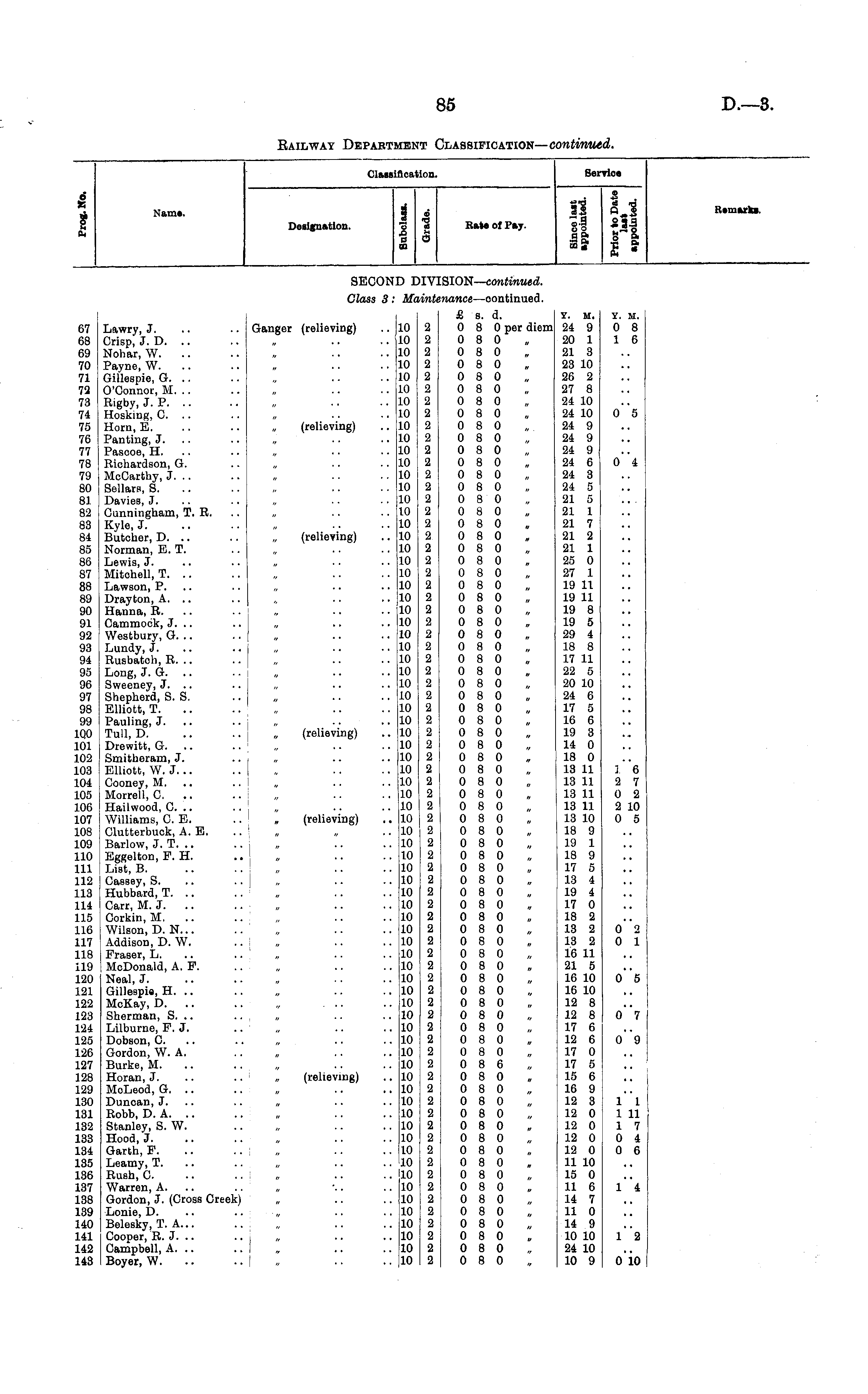 Classification, Service i i rH Name. m 3 "co .Q a co CD toed r. 53 ii ia ° 2 •sa 3 . C3 rrj cTS. •a a Remark*. Designation. Rate of Pay. SECON >iv: [SION— continued. Class 3: lintt rnance —continued. 67 68 69 70 71 72 73 74 75 76 77 78 79 80 81 82 83 84 85 86 87 88 89 90 91 92 93 94 95 96 97 98 99 1Q0 101 102 103 104 105 106 107 108 109 110 111 112 113 114 115 116 117 118 119 120 121 122 123 124 125 126 127 128 129 130 131 132 133 134 135 136 137 138 139 140 141 142 143 Lawry, J. .. .. i Crisp, J. D. .. Nohar, W. .. Payne, W. Gillespie, G. .. O'Connor, M. .. Rtgby, J. P Hosking, 0. .. Horn, E. Panting, J. Pascoe, H. Richardson, G. McCarthy, J. .. Sellars, S. Davies, J. Cunningham, T. R. Kyle, J. Butcher, D. .. Norman, E. T. Lewis, J. Mitchell, T. .. Lawson, P. Drayton, A. .. Hanna, R. Cammock, J. .. Westbury, G. .. Lundy, J. Rusbatch, R. .. Long, J. G. .. Sweeney, J. .. Shepherd, S. S. Elliott, T. Pauling, J. Tull, D. Drewitt, G. .. Smitheram, J. Elliott, W. J... Cooney, M. Morrell, 0. .. Hailwood, 0. .. Williams, CE, Clutterbuck, A. E. .. ' Barlow, J. T. .. .. Eggelton, P. H. List, B. .. .. ! Oassey, S. .. .. | Hubbard, T. .. Carr, M. J. Corkin, M. Wilson, D. N... Addison, D. W. Fraser, L. .. McDonald, A. F. Neal, J. Gillespie, H. .. McKay, D. .. Sherman, S. .. Lilburne, F. J. Dobson, O. Gordon, W. A. Burke, M. Horan, J. .. McLeod, G. .. Duncan, J. Robb, D. A. .. Stanley, S. W. Hood, J. Garth, F. Leamy, T. Rush, O. Warren, A. Gordon, J. (Cross Creek) Lonie, D. .. Belesky, T. A... Cooper, R. J. .. .. i Campbell, A. .. Boyer, W. Ganger (relieving) „ (relieving) „ (relieving) (relieving) „ (relieving) ■. „ \ tt „ (relieving) 10 10 10 10 10 10 10 10 10 10 10 10 10 10 10 10 10 10 10 10 10 10 10 10 10 10 10 10 10 10 10 10 10 10 10 10 10 10 10 10 10 10 10 10 10 10 10 10 10 10 10 10 10 10 10 10 10 10 10 10 10 10 10 10 10 10 10 10 10 10 10 10 10 10 10 10 10 2 2 2 2 2 2 2 2 2 2 2 2 2 2 2 2 2 2 2 2 2 2 2 2 2 2 2 2 2 2 2 2 2 2 2 2 2 2 2 2 2 2 2 2 2 2 2 2 2 2 2 3 2 2 2 2 2 2 2 2 2 2 2 2 2 2 2 2 2 2 2 2 2 2 2 2 2 £ s. d. 0 8 0 per diem 0 8 0 0 8 0 0 8 0 0 8 0 0 8 0 0 8 0 0 8 0 0 8 0 0 8 0 0 8 0 0 8 0 0 8 0 0 8 0 0 8 0 0 8 0 0 8 0 0 8 0 0 8 0 0 8 0 0 8 0 0 8 0 0 8 0 0 8 0 0 8 0 0 8 0 0 8 0 0 8 0 0 8 0 0 8 0 0 8 0 0 8 0 0 8 0 0 8 0 0 8 0 0 8 0 0 8 0 0 8 0 0 8 0 0 8 0 0 8 0 0 8 0 0 8 0 0 8 0 0 8 0 0 8 0 0 8 0 0 8 0 0 8 0 0 8 0 0 8 0 0 8 0 0 8 0 0 8 0 0 8 0 0 8 0 0 8 0 0 8 0 0 8 0 0 8 0 0 8 6 0 8 0 0 8 0 0 8 0 0 8 0 0 8 0 0 8 0 0 8 0 0 8 0 0 8 0 0 8 0 0 8 0 0 8 0 0 8 0 0 8 0 0 8 0 0 8 0 Y. M. 24 9 20 1 21 3 23 10 26 2 27 8 24 10 24 10 24 9 24 9 24 9 24 6 24 3 24 5 21 5 21 1 21 7 21 2 21 1 25 0 27 1 19 11 19 11 19 8 19 5 29 4 18 8 17 11 22 5 20 10 24 6 17 5 16 6 19 3 14 0 18 0 13 11 13 11 13 11 13 11 13 10 18 9 19 1 18 9 17 5 13 4 19 4 17 0 18 2 13 2 13 2 16 11 21 5 16 10 16 10 12 8 12 8 17 6 12 6 17 0 17 5 15 6 16 9 12 3 12 0 12 0 12 0 12 0 11 10 15 0 11 6 14 7 11 0 14 9 10 10 24 10 10 9 Y. M. 0 8 1 6 o"5 o"4 1 6 2 7 0 2 2 10 0 5 o"2 0 1 0* - 5 o"7 o"9 1 1 1 11 1 7 0 4 0 6 l' - 4 i"a o'io