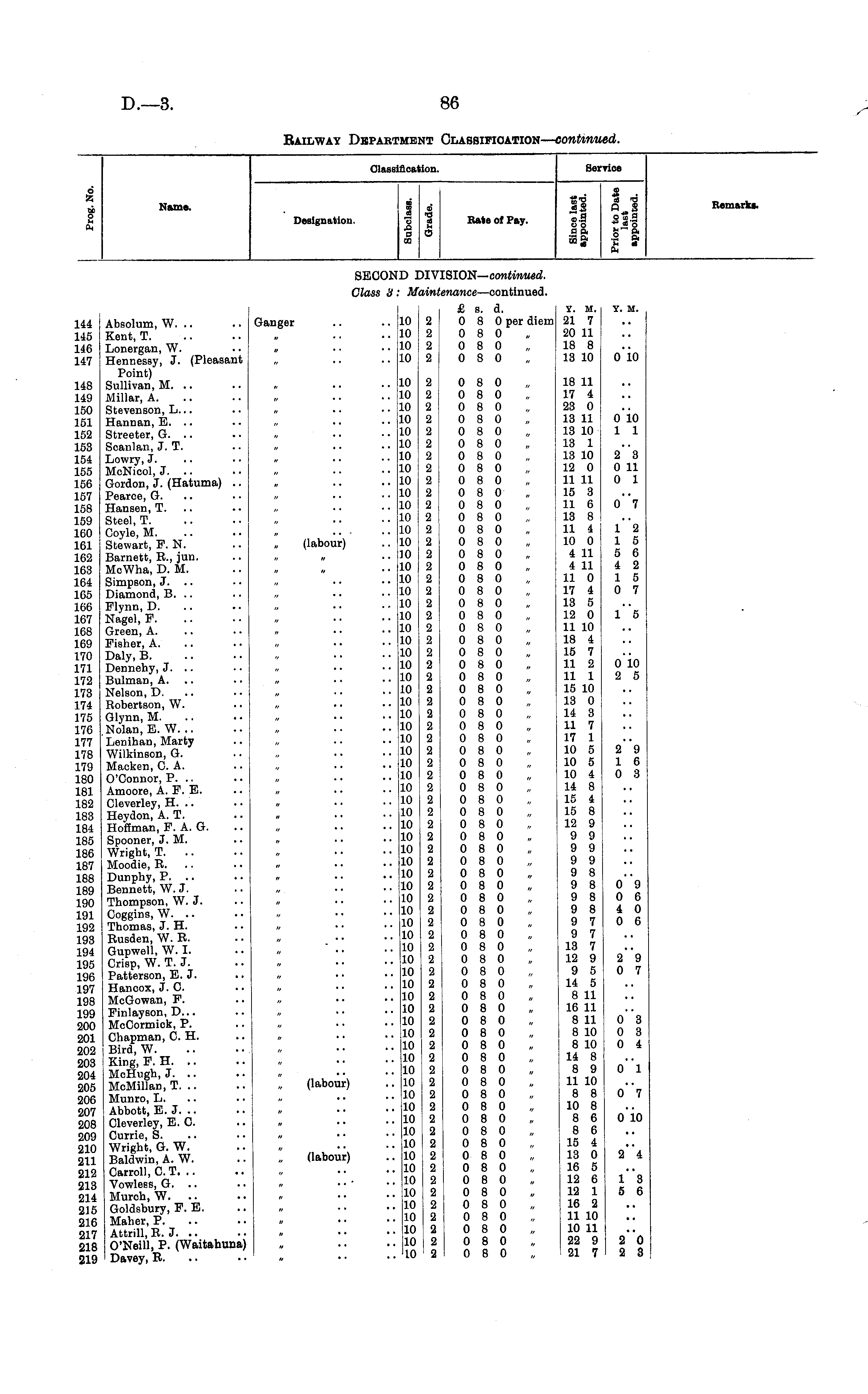 Classi lion. Service o X ob o U 3h Name. Designation. en co 3 -co rd 3 CO CO toed u 53 Rate of Pay. CD ■gti d tj *2 0 2 "3 03.2 co o . j* o a a g a as I 9 Ph Remarks. SEGON >IV[ ISION— continued. Class 3 : lint '.enance —continued. 144 145 146 147 Absolum, W. .. Kent, T. Lonergan, W. Hennessy, J. (Pleasant Point) Sullivan, M. .. Millar, A. Stevenson,L... Hannan, E. .. Streeter, G. .. Scanlan, J. T. Lowry, J. McNicol, J. .. Gordon, J. (Hatuma) .. Pearce, G. Hansen, T. .. Steel, T. Coyle, M. Stewart, F. N. Barnett, R., jun. McWha, D. M. Simpson, J. .. Diamond, B. .. Flynn, D. Nagel, P. Green, A. Fisher, A. Daly, B. Dennehy, J. .. Bulman, A. Nelson, D. Robertson, W. Glynn, M. .Nolan, E. W. .. Lenihan, Marty Wilkinson, G. Macken, C A. O'Connor, P. .. Amoore, A. F. E. Cleverley, H. .. Heydon, A. T. Hoffman, F. A. G. Spooner, J. M. Wright, T. .. Moodie, R. .. Dunphy, P. .. Bennett, W. J. Thompson, W. J. Coggins, W. .. Thomas, J. H. Rusden, W. R. Gupwell, W. I. Crisp, W.T.J. Patterson, E. J. Hancox, J. 0. McGowan, F. Finlayson,D... McCormick, P. Chapman, 0. H. Bird, W. King, P. H. .. McHugh, J. .. McMillan, T. .. Munro, L. Abbott, E. J. .. Cleverley, E. O. Currie, S. Wright, G. W. Baldwin, A. W. Carroll, CT. .. Vowless, G. .. Murch, W. Goldsbury, F. E. Maher, P. Attrill, R.J... O'Neill, P. (Waitahuna) Davey, R. Ganger 10 10 10 10 2 2 2 2 £ s. d. 0 8 0 per diem 0 8 0 0 8 0 0 8 0 Y. M. 21 7 20 11 18 8 13 10 Y. M. o'io 148 149 150 151 152 153 154 155 156 157 158 159 160 161 162 163 164 165 166 167 168 169 170 171 172 173 174 175 176 177 178 179 180 181 182 183 184 185 186 187 188 189 190 191 192 193 194 195 196 197 198 199 200 201 202 203 204 205 206 207 208 209 210 211 212 213 214 215 216 217 218 219 (labour) 10 10 10 10 10 10 10 10 10 10 10 10 10 10 10 10 10 10 10 10 10 10 10 10 10 10 10 10 10 10 10 10 10 10 10 10 10 10 10 10 10 10 10 10 10 10 10 10 10 10 10 10 10 10 10 10 10 10 10 10 10 10 10 10 10 10 10 10 10 10 10 10 2 2 2 2 2 2 2 2 2 2 2 2 2 3 2 2 2 2 2 2 3 2 2 2 2 2 2 2 2 2 2 2 2 2 2 2 2 2 2 2 2 2 2 2 2 2 2 2 2 2 2 2 3 2 2 2 3 2 2 2 2 3 2 2 2 2 2 2 2 2 2 2 0 8 0 0 8 0 0 8 0 0 8 0 0 8 0 0 8 0 0 8 0 0 8 0 0 8 0 0 8 0 0 8 0 0 8 0 0 8 0 0 8 0 0 8 0 0 8 0 0 8 0 0 8 0 0 8 0 0 8 0 0 8 0 0 8 0 0 8 0 0 8 0 0 8 0 0 8 0 0 8 0 0 8 0 0 8 0 0 8 0 0 8 0 0 8 0 0 8 0 0 8 0 0 8 0 0 8 0 0 8 0 0 8 0 0 8 0 0 8 0 0 8 0 0 8 0 0 8 0 0 8 0 0 8 0 0 8 0 0 8 0 0 8 0 0 8 0 0 8 0 0 8 0 0 8 0 0 8 0 0 8 0 0 8 0 0 8 0 0 8 0 0 8 0 0 8 0 0 8 0 0 8 0 0 8 0 0 8 0 0 8 0 0 8 0 0 8 0 0 8 0 0 8 0 0 8 0 0 8 0 0 8 0 0 8 0 18 11 17 4 23 0 13 11 13 10 13 1 13 10 12 0 11 11 15 3 11 6 13 8 11 4 10 0 4 11 4 11 11 0 17 4 13 5 12 0 11 10 18 4 15 7 11 2 11 1 15 10 13 0 14 3 11 7 17 1 10 5 10 5 10 4 14 8 15 4 15 8 12 9 9 9 9 9 9 9 9 8 9 8 9 8 9 8 9 7 9 7 13 7 12 9 9 5 14 5 8 11 16 11 8 11 8 10 8 10 14 8 8 9 11 10 8 8 10 8 8 6 8 6 15 4 13 0 16 5 12 6 12 1 16 2 11 10 10 11 22 9 21 7 o'io 1 1 2 3 0 11 0 1 o"7 1 2 1 5 5 6 4 2 1 5 0 7 1 '5 o'io 2 5 2 9 1 6 0 3 0 9 0 6 4 0 0 6 2"9 0 7 0 3 0 3 0 4 0 "l (labour) o"7 0 io (labour) 2*'4 1 "3 5 6 2 "0 2 3