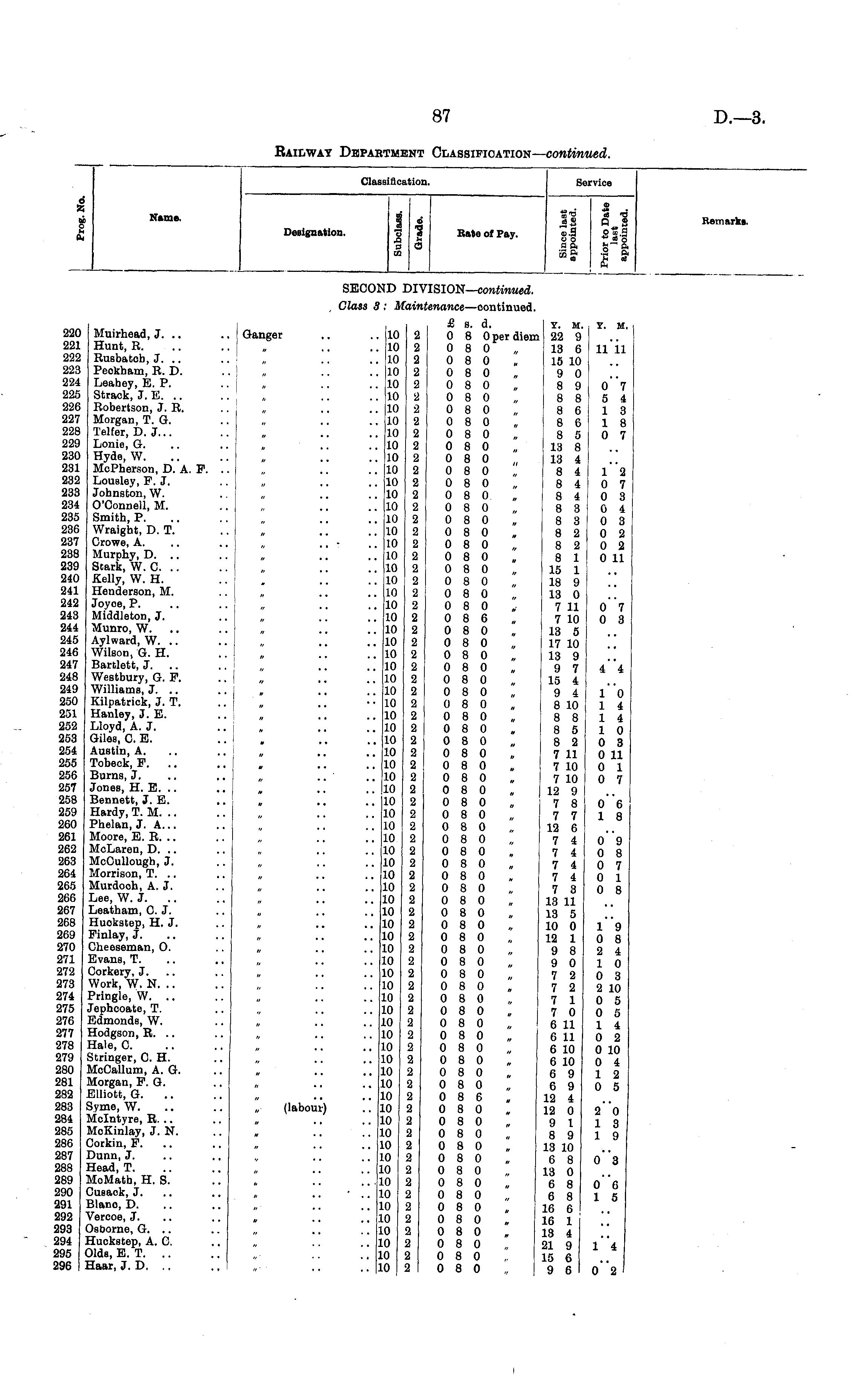 Classificai lion. Service d X A s Ph Name. 03 W 3 a cfl 9 E 0 CD ■£-3 "3 -rj «S 0 2 co.g o».a CO o cd o s a J; -1 a a a .3 a "' a n cd Ph Remarks. Designation. Bate of Pay. SECOi \D I >Iv [SION— continued. Class 3 .- Mc Am '.nance —continued. 220 221 222 223 224 225 226 227 228 229 230 231 232 233 234 235 236 237 238 239 240 241 242 243 244 245 246 247 248 249 250 251 252 253 254 255 256 257 258 259 260 261 262 263 264 265 266 267 268 269 270 271 272 273 274 275 276 277 278 279 280 281 282 283 284 285 286 287 288 289 290 291 292 293 294 295 296 I Muirhead, J. .. Hunt, R. Rusbatcb, J. .. Peckham, R. D. Leahey, E. P. Strack, J. E. .. Robertson, J. R. Morgan, T. G. Telfer, D.J... Lonie, G. Hyde, W. McPherson, D. A. F. Lousley, F. 3. Johnston, W. O'Connell, M. Smith, P. Wraight, D. T. Crowe, A. Murphy, D. .. Stark, W. 0. .. Kelly, W. H. Henderson, M. Joyoe, P. Middleton, J. Munro, W. .. Aylward, W. .. Wilson, G. H. Bartlett, J. .. Westbury, G. F. Williams, J. .. Kilpatrick, J. T. Hanley, J. E. Lloyd, A. J. Giles, CE. Austin, A. Tobeck, F. .. Burns, J. Jones, H. E. .. Bennett, J. E. Hardy, T. M. .. Phelan, J. A... Moore, E. R. .. McLaren, D. .. McCullough, J. Morrison, T. .. Murdoch, A. J. Lee, W. J. .. Leatham, 0. J. Huckstep, H. J. Pinlay, J. Cheeseman, O. Evans, T. Corkery, J. Work, W. N. .. Pringle, W. .. Jephcoate, T. Edmonds, W. Hodgson, R. .. Hale, C. Stringer, C. H. McCallum, A. G. Morgan, F. G. Elliott, G. Syme, W. Mclntyre, R. .. MoKinlay, J. N. Corkin, F. Dunn, J. Head, T. McMath, H. S. Cusaok, J. Blano, D. Vercoe, J. Osborne, G. .. Huckstep, A. G. Olds, E. T. .. Haar, J. D. ., Ganger . 10 . 10 . 10 . 10 . 10 . 10 . 10 . 10 . 10 . 10 . 10 , 10 . 10 . 10 , 10 . 10 , 10 , 10 , 10 , 10 , 10 , 10 , 10 10 10 10 10 10 10 10 10 10 10 10 10 10 10 10 10 10 10 10 10 10 10 10 10 10 10 10 10 10 10 10 10 10 10 10 10 10 10 10 10 10 10 10 10 10 10 10 10 10 10 10 10 10 |io 2 2 2 2 2 2 2 2 2 2 2 2 2 2 2 2 2 2 2 2 2 2 2 2 2 2 2 2 2 2 2 2 2 2 2 2 2 2 2 2 2 2 2 2 2 2 2 2 2 2 2 2 2 2 2 2 2 2 2 2 2 2 2 2 2 2 2 2 2 2 2 2 2 2 2 2 2 £ s. d. 0 8 0 per diem 0 8 0 0 8 0 0 8 0 0 8 0 0 8 0 0 8 0 0 8 0 0 8 0 0 8 0 0 8 0 0 8 0 0 8 0 0 8 0 0 8 0 0 8 0 0 8 0 . 0 8 0 0 8 0 0 8 0 0 8 0 0 8 0 0 8 0 0 8 6 0 8 0 0 8 0 0 8 0 0 8 0 0 8 0 0 8 0 0 8 0 0 8 0 0 8 0 0 8 0 0 8 0 0 8 0 0 8 0 „ 0 8 0 . 0 8 0 0 8 0 0 8 0 0 8 0 0 8 0 0 8 0 0 8 0 0 8 0 0 8 0 0 8 0 0 8 0 0 8 0 0 8 0 0 8 0 0 8 0 0 8 0 0 8 0 0 8 0 0 8 0 0 8 0 0 8 0 0 8 0 0 8 0 0 8 0 0 8 6 0 8 0 0 8 0 0 8 0 0 8 0 0 8 0 0 8 0 0 8 0 0 8 0 0 8 0 0 8 0 0 8 0 „ 0 8 0 0 8 0 0 8 0 Y. M. 22 9 13 6 15 10 9 0 8 9 8 8 8 6 8 6 8 5 13 8 13 4 8 4 8 4 8 4 8 3 8 3 8 2 8 2 8 1 15 1 18 9 13 0 7 11 7 10 13 5 17 10 13 9 9 7 15 4 9 4 8 10 8 8 8 5 8 2 7 11 7 10 7 10 12 9 7 8 7 7 12 6 7 4 7 4 7 4 7 4 7 3 13 11 13 5 10 0 12 1 9 8 9 0 7 2 7 2 7 1 7 0 6 11 6 11 6 10 6 10 6 9 6 9 12 4 12 0 9 1 8 9 13 10 6 8 13 0 6 8 6 8 16 6 I 16 1 13 4 21 9 15 6 9 6 Y. M. nil 0 7 5 4 1 3 1 8 0 7 1 2 0 7 0 3 0 4 0 3 0 2 0 2 0 11 o"7 0 3 4*4 1 0 1 4 1 4 1 0 0 3 0 11 0 1 0 7 o"6 1 8 w 0 9 0 8 0 7 0 1 0 8 1 9 0 8 2 4 1 0 0 3 2 10 0 5 0 5 1 4 0 2 0 10 0 4 1 2 0 5 "„ I (labour) 2 0 1 3 1 9 .. : .. ] 0"3 .. I .. ] 0 "o 1 5 ...1 • . i .. J .. 1 .. 1 .. 1 1**4 .. 1 .. 1 .. 1