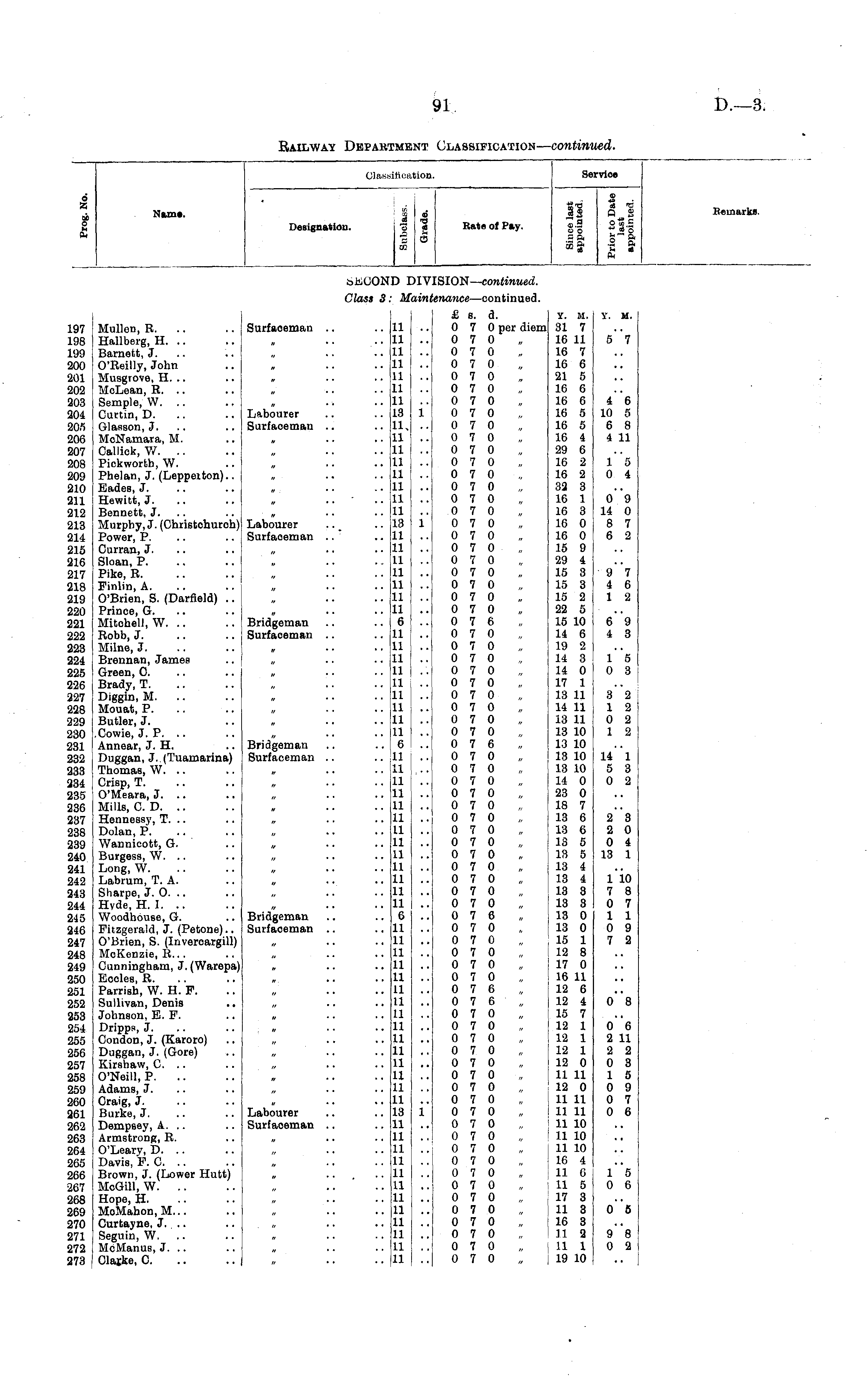 Classificai lion. Service 6 X A o -. P. Name. Designation. ■J 1 « j: CD toed 53 Rate of Pay. CO .9 05 O 3 a S3 9 CD "5 ti O 2 o« £ h-* ed o r. —• Q. .2 a rH Remarks. toniUON: 'IV ISION— continued. Class 3: tint tenance —continued. .97 .98 .99 101 102 103 !04 J05 106 107 0O8 109 110 ill 112 113 114 .15 116 117 118 119 !20 !21 i22 123 124 125 !26 !27 128 !29 !30 181 132 133 134 135 13G 137 138 189 140 141 142 143 144 145 14G 147 148 149 150 151 152 153 154 155 156 157 158 159 100 161 162 163 164 1G5 1G6 !G7 168 169 170 171 172 178 Mullen, R. Hallberg, H. .. Barnett, J. O'Reilly, John Musgrove, H. .. McLean, R. .. Semple, W. Curtin, D. Glasson, J. McNamara, M. Callick, W. .. Pickworth, W. Phelan, J. (Leppeiton).. Eades, J. Hewitt, J. Bennett, J. Murphy, J. (Christchuroh) Power, P. Curran, J. Sloan, P. Pike, R. Finlin, A. O'Brien, S. (Darfield) .. Prince, G. Mitchell, W. .. Robb, J. Milne, J. Brennan, James Green, 0. Brady, T. Diggin, M. Mouat, P. Butler, J. Cowie, J. P. .. Annear, J. H. Duggan, J. (Tuamarina) Thomas, W. .. Crisp, T. O'Meara, J. .. Mills, 0. D. .. Hennessy, T. .. Dolan, P. Wannicott, G. Burgess, W. Long, W. Labrum, T. A. Sharpe, J. O. .. Hyde, HI. .. Woodhouse, G. Fitzgerald, J. (Petone).. O'Brien, S. (Invercargill) McKenzie, R... Cunningham, J.(Warepa) Eccles, R. Parrish, W. H. F. Sullivan, Denis Johnson, E. F. Dripps, J. Condon, J. (Karoro) Duggan, J. (Gore) Kirshaw, C .. O'Neill, P. Adams, J. Craig, J. Burke, J. Dempsey, A. .. Armstrong, R. O'Leary, D. .. Davis, F. 0. .. Brown, J. (Lower Hutt) McGill, W. .. Hope, H. MoMahon, M... Curtayne, J. .. Seguin, W. .. McManus, J. .. Clarke, 0. Surfaoeman .. Labourer Surfaoeman .. Labourer Surfaoeman .. Bridgeman Surfaceman .. Bridgeman Surfaceman .. i 1 £ s. d. 0 7 0 per diem 0 7 0 0 7 0 0 7 0 0 7 0 0 7 0 0 7 0 0 7 0 0 7 0 0 7 0 0 7 0 0 7 0 0 7 0 0 7 0 0 7 0 0 7 0 0 7 0 0 7 0 0 7 0 0 7 0 0 7 0 0 7 0 0 7 0 0 7 0 0 7 6 0 7 0 0 7 0 0 7 0 0 7 0 0 7 0 0 7 0 0 7 0 0 7 0 0 7 0 0 7 6 0 7 0 0 7 0 0 7 0 0 7 0 0 7 0 0 7 0 0 7 0 0 7 0 0 7 0 0 7 0 0 7 0 0 7 0 0 7 0 0 7 6 0 7 0 0 7 0 0 7 0 0 7 0 0 7 0 0 7 6 0 7 6,, 0 7 0 0 7 0 0 7 0 0 7 0 0 7 0 0 7 0 0 7 0 0 7 0 0 7 0 0 7 0 0 7 0 0 7 0 0 7 0 0 7 0 0 7 0 0 7 0 0 7 0 0 7 0 0 7 0 0 7 0 0 7 0 Y. M. 31 7 16 11 16 7 16 6 21 5 16 6 16 6 16 5 16 5 16 4 29 6 16 2 16 2 32 3 16 1 16 3 16 0 16 0 15 9 29 4 15 3 15 3 15 2 22 5 15 10 14 6 19 2 14 3 14 0 17 1 13 11 14 11 13 11 13 10 13 10 13 10 13 10 14 0 23 0 18 7 13 6 13 6 13 5 13 5 13 4 13 4 13 3 13 3 13 0 13 0 15 1 12 8 17 0 16 11 12 6 12 4 15 7 12 1 12 1 12 1 12 0 11 11 12 0 11 11 11 11 11 10 11 10 11 10 16 4 11 6 11 5 17 3 11 3 16 3 11 2 11 1 19 10 Y. M. 5 '7 4 6 10 5 6 8 4 11 15 0 4 0 9 14 0 8 7 6 2 9 7 4 6 1 2 6 "9 4 3 1 "5 0 3 3 2 1 2 0 2 1 2 14 1 5 3 0 2 2 3 2 0 0 4 13 1 Bridgeman Surfaceman .. 1 10 7 8 0 7 1 1 0 9 7 2 0 "s 0 6 2 11 2 2 0 3 1 5 0 9 0 7 0 6 Labourer Surfaoeman .. 1 "5 0 6 0 "5 9"e 0 2