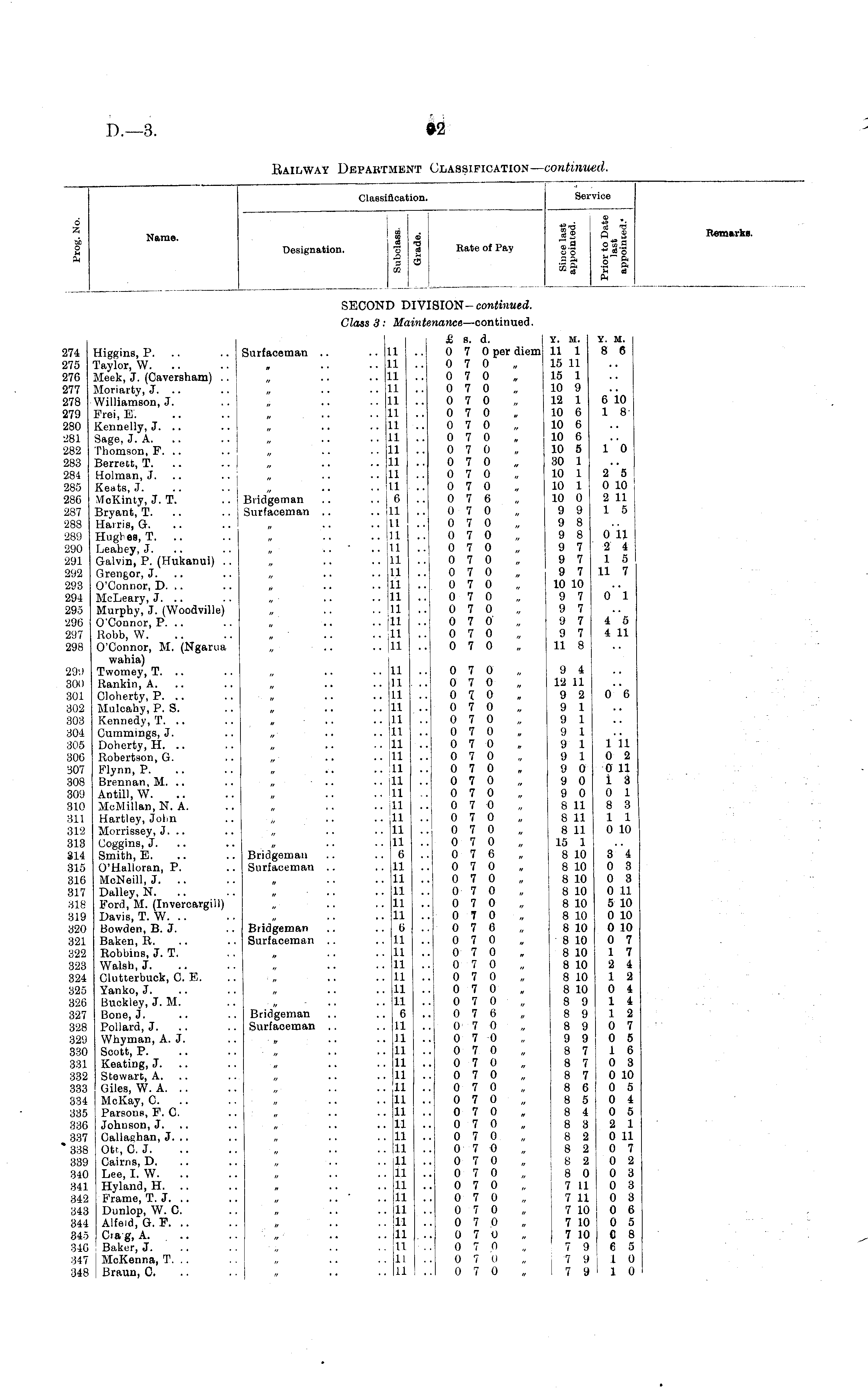 Service Classification. ob Name. o H 6 Z oc 5 r, Designation. CO CD ID « t, 1 J CO Rate of Pay co m-3 ed t3 32 0 2 la $13 rSS i cd * ed Ph Remarks. SECON1 >1\ [SION- continued. 74 Higgins, P. .. .. S 75 Taylor, W. 76 Meek, J. (Caversham) .. 77 Moriarty, J. .. 78 Williamson, J. 79 Prei, E. 80 Kennelly, J. .. 81 Sage. J. A. 82 Thomson, F. .. 83 Berrett, T. 84 Holman, J. 85 Keats, J. 86 McKinty, J. T. .. 1 87 Bryant, T. .. ..IS 88 Harris, G. .. .. 1 189 Hughes, T. .. 190 Leahey, J. 191 Galvin, P. (Hukanui) .. 192 Grengor, J. .. !93 O'Connor, D. .. 194 McLeary, J. .. 195 Murphy, J. (Woodville) 190 O'Connor, P. .. 197 Robb, W. 198 O'Connor, M. (Ngarua wahia) 199 Twomey, T. .. 100 Rankin, A. 301 Oloherty, P. .. J02 Mulcahy, P. S. 103 Kennedy, T. .. 104 Cummings, J. 305 Doherty, H. .. JOG Robertson, G. 107 BTynn, P. 308 Brennan, M. .. 309 An till, W. 310 McMillan, N. A. 311 Hartley, John 312 Morrissey, J. .. 313 Coggins, J. 2.14 Smith, E. .. .. . 315 O'Halloran, P. [316 McNeill, J. .. 317 Dalley, N. 318 Ford, M. (Invercargill) 319 Davis, T. W. .. 320 Bowden, B. J. 321 Baken, R. 822 Robbins, J. T. 323 Walsh, J. 324 Clutterbuck, CE, 325 Yanko, J. 326 Buckley, J. M. 327 Bone, J. 328 Pollard, J. 323 Whyman, A. J. 330 Scott, P. 331 Keating, J. .. 332 Stewart, A. .. 333 Giles, W. A. .. 334 I McKay, 0. 335 I Parsous, F. 0. 336 I Johnson, J. 337 Callashan, J. .. 338 Ott, C. J. 339 Cairns, D. 340 Lee, I. W. 341 Hyland, H. .. 342 Frame, T. J. .. 343 Dunlop, W. 0. 344 Alfeid, G. F. .. 345 Cta g, A. 34G Baker, J. 347 I McKenna, T. .. 348 ! Braun, 0. .. . • I Class 3: tin '.nance —continued. 274 275 276 277 278 279 280 281 282 283 284 285 286 287 288 28; i 290 291 292 293 294 295 290 297 298 Surfaceman .. .. [ ■ : Bridgeman Surfaceman .. 11 11 11 11 11 11 11 11 11 11 11 11 6 11 11 11 11 11 11 11 11 11 11 11 11 £ 8. d. 0 7 0 per diem 0 7 0 0 7 0 0 7 0 0 7 0 0 7 0 0 7 0 0 7 0 0 7 0 0 7 0 0 7 0 0 7 0 0 7 6 0 7 0 0 7 0 0 7 0 0 7 0 0 7 0 0 7 0 0 7 0 0 7 0 0 7 0 0 7 0 0 7 0 0 7 0 Y. M. 11 1 15 11 15 1 10 9 12 1 10 6 10 6 10 6 10 5 30 1 10 1 10 1 10 0 9 9 9 8 9 8 9 7 9 7 9 7 10 10 9 7 9 7 9 7 9 7 11 8 Y. M. 8 6 6 io 1 8 1 0 2 5 0 10 2 11 1 5 0 11 2 4 1 5 11 7 0 "l 4 5 4 11 29-.) 300 301 302 303 304 305 306 307 308 309 310 311 312 313 314 315 310 317 318 319 320 321 322 323 324 325 326 327 328 329 330 331 332 333 334 335 886 337 838 339 340 341 342 343 344 345 34G 347 348 Bridgeman Surfaceman Bridgeman Surfaceman 11 11 11 11 11 11 11 11 11 11 11 11 11 11 11 6 11 11 11 11 11 6 11 11 11 11 11 11 6 11 11 11 11 11 11 11 , 11 , 11 . 11 . 11 . 11 , 11 . 11 . 11 . 11 . 11 . 11 . 11 . 11 , 11 0 7 0 0 7 0 0 7 0 0 7 0 0 7 0 0 7 0 0 7 0 0 7 0 0 7 0 0 7 0 0 7 0 0 7 0 0 7 0 0 7 0 0 7 0 0 7 6 0 7 0 0 7 0 0 7 0 0 7 0 0 7 0 0 7 6 0 7 0 0 7 0 0 7 0 0 7 0 0 7 0 0 7 0 0 7 0 0 7 0 0 7 0 0 7 0 0 7 0 0 7 0 0 7 0 0 7 0 0 7 0 0 7 0 0 7 0 0 7 0 0 7 0 0 7 0 0 7 0 0 7 0 0 7 0 0 7 0 0 7 0 0 7 0 0 7 0 0 7 0 9 4 12 11 9 2 9 1 9 1 9 1 9 1 9 1 9 0 9 0 9 0 8 11 8 11 8 11 15 1 8 10 8 10 8 10 : 8 10 8 10 8 10 8 10 8 10 8 10 8 10 8 10 8 10 8 9 8 9 8 9 9 9 8 7 8 7 8 7 8 6 8 5 8 4 8 3 8 2 8 2 8 2 8 0 7 11 7 11 7 10 7 10 7 10 ! 7 9 ■7 9 i 7 9 0 "6 1 11 0 2 0 11 1 3 0 1 8 3 1 1 0 10 3 4 0 3 0 3 0 11 5 10 0 10 0 10 0 7 1 7 2 4 1 2 0 4 1 4 1 2 0 7 0 5 1 6 0 3 0 10 0 5 0 4 0 5 2 1 0 11 0 7 0 2 0 3 0 3 0 3 0 6 ; 0 5 C 8 6 5 1 0 1 0 Bridgeman Surfaceman ..