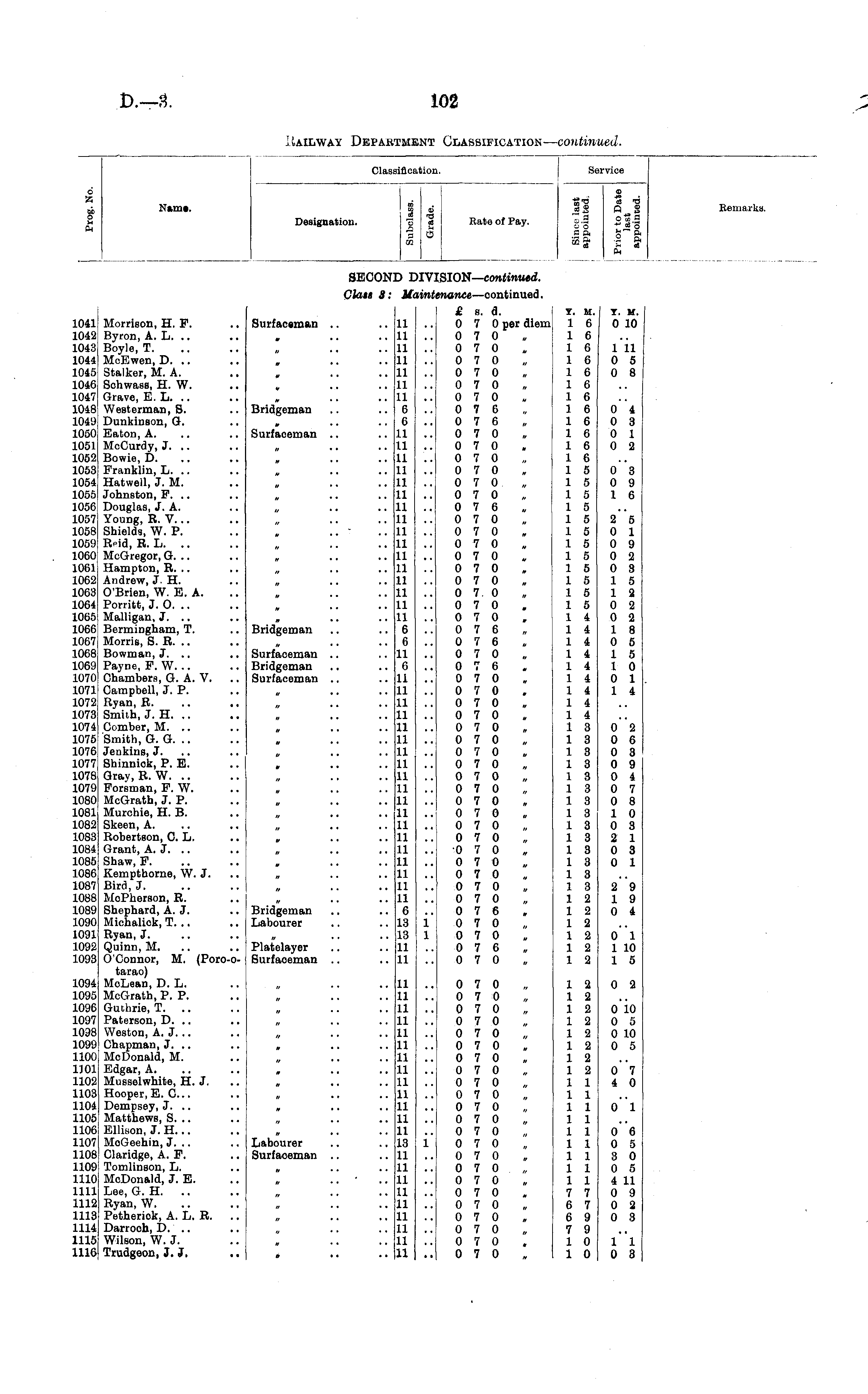 Classificai lion. Service 6 X oil o G P. Name. Designation. CO I rl "co r2 CO co" tJ cd 3 Rate of Pay. CO H?rrj ed t3 JS Q g a p, g ft at I 9 P. Remarks, SECON [SION— continued. Class 3: '.nance —oontinued. Y. M. I Y. M. 16 0 10 16 16 1 11 16 0 5 16 0 8 16 16 16 0 4 16 0 3 16 0 1 16 0 2 1 6 15 0 3 15 0 9 15 16 15 15 2 5 15 0 1 15 0 9 15 0 2 15 0 3 15 15 15 12 15 0 2 14 0 2 14 18 14 0 5 14 15 14 10 14 0 1 14 14 14 14 13 0 2 13 0 6 13 0 3 13 0 9 13 0 4 13 0 7 13 0 8 13 10 13 0 3 13 2 1 13 0 3 13 0 1 13 13 2 9 12 19 12 0 4 1 2 12 0 1 12 1 10 12 15 .041 [042 .043 .044 .045 .046 ,047 [048 [049 [050 :051 [052 .053 .054 .055 .056 .057 .058 .059 .060 .061 .002 .063 .064 .065 .066 .067 .068 .069 [070 [071 [072 .073 .074 l075 [076 .077 [078 [079 [080 .081 .082 [083 [084 [085 [086 c087 [088 [089 L090 1091 L092 [093 Morrison, H. F. Byron, A. L. .. Boyle, T. McEwen, D. .. Stalker, M. A. Schwass, H. W. Grave, E. L. .. Westerman, S. Dunkinson, G. Eaton, A. McCurdy, J. .. Bowie, D. Franklin, L. .. Hatwell, J. M. Johnston, F. .. Douglas, J. A. Young, R. V... Shields, W. P. R-id, R. L. .. McGregor, G. .. Hampton, R. .. Andrew, J. H. O'Brien, W. E. A. Porritt, J. 0. .. Malligan, J. .. Bermingham, T. Morris, S. R. .. Bowman, J. .. Payne, P. W... Chambers, G. A. V. Campbell, J. P. Ryan, R. Smith, J. H. .. Comber, M. .. Smith, G. G. .. Jenkins, J. Shinniok, P. E. Gray, R. W. .. Forsman, F. W. McGrath, J. P. Murchie, H. B. Skeen, A. Robertson, 0. L. Grant, A. J. .. Shaw, F. Kempthorne, W. J. Bird, J. MoPherson, R. Shephard, A. J. Michaliok, T. .. Ryan, J. Quinn, M. O'Connor, M. (Poro-o-tarao) MoLean, D. L. McGrath, P.P. Guthrie, T. .. Paterson, D. .. Weston, A. J. .. Chapman, J. .. McDonald, M. Edgar, A. Musselwhite, H. J. Hooper, E. C... Dempsey, J. .. Matthews, S. .. Ellison, J. H... MoGeehin, J. .. Claridge, A. F. Tomlinson, L. McDonald, J. E. Lee, G. H. Ryan, W. Petheriok, A. L. R. Darrooh, D. .. Wilson, W. J. Trudgeon, J. J. Surfaceman 0 •. . • Bridgeman Surfaceman Bridgeman 11 11 11 11 11 11 11 G G 11 11 11 11 11 11 11 11 11 11 11 11 11 1.1 11 11 6 G 11 6 11 11 11 11 11 11 11 11 11 11 11 11 11 11 11 11 11 11 11 6 13 13 11 11 £ s. d. 0 7 0 per diem 0 7 0 0 7 0 . 0 7 0 0 7 0 0 7 0 0 7 0 0 7 6 0 7 6 0 7 0 0 7 0 0 7 0 0 7 0 0 7 0 0 7 0 0 7 6 0 7 0 0 7 0 0 7 0 0 7 0 0 7 0 0 7 0 0 7 0 0 7 0 0 7 0 0 7 6 0 7 6 0 7 0 0 7 6 0 7 0 0 7 0 0 7 0 . 0 7 0 0 7 0 0 7 0 0 7 0 0 7 0 0 7 0 0 7 0 0 7 0 0 7 0 „ 0 7 0 0 7 0 0 7 0 0 7 0 0 7 0 0 7 0 0 7 0 0 7 6 . 0 7 0 0 7 0 0 7 6 0 7 0 Surfaceman Bridgeman Surfaceman .. „ .. .« Bridgeman Labourer i l Platelayer Surfaceman L094 [095 [096 [097 [098 [099 L100 L101 L102 1103 L104 1105 L106 1107 1108 1109 1110 [111 1112 1113 [114 1115 ill6 a .. •. 11 11 11 11 11 11 11 11 11 11 11 11 11 13 11 11 11 11 11 11 11 11 11 0 7 0 0 7 0 0 7 0 0 7 0 0 7 0 0 7 0 . 0 7 0 0 7 0 0 7 0 0 7 0 0 7 0 0 7 0 0 7 0 0 7 0 0 7 0 0 7 0 0 7 0 0 7 0 0 7 0 0 7 0 0 7 0 0 7 0 0 7 0 . 12 0 2 12 12 0 10 12 0 5 12 0 10 12 0 5 12 12 0 7 11 4 0 11 11 0 1 11 11 0 6 11 0 5 11 3 0 11 0 5 11 4 11 7 7 0 9 6 7 0 2 6 9 0 3 7 9 10 11 10 0 3 Labourer Surfaoeman .. 0 .. ..