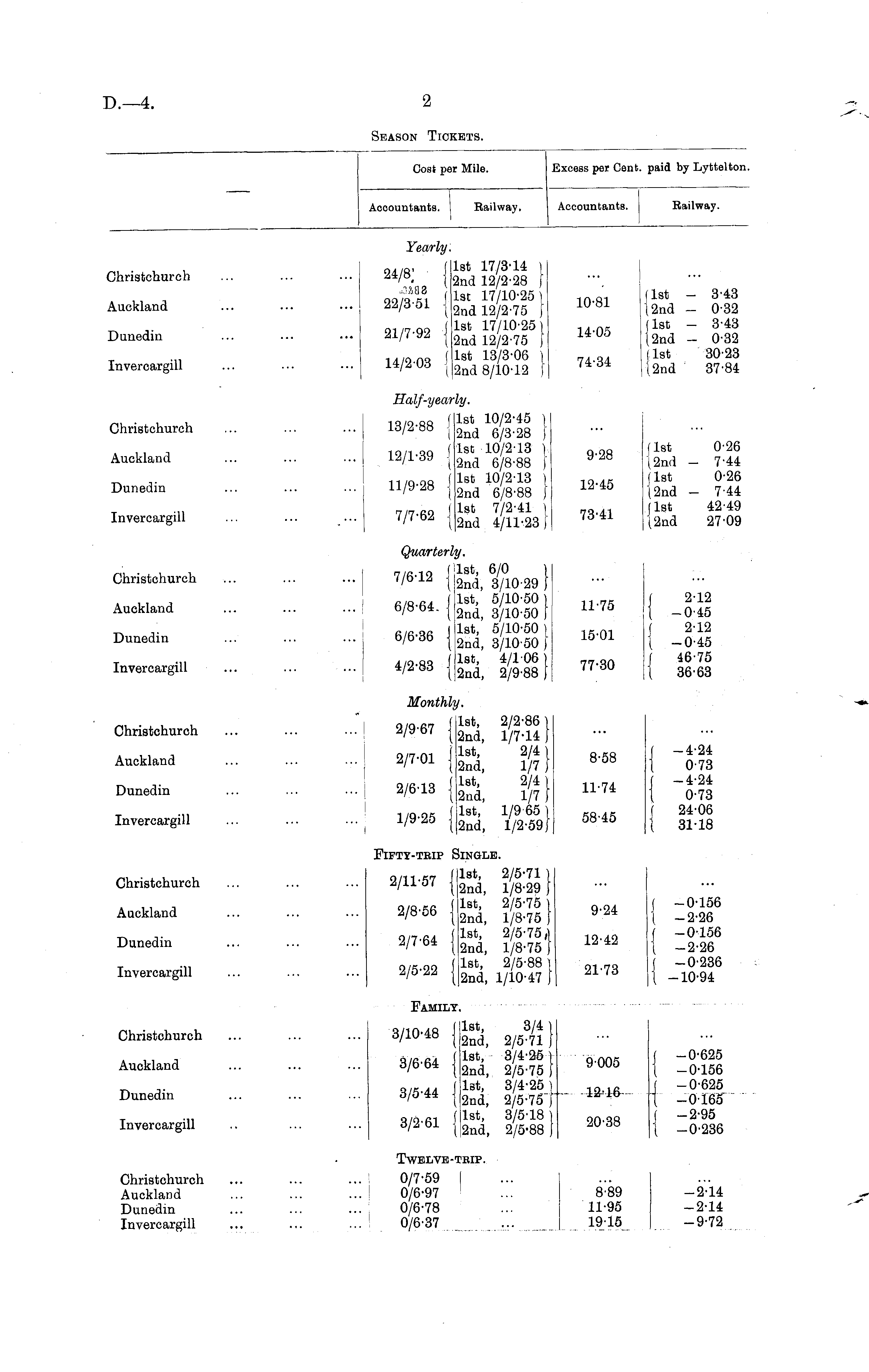 Cost per Mile. Excess per lent, paii Accountants. I Railway. Accountants. Railway. I Yearly. Christchurch Auckland Dunedin Invercargill /8 , fist 17/3-14 | M '°; { 2nd 12/2-28 f 22/3 51 i l8t 17 / 1(>25 l Ai l 6bl {2nd 12/2-75 f 91/7 .oo (1st 17/10-25) Ai l' yA \ 2nd 12/2-75 j 14/2-03 (l8t 13 / 3 " 06 \ l " A Ud i 2nd 8/10-12 f 10-81 14-05 f lst - 3-43 (2nd - 0-32 (lst - 3-43 (2nd - 0-32 f lst 30-23 (2nd 37-84 74-34 Christchurch Auckland Dunedin Invercargill Half-yearly. 13/2-88 ' lst 10 / 2 ' 45 I L6 I A m \ 2nd 6/3-28 ) 12/1 .o q fist 10/2-13 ) u l iaJ ( 2nd 6/8-88 J 11/9-28 (lst 10 / 2 ' 13 1 7/7-62 ( lst 7 / 2 ' 41 1 '1' bA I 2nd 4/11-23) 9-28 (lst 0-26 (2nd - 7-44 fist 0-26 12nd - 7-44 fist 42-49 (2nd 27-09 12-45 73-41 Quarterly. Christchurch Auckland Dunedin Invercargill 7/R-19 f, lst ' 6 /° I 7 / b 1A | 2nd, 3/10-29 J C/QC . f lst, 5/10-50) 6 / 8 ' 64 ' 1 2nd, 3/10-50 ( C/CQC i lst, 5/10-50 ) 6 / 6 ' 36 j 2nd, 3/10-50 | 4/ „. 8 o {1st, 4/106 | 4 / 283 12nd, 2/9-88) 11-75 15-01 ( 2-12 1 -0-45 ( 2-12 ( -0-45 f 46-75 1 36-63 77-30 Monthly. Christchurch Auckland Dunedin Invercargill 6 (1st, 2/2-86) 2 / 9b7 {2nd, 1/7-14) 8-58 11-74 ( -4-24 1 0-73 ( -4-24 1 0-73 ( 24-06 j 31-18 58-45 Christchurch Auckland Dunedin Invercargill Fifty-teip Single. 2/11 . 57 (1st, 2/5-71) 2 / 1157 {2nd, 1/8-29 J 2/8-56 l l8t ' 2 / 5 ' 75 } A ' b Sb j 2nd, 1/8-75 f ona . (lst, 2/5-75,.) 2 / 7 ' 64 j 2nd, 1/8-75 I 2/5-22 l l8t ' 2 / 5 ' 88 l A '° AA 1 2nd, 1/10-47 } 9-24 ( -0-156 ) -2-26 ( -0-156 1 -2-26 ( -0-236 | -10-94 12-42 21-73 Family. Christchurch Auckland Dunedin Invercargill 3/5-44 l lst ' 3 / 4 ' 25 -l d '° 44 j 2nd, 2/5-75 ) 3/2-61 i lst ' 3 / 5 ' 18 ! d ' Abi 12nd, 2/5-88) 9005 18-16 j -0-625 1 -0-156 ( -0-625 1 -0165" ( -2-95 1 -0-236 20-38 TWELVE-TEIP. 8-89 11-95 1915 Christchurch Auckland Dunedin Invercargill 0/7-59 I 0/6-97 0/6-78 0/6-37 -2-14 -2-14 -9-72