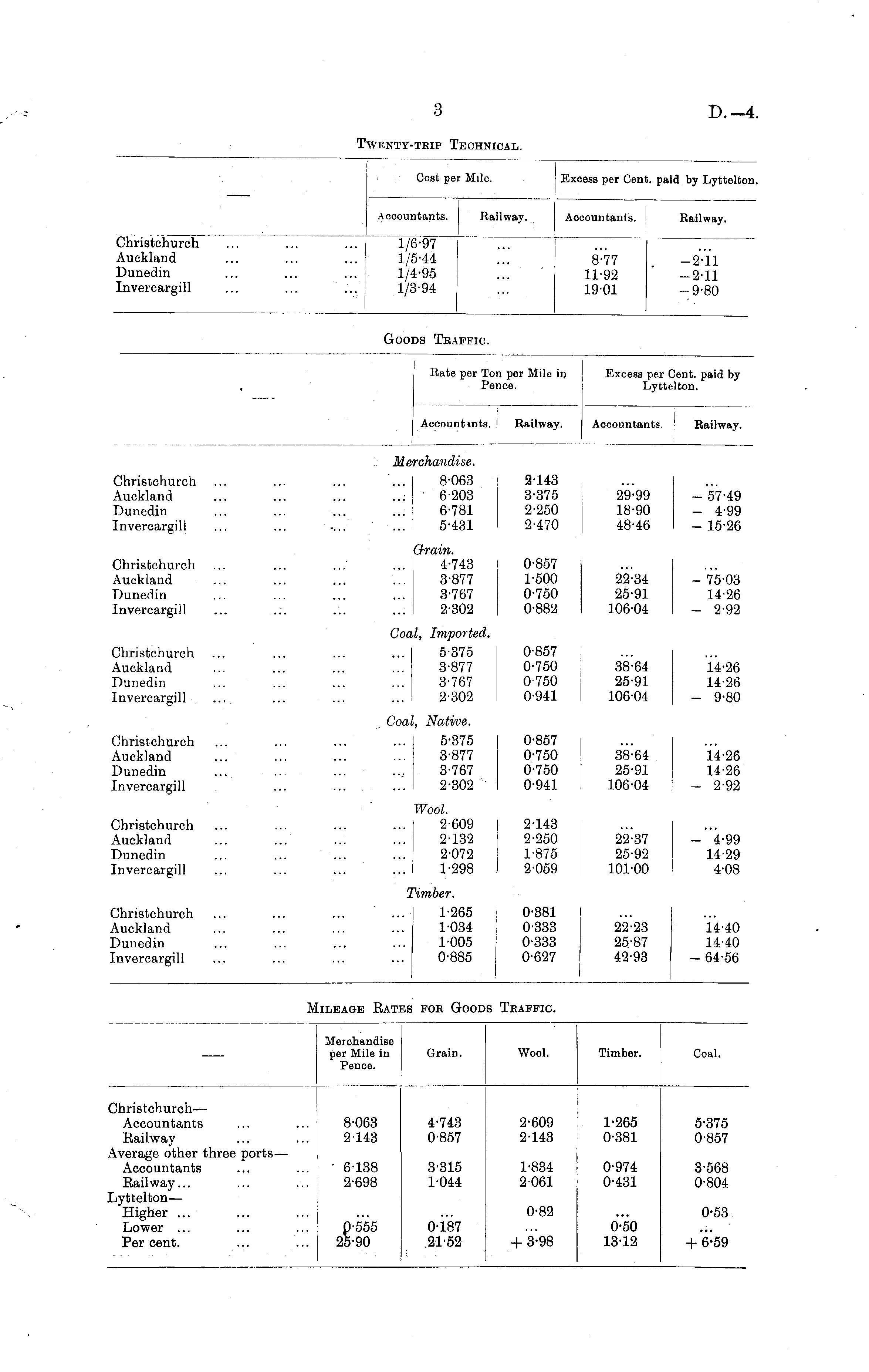 Rate per Ton per Mile in Pence. Account nits. Railway. i Excess per Cent, paid by Lyttelton. Accountants. Railway. Account mts. Accountants. Railway. Merchandise. Christchurch Auckland Dunedin Invercargill i 8-063 6-203 6-781 5-431 2-143 3-375 2-250 2-470 29-99 18-90 48-46 - 57-49 - 4-99 - 15-26 Christchurch Auckland Dunedin Invercargill i Grain. 4-743 3-877 3-767 2-302 0-857 1-500 0-750 0-882 22-34 25-91 106-04 - 75-03 14-26 - 2-92 Christchurch Auckland Dunedin Invercargill Coal, Imported. 5-375 3-877 3-767 2-302 0-857 0-750 0-750 0-941 38-64 25-91 106-04 14-26 14-26 - 9-80 Coal, Native. 0-857 0-750 0-750 0-941 38-64 25-91 106-04 Christchurch Auckland Dunedin Invercargill 5-375 3-877 3-767 2-302 14-26 14-26 - 2-92 Christchurch Auckland Dunedin Invercargill Wool. 2-609 2-132 2-072 1-298 2-143 2-250 1-875 2 059 22-37 25-92 101-00 - 4-99 14-29 4-08 Timber. 0-381 0-333 0-333 0-627 I 22-23 25-87 42-93 Christchurch Auckland Dunedin Invercargill 1-265 1034 1-005 0-885 14-40 14-40 - 64-56 I
