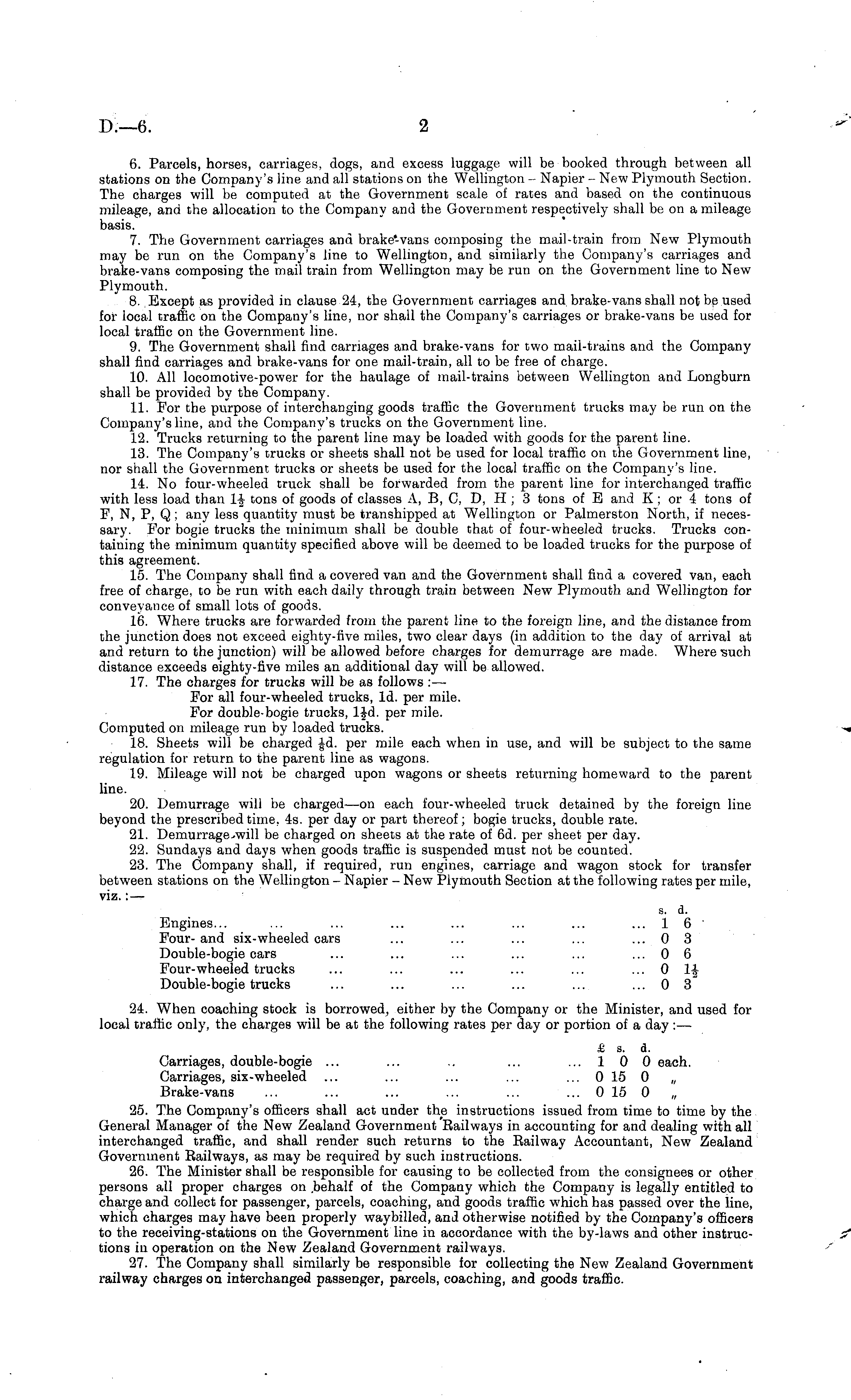6. Parcels, horses, carriages, dogs, and excess luggage will be booked through between all stations on the Company's line and all stations on the Wellington - Napier - New Plymouth Section. The charges will be computed at the Government scale of rates and based on the continuous mileage, and the allocation to the Company and the Government respectively shall be on a mileage basis. 7. The Government carriages and brake-vans composing the mail-train from New Plymouth may be run on the Company's line to Wellington, and similarly the Company's carriages and brake-vans composing the mail train from Wellington may be run on the Government line to New Plymouth. 8. Except as provided in clause 24, the Government carriages and brake-vans shall not be used for local traffic on the Company's line, nor shall the Company's carriages or brake-vans be used for local traffic on the Government line. 9. The Government shall find carriages and brake-vans for two mail-trains and the Company shall find carriages and brake-vans for one mail-train, all to be free of charge. 10. All locomotive-power for the haulage of mail-trains between Wellington and Longburn shall be provided by the Company. 11. For the purpose of interchanging goods traffic the Government trucks may be run on the Company's line, and the Company's trucks on the Government line. 12. Trucks returning to the parent line may be loaded with goods for the parent line. 13. The Company's trucks or sheets shall not be used for local traffic on the Government line, nor shall the Government trucks or sheets be used for the local traffic on the Company's line. 14. No four-wheeled truck shall be forwarded from the parent line for interchanged traffic with less load than tons of goods of classes A, B, C, D, H; 3 tons of B and X; or 4 tons of F, N, P, Q ; any less quantity must be transhipped at Wellington or Palmerston North, if necessary. For bogie trucks the minimum shall be double that of four-wheeled trucks. Trucks containing the minimum quantity specified above will be deemed to be loaded trucks for the purpose of this agreement. 15. The Company shall find a covered van and the Government shall find a covered van, each free of charge, to be run with each daily through train between New Plymouth and Wellington for conveyance of small lots of goods. 16. Where trucks are forwarded from the parent line to the foreign line, and the distance from the junction does not exceed eighty-five miles, two clear days (in addition to the day of arrival at and return to the junction) will be allowed before charges for demurrage are made. Where such distance exceeds eighty-five miles an additional day will be allowed. 17. The charges for trucks will be as follows : — For all four-wheeled trucks, Id. per mile. For double-bogie trucks, per mile. Computed on mileage run by loaded trucks. 18. Sheets will be charged per mile each when in use, and will be subject to the same regulation for return to the parent line as wagons. 19. Mileage will not be charged upon wagons or sheets returning homeward to the parent line. 20. Demurrage will be charged —on each four-wheeled truck detained by the foreign line beyond the prescribed time, 4s. per day or part thereof; bogie trucks, double rate. 21. Demurrage .-will be charged on sheets at the rate of 6d. per sheet per day. 22. Sundays and days when goods traffic is suspended must not be counted. 23. The Company shall, if required, run engines, carriage and wagon stock for transfer between stations on the Wellington - Napier - New Plymouth Section at the following rates per mile, viz.: — s. d. Engines... ... ... ... ... ... ... ... 1 6 Four- and six-wheeled cars ... ... ... ... ... 0 3 Double-bogie cars ... ... ... ... ... ... 0 6 Four-wheeled trucks ... ... ... ... ... ... 0 l^ Double-bogie trucks ... ... ... ... ... ... 0 3 24. When coaching stock is borrowed, either by the Company or the Minister, and used for local traffic only, the charges will be at the following rates per day or portion of a day : — £ s. d. Carriages, double-bogie ... ... .. ... ...100 each. Carriages, six-wheeled ... ... ... ... ... 015 0 „ Brake-vans ... ... ... ... ... ... 015 0 „ 25. The Company's officers shall act under the instructions issued from time to time by the General Manager of the New Zealand Government Eailways in accounting for and dealing with all interchanged traffic, and shall render such returns to the Eailway Accountant, New Zealand Government Eailways, as may be required by such instructions. 26. The Minister shall be responsible for causing to be collected from the consignees or other persons all proper charges on .behalf of the Company which the Company is legally entitled to charge and collect for passenger, parcels, coaching, and goods traffic which has passed over the line, which charges may have been properly waybilled, and otherwise notified by the Company's officers to the receiving-stations on the Government line in accordance with the by-laws and other instructions in operation on the New Zealand Government railways. 27. The Company shall similarly be responsible for collecting the New Zealand Government railway charges on interchanged passenger, parcels, coaching, and goods traffic.