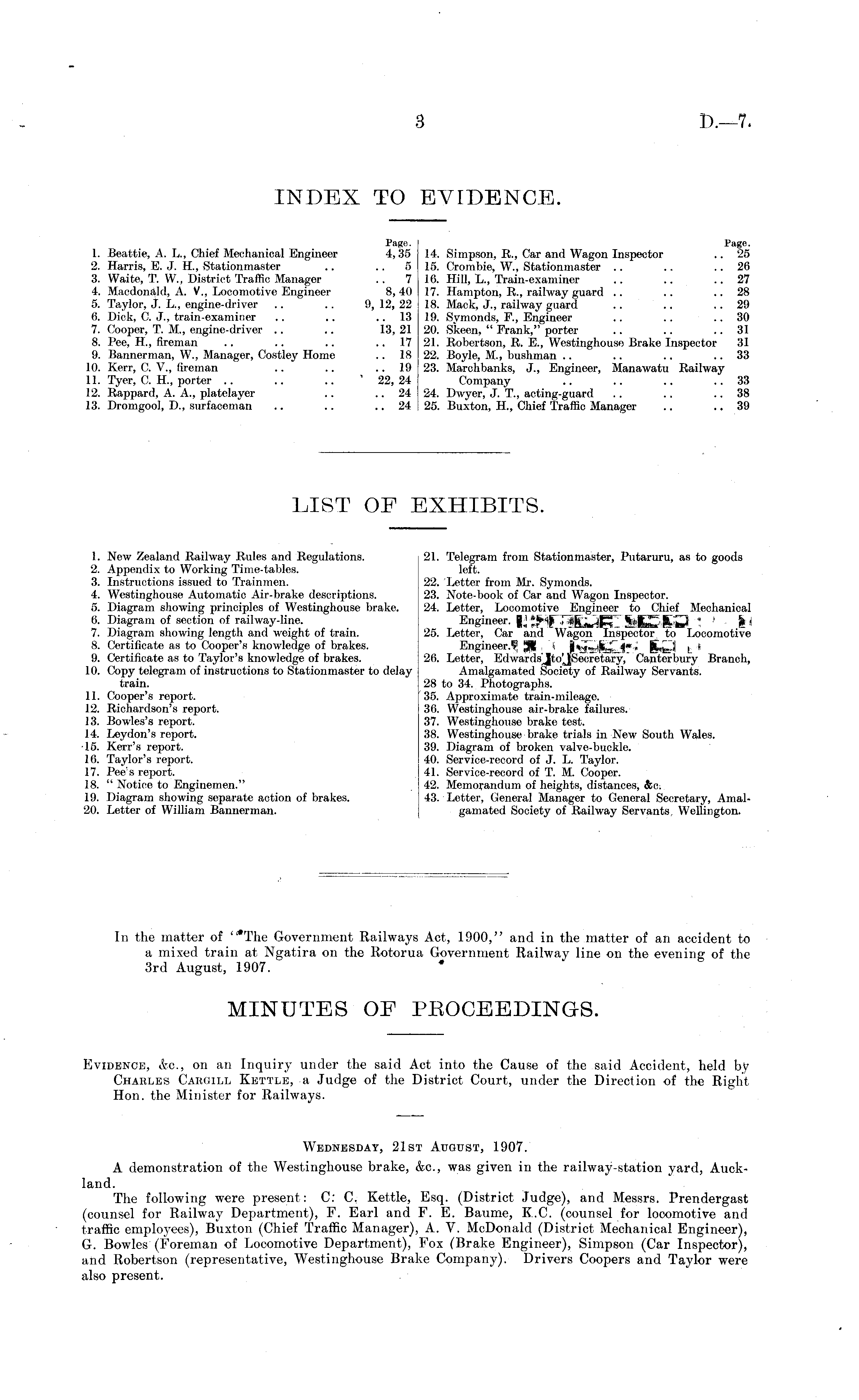 Wednesday, 21st August, 1907. A demonstration of the Westinghouse brake, &c, was given in the railway-station yard, Auckland. The following were present: C: C. Kettle, Esq. (District Judge), and Messrs. Prendergast (counsel for Railway Department), F. Earl and F. E. Baume, K.C. (counsel for locomotive and traffic employees), Buxton (Chief Traffic Manager), A. V. McDonald (District Mechanical Engineer), G. Bowles (Foreman of Locomotive Department), Fox (Brake Engineer), Simpson (Car Inspector), uiid Robertson (representative, Westinghouse Brake Company). Drivers Coopers and Taylor were also present.