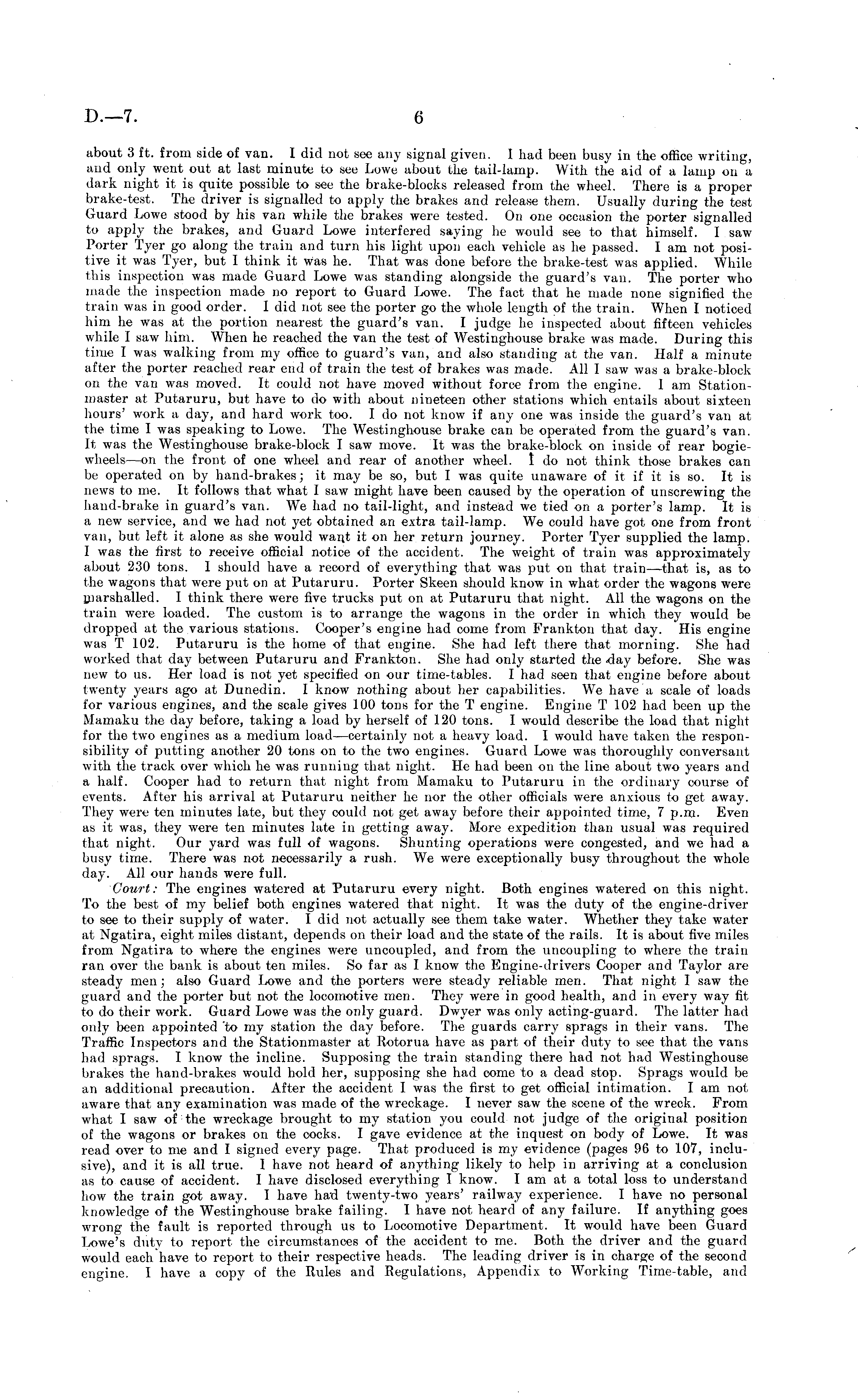 about 3 ft. from side of van. I did not see any signal given. I had been busy in the office writing, and only went out at last minute to see Lowe about the tail-lamp. With the aid of a lamp on a dark night it is quite possible to see the brake-blocks released from the wheel. There is a proper brake-test. The driver is signalled to apply the brakes and release them. Usually during the test Guard Lowe stood by his van while the brakes were tested. On one occasion the porter signalled to apply the brakes, and Guard Lowe interfered saying he would see to that himself. I saw Porter Tyer go along the train and turn his light upon each vehicle as he passed. lam not positive it was Tyer, but I think it was he. That was done before the brake-test was applied. While this inspection was made Guard Lowe was standing alongside the guard's van. The porter who made the inspection made no report to Guard Lowe. The fact that he made none signified the train was in good order. I did not see the porter go the whole length of the train. When I noticed him he was at the portion nearest the guard's van. I judge he inspected about fifteen vehicles while I saw him. When he reached the van the test of Westinghouse brake was made. During this time I was walking from my office to guard's van, and also standing at the van. Half a minute after the porter reached rear end of train the test of brakes was made. All I saw was a brake-block on the van was moved. It could not have moved without force from the engine. lam Stationmaster at Putaruru, but have to do with about nineteen other stations which entails about sixteen hours' work a day, and hard work too. Ido not know if any one was inside the guard's van at the time I was speaking to Lowe. The Westinghouse brake can be operated from the guard's van. It was the Westinghouse brake-block I saw move. It was the brake-block on inside of rear bogiewheels—on the front of one wheel and rear of another wheel. 1 do not think those brakes can be operated on by hand-brakes; it may be so, but I was quite unaware of it if it is so. It is news to me. It follows that what I saw might have been caused by the operation of unscrewing the hand-brake in guard's van. We had no tail-light, and instead we tied on a porter's lamp. It is a new service, and we had not yet obtained an extra tail-lamp. We could have got one from front van, but left it alone as she would want it on her return journey. Porter Tyer supplied the lamp. I was the first to receive official notice of the accident. The weight of train was approximately about 230 tons. I should have a record of everything that was put on that train—that is, as to the wagons that were put on at Putaruru. Porter Skeen should know in what order the wagons were marshalled. I think there were five trucks put on at Putaruru that night. All the wagons on the train were loaded. The custom is to arrange the wagons in the order in which they would be dropped at the various stations. Cooper's engine had come from Frankton that day. His engine was T 102. Putaruru is the home of that engine. She had left there that morning. She had worked that day between Putaruru and Frankton. She had only started the day before. She was new to us. Her load is not yet specified on our time-tables. I had seen that engine before about twenty years ago at Dunedin. I know nothing about her capabilities. We have a scale of loads for various engines, and the scale gives 100 tons for the T engine. Engine T 102 had been up the Mamaku the day before, taking a load by herself of 120 tons. I would describe the load that night for the two engines as a medium load —certainly not a heavy load. I would have taken the responsibility of putting another 20 tons on to the two engines. Guard Lowe was thoroughly conversant with the track over which he was running that night. He had been on the line about two years and a half. Cooper had to return that night from Mamaku to Putaruru in the ordinary course of events. After his arrival at Putaruru neither he nor the other officials were anxious to get away. They were ten minutes late, but they could not get away before their appointed time, 7 p.m. Even as it was, they were ten minutes late in getting away. More expedition than usual was required that night. Our yard was full of wagons. Shunting operations were congested, and we had a busy time. There was not necessarily a rush. We were exceptionally busy throughout the whole day. All our hands were full. Court: The engines watered at Putaruru every night. Both engines watered on this night. To the best of my belief both engines watered that night. It was the duty of the engine-driver to see to their supply of water. I did not actually see them take water. Whether they take water at Ngatira, eight miles distant, depends on their load and the state of the rails. It is about five miles from Ngatira to where the engines were uncoupled, and from the uncoupling to where the train ran over the bank is about ten miles. So far as I know the Engine-drivers Cooper and Taylor are steady men; also (luard Lowe and the porters were steady reliable men. That night I saw the guard and the porter but not the locomotive men. They were in good health, and in every way fit to do their work. Guard Lowe was the only guard. Dwyer was only acting-guard. The latter had only been appointed "to my station the day before. The guards carry sprags in their vans. The Traffic Inspectors and the Stationmaster at Rotorua have as part of their duty to see that the vans had sprags. I know the incline. Supposing the train standing there had not had Westinghouse brakes the hand-brakes would hold her, supposing she had come to a dead stop. Sprags would be an additional precaution. After the accident I was the first to get official intimation. lam not aware that any examination was made of the wreckage. I never saw the scene of the wreck. From what I saw of the wreckage brought to my station you could not judge of the origi