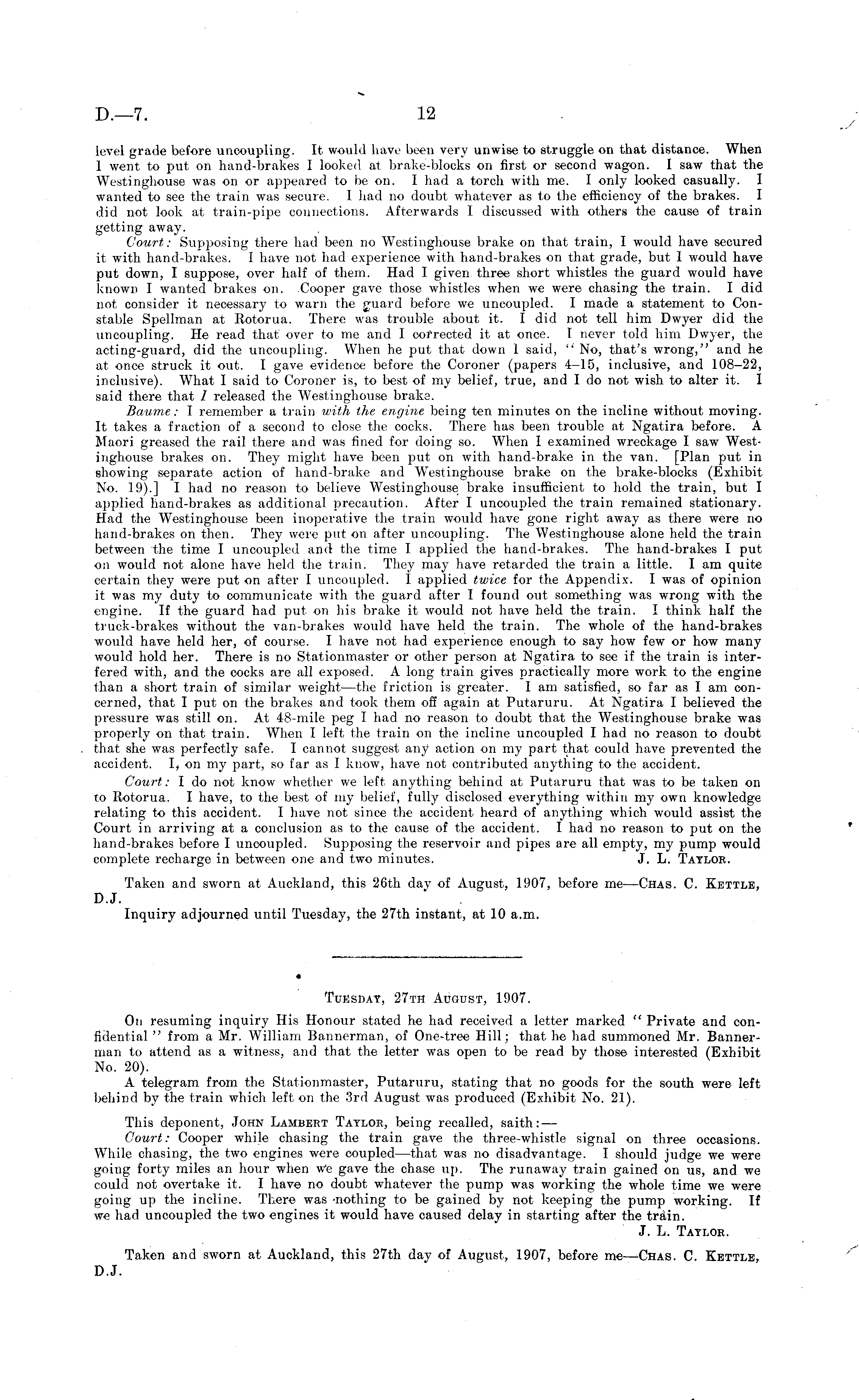 Tuesday, 27th August, 1907. On resuming inquiry His Honour stated he had received a letter marked " Private and confidential " from a Mr. William Bannerman, of One-tree Hill; that he had summoned Mr. Bannerman to attend as a witness, and that the letter was open to be read by those interested (Exhibit No. 20). A telegram from the Stationmaster, Putaruru, stating that no goods for the south were left behind by the train which left on the 3rd August was produced (Exhibit No. 21). This deponent, John Lambert Taylor, being recalled, saith: — Court: Cooper while chasing the train gave the three-whistle signal on three occasions. While chasing, the two engines were coupled—that was no disadvantage. I should judge we were going forty miles an hour when we gave the chase up. The runaway train gained on us, and we could not overtake it. I have no doubt whatever the pump was working the whole time we were going up the incline. There was -nothing to be gained by not keeping the pump working. If we had uncoupled the two engines it would have caused delay in starting after the train. J. L. Taylor. Taken and sworn at Auckland, this 27th day of August, 1907, before me—Chas. C. Kettle, D.J.