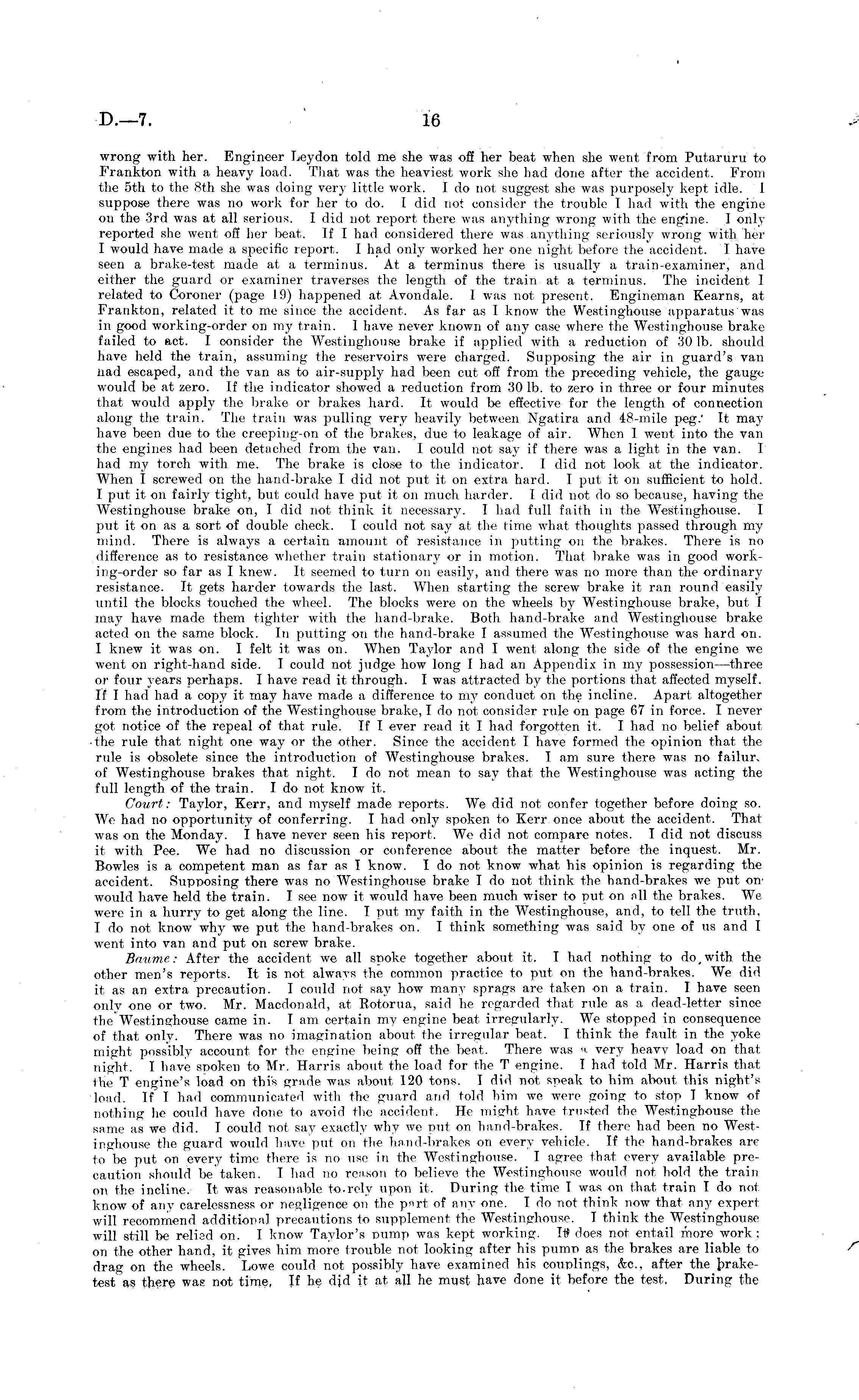 wrong with her. Engineer Leydon told me she was off her beat when she went from Putaruru to Frankton with a heavy load. That was the heaviest work siie had done after the accident. From the sth to the Bth she was doing very little work. Ido not suggest she was purposely kept idle. I suppose there was no work for her to do. I did not consider the trouble I had with the engine ou the 3rd was at all serious. I did not report there was anything wrong with the engine. I onlyreported she went off her heat. If I had considered there was anything seriously wrong with her I would have made a specific report. I had only worked her one night before the accident. 1 have seen a brake-test made at a terminus. At a terminus there is usually a train-examiner, and either the guard or examiner traverses the length of the train at a terminus. The incident I related to Coroner (page 19) happened at Avondale. 1 was not present. Engineman Kearns, at Frankton, related it to me since the accident. As far as I know the Westinghouse apparatus was in good working-order on my train. 1 have never known of any case where the Westinghouse brake failed to act. I consider the Westinghouse brake if applied with a reduction of 30 lb. should have held the train, assuming the reservoirs were charged. Supposing the air in guard's van nad escaped, and the van as to air-supply had been cut off from the preceding vehicle, the gauge would be at zero. If the indicator showed a reduction from 301b. to zero in three or four minutes that would apply the brake or brakes hard. It would be effective for the length of connection along the train. The train was pulling very heavily between Ngatira and 48-mile peg.' It may have been due to the creeping-on of the brakes, due to leakage of air. When I went into the van the engines had been detached from the van. I could not say if there was a light in the van. I had my torch with me. The brake is close to the indicator. I did not look at the indicator. When I screwed on the hand-brake I did not put it on extra hard. I put it on sufficient to hold. I put it on fairly tight, but could have put it on much harder. I did not do so because, having the Westinghouse brake on, I did not think it necessary. I had full faith in the Westinghouse. I put it on as a sort of double check. I could not say at the time what thoughts passed through my mind. There is always a certain amount of resistance in putting on the brakes. There is no difference as to resistance whether train stationary or in motion. That brake was in good work-ing-order so far as I knew. It seemed to turn on easily, and there was no more than the ordinary resistance. It gets harder towards the last. When starting the screw brake it ran round easily until the blocks touched the wheel. The blocks were on the wheels by Westinghouse brake, but 1 may have made them tighter with the hand-brake. Both hand-brake and Westinghouse brake acted on the same block. In putting on the hand-brake 1 assumed the Westinghouse was hard on. I knew it was on. I felt it was on. When Taylor and I went along the side of the engine we went on right-hand side. I could not, judge how long I had an Appendix in my possession—three or four years perhaps. I have read it through. I was attracted by the portions that affected myself. If I had had a copy it may have made a difference to my conduct on the incline. Apart altogether from the introduction of the Westinghouse brake, I do not consider rule on page 67 in force. I never got notice of the repeal of that rule. If I ever read it, I had forgotten it. I had no belief about ■ the rule that night one way or the other. Since the accident I have formed the opinion that the rule is obsolete since the introduction of Westinghouse brakes. I am sure there was no failur. of Westinghouse brakes that night. I do not mean to say that the Westinghouse was acting the full length of the train. Ido not know it. Court: Taylor, Kerr, and myself made reports. We did not confer together before doing so. We had no opportunity of conferring. T had only spoken to Kerr once about the accident. That was on the Monday. I have never seen his report. We did not compare notes. I did not discuss it with Pee. We had no discussion or conference about the matter before the inquest. Mr. Bowles is a competent man as far as I know. Ido not know what his opinion is regarding the accident. Supposing there was no Westinghouse brake Tdo not think the hand-brakes we put on would have held the train. I see now it would have been much wiser to put on all the brakes. We were in a hurry to get along the line. T put my faith in the Westinghouse, and, to tell the truth, I do not, know why we put the hand-brakes on. I think something was said by one of us and I went into van and put on screw brake. Baume: After the accident we all spoke together about it. I had nothing to do,with the other men's reports. It is not always the common practice to put on the hand-brakes. We did it as an extra precaution. I could not say how many sprags are taken on a train. I have seen only one or two. Mr. Macdonald, at Rotorua, said lie regarded that rule as a dead-letter since theWestinghouse came in. lam certain my engine beat, irregularly. We stopped in consequence of that only. There was no imagination about the irregular beat. I think the fault in the yoke might possibly account for the engine being off the beat. There was n very heavy load on that night. T have snoken to Mr. Harris about the load for the T engine. T had told Mr. Harris that tin- T engine's load on this grade was about 120 tons. T did not speak to him about this night's load. If T had communicated with the guard and told him we were going to stop T know of nothing he could have done to avoid fhe accident. He might have trusted the Westinghouse the same as we did. T could not say exactly why we nut on hand-brakes. If there had been no Westinghouse the guard would have put on the hand-brakes on every vehicle. If
