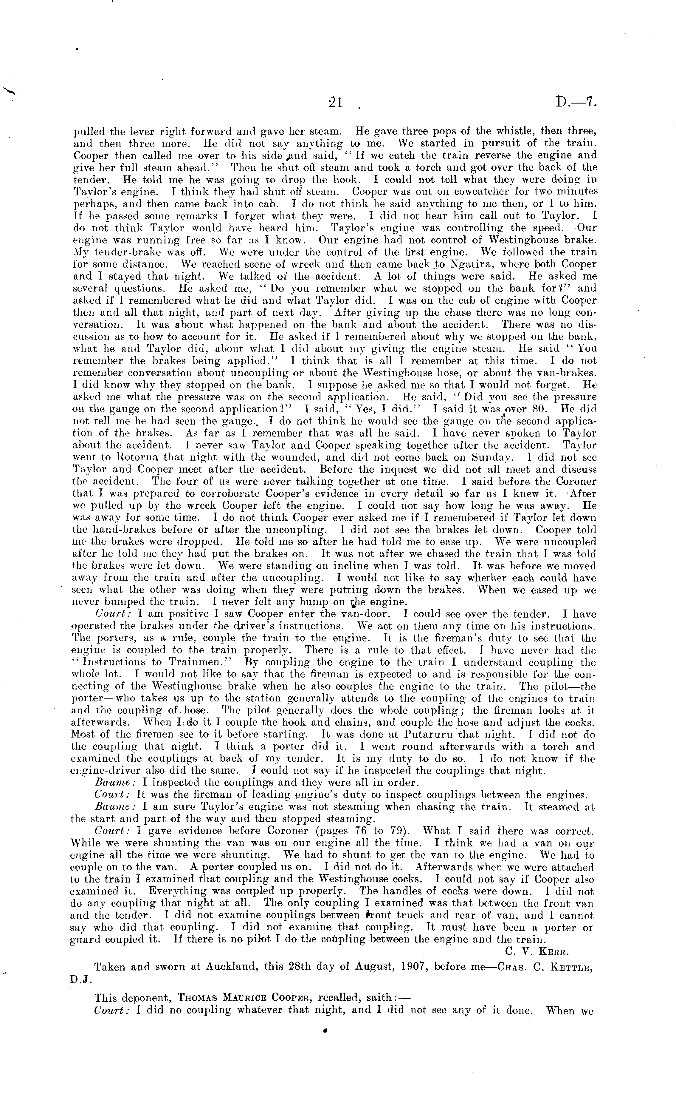 [Hilled the lover right forward and gave her steam. He gave three pops of the whistle, then three, and then three more. He did not say anything to me. We started in pursuit of the train. Cooper then called me over to his side ,and said, " If we catch the train reverse the engine and give her full steam ahead." Then he shut off steam and took a torch and got over the back of the tender. He told me he was going to drop the hook. I could not tell what they were doing in Taylor's engine. I think they had shut ofi steam. Cooper was out on cowcatcher for two minutes perhaps, and then came back into cab. Ido not think he said anything to me then, or Ito him. If ho passed some remarks I forget what they wore. I did not hear him call out to Taylor. I do not think Taylor would have heard him. Taylor's engine was controlling the speed. Our engine was running free so far as I know. Our engine had not control of Westinghouse brake. My tender-brake was (iff. We were under the control of the first engine. We followed the train for some distance. We reached scene of wreck and then came back to Ngatira, where both Cooper and I stayed that night. We talked of the accident. A lot of things were said. Ho asked me several questions. Ho asked me, "Do you remember what we stopped on the bank for?" and asked if I remembered what he did and what Taylor did. I was on the cab of engine with Cooper then and all that night, and part of next day. After giving up the chase there was no long conversation. It was about what happened on the bank and about the accident. There was no discussion as to how to account for it. He asked if 1 remembered about why wo stopped on the bank, what ho and Taylor did, alxmt what 1 did about my giving the engine steam. He said "You r< member the brakes being applied." I think that is all 1 remember at this time. I do not remember conversation about uncoupling or about the Westinghouse hose, or about the van-brakes. 1 did know why they stopped on the bank. 1 suppose ho asked me so that I would not forget. Ho asked me what the pressure was on the second application. He said, " Did you see the pressure on the gauge on the second application?" I said, " Yes, I did." I said it was over 80. He did not toll me ho had seen the gauge. 1 do not, think he would see the gauge on the second application of the brakes. As far as I remember that was all he said. I have never spoken to Taylor aboul tin , accident. I never saw Taylor and Cooper speaking together after the accident. Taylor wont to Rotorua that night with the wounded, and did not come back on Sunday. I did not see Taylor and Cooper meet after the accident. Before the inquest we did not all meet and discuss Iho accident. The four of us were never talking together at one time. I said before the Coroner I hat I was prepared to corroborate Cooper's evidence in every detail so far as I knew it. After we pulled up by the wreck Cooper left the engine. I could not say how long he was away. He was away for some time. Ido not think Cooper ever asked me if I remembered if Taylor let down iho hand-brakes before or after the uncoupling. I did not see the brakes let down. Cooper told me the brakes were dropped. He told me so after he had told me to ease up. We were uncoupled after he told me they had put the brakes on. It was not after we chased the train that I was told the brakes were let down. We were standing on incline when I was told. It was before we moved away from the train and after the uncoupling. I would not like to say whether each could have seen what the other was doing when they were putting down the brakes. When we eased up we never bumped the train. I never felt any bump on £he engine. Court: lam positive I saw Cooper enter the van-door. I could see over the tender. I have operated the brakes under the driver's instructions. We act on them any time on his instructions. The porters, as a rule, couple the train to the engine. It is the fireman's duty to see that the engine is coupled to the train properly. There is a rule to that effect. I have never had Hie " Instructions to Trainmen." By coupling the engine to the train I understand coupling the whole lot. I would not like to say that the fireman is expected to and is responsible for the connecting of the Westinghouse brake when he also couples the engine to the train. The pilot—the porter —who takes us up to the station generally attends to the coupling of the engines to train and the coupling of hose. The pilot generally does the whole coupling; the fireman looks at it afterwards. When Idoit I couple the hook and chains, and couple the hose and adjust the cocks. Most of the firemen see to it before starting. It was done at Putaruru that night. I did not do the coupling that night. I think a porter did it. I went round afterwards with a torch and examined the couplings at back of my tender. It is my fluty to do so. I do not know if (Ik , engine-driver also did the same. I could not say if he inspected the couplings that night. Baume: I inspected the couplings and they were all in order. Court: It was the fireman of leading engine's duty to inspect couplings between the engines. Baume: I am sure Taylor's engine was not steaming when chasing the train. It steamed at (he start and part of the way and then stopped steaming. Court: 1 gave evidence before Coroner (pages 76 to 79). What I said there was correct. While we were shunting the van was on our engine all the time. I think wo had a van on our engine all the time we were shunting. W T e had to shunt to get the van to the engine. We had to couple on to the van. A porter coupled us on. I did not do it. Afterwards when we were attached to the train I examined that coupling and the Westinghouse cocks. I could not say if Cooper also examined it. Everything was coupled up properly. The handles of cocks were down. I did not do any coupling that night at all. The only coupling I examined was that between the front van and the tender. I d