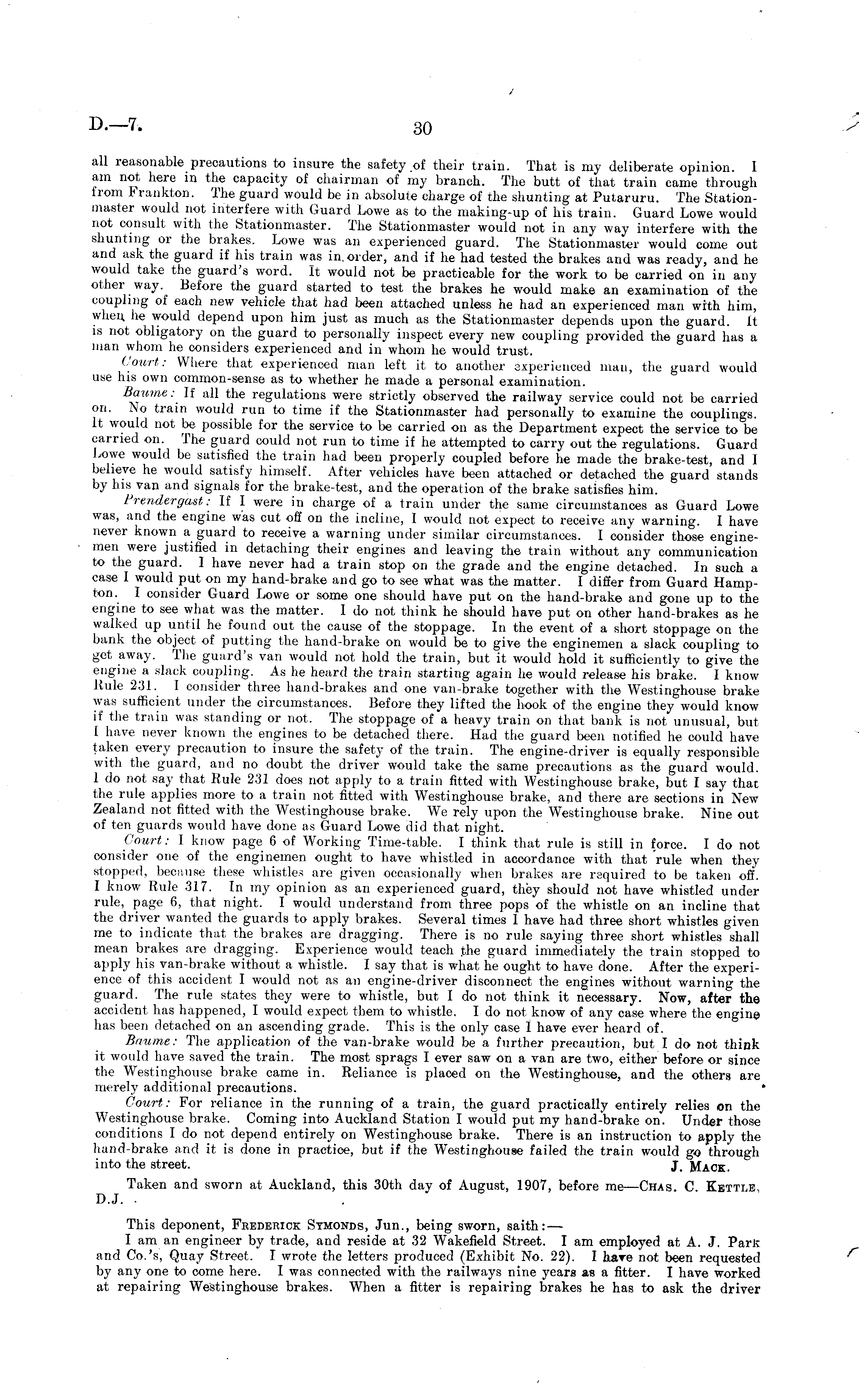 all reasonable precautions to insure the safety of their train. That is my deliberate opinion. I am not here in the capacity of chairman of my branch. The butt of that train came through from Frankton. The guard would be in absolute charge of the shunting at Putaruru. The Stationmaster would not interfere with Guard Lowe as to the making-up of his train. Guard Lowe would not consult with the Stationmaster. The Stationmaster would not in any way interfere with the shunting or the brakes. Lowe was an experienced guard. The Stationmaster would come out and ask the guard if his train was in. order, and if he had tested the brakes and was ready, and he would take the guard's word. It would not be practicable for the work to be carried on in any other way. Before the guard started to test the brakes he would make an examination of the coupling of each new vehicle that had been attached unless he had an experienced man with him, when lie would depend upon him just as much as the Stationmaster depends upon the guard. It is not obligatory on the guard to personally inspect every new coupling provided the guard has a man whom he considers experienced and in whom he would trust. Court: Where that experienced man left it to another experienced man, the guard would use his own common-sense as to whether he made a personal examination. Baume: If all the regulations were strictly observed the railway service could not be carried on. No tram would run to time if the Stationmaster had personally to examine the couplings. It would not be possible for the service to be carried on as the Department expect the service to be carried on. The guard could not run to time if he attempted to carry out the regulations. Guard Lowe would be satisfied the train had been properly coupled before he made the brake-test, and I believe he would satisfy himself. After vehicles have been attached or detached the guard stands by lm van and signals for the brake-test, and the operation of the brake satisfies him. I'rendergast: If I were in charge of a train under the same circumstances as Guard Lowe was, and the engine was cut off on the incline, I would not expect to receive any warning. I have never known a guard to receive a warning under similar circumstances. I consider those enginemen were justified in detaching their engines and leaving the train without any communication to the guard. I have never had a train stop on the grade and the engine detached. In such a case I would put on my hand-brake and go to see what was the matter. I differ from Guard Hampton. I consider Guard Lowe or some one should have put on the hand-brake and gone up to the engine to see what was the matter. Ido not think he should have put on other hand-brakes as he walked up until he found out the cause of the stoppage. In the event of a short stoppage on the bank the object of putting the hand-brake on would be to give the enginemen a slack coupling to get away. The guard's van would not hold the train, but it would hold it sufficiently to give the engine a sluck coupling. As he heard the train starting again he would release his brake. I know Rule 231. 1 consider three hand-brakes and one van-brake together with the Westinghouse brake was sufficient under the circumstances. Before they lifted the hook of the engine they would know if the train was standing or not. The stoppage of a heavy train on that bank is not unusual, but 1 have never known the engines to be detached there. Had the guard been notified he could have taken every precaution to insure the safety of the train. The engine-driver is equally responsible with the guard, and no doubt the driver would take the same precautions as the guard would. 1 do not say that Rule 231 does not apply to a train fitted with Westinghouse brake, but I say that the rule applies more to a train not fitted with Westinghouse brake, and there are sections in New Zealand not fitted with the Westinghouse brake. We rely upon the Westinghouse brake. Nine out of ten guards would have done as Guard Lowe did that night. Court: I know page 6of Working Time-table. I think that rule is still in force. Ido not consider one of the enginemen ought to have whistled in accordance with that rule when they stopped, because these whistle.-! are given occasionally when brakes are required to be taken off. I know Rule 317. In my opinion as an experienced guard, they should not have whistled under rule, page 6, that night. I would understand from three pops of the whistle on an incline that the driver wanted the guards to apply brakes. Several times 1 have had three short whistles given me to indicate that the brakes are dragging. There is no rule saying three short whistles shall mean brakes are dragging. Experience would teach the guard immediately the train stopped to apply his van-brake without a whistle. I say that is what he ought to have done. After the experience of this accident I would not as an engine-driver disconnect the engines without warning the guard. The rule states they were to whistle, but I do not think it necessary. Now, after the accident has happened, I would expect them to whistle. Ido not know of any case where the engine has been detached on an ascending grade. This is the only case 1 have ever heard of. Baume: The application of the van-brake would be a further precaution, but I do not think it would have saved the train. The most sprags I ever saw on a van are two, either before or since the Westinghouse brake came in. Reliance is placed on the Westinghouse, and the others are merely additional precautions. Court: For reliance in the running of a train, the guard practically entirely relies on the Westinghouse brake. Coming into Auckland Station I would put my hand-brake on. Under those conditions Ido not depend entirely on Westinghouse brake. There is an instruction to apply the hand-brake and it is done in practice, but if the Westinghouse failed the train would go through into the street. J, Mack