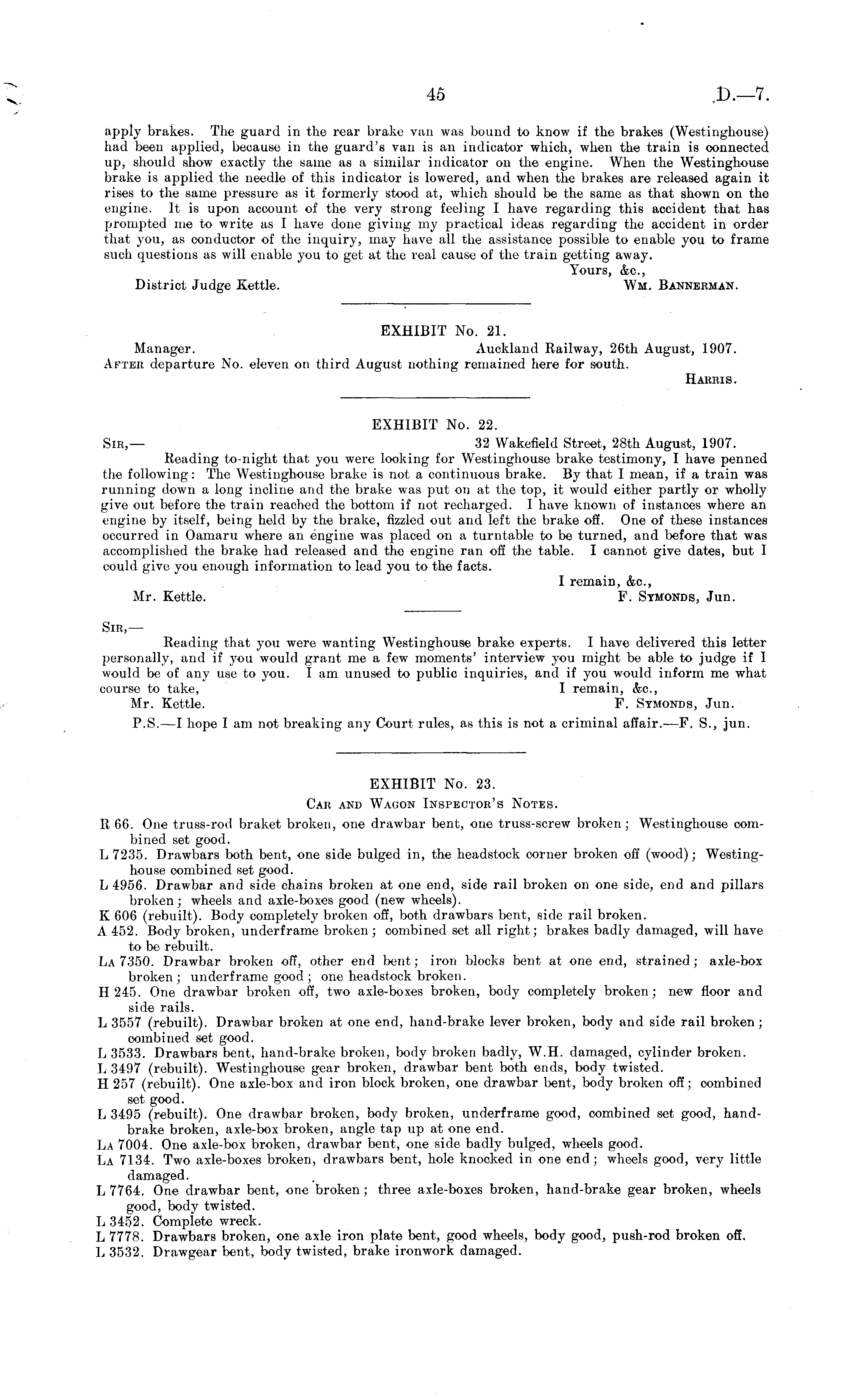 EXHIBIT No. 22. Sir,— 32 Wakefield Street, 28th August, 1907. Heading to-night that you were looking for Westinghouse brake testimony, I have penned (lie following: The Westinghouse brake is not a continuous brake. By that I mean, if a train was running down a long incline and the brake was put on at the top, it would either partly or wholly give out before the train reached the bottom if not recharged. I have known of instances where an engine by itself, being held by the brake, fizzled out and left the brake off. One of these instances occurred in Oamaru where an engine was placed on a turntable to be turned, and before that was accomplished the brake had released and the engine ran off the table. I cannot give dates, but I could give you enough information to lead you to the facts. I remain, &c, Mr. Kettle. F. Stmonds, Jun. Sir, — Reading that you were wanting Westinghouse brake experts. I have delivered this letter personally, and if you would grant me a few moments' interview you might be able to judge if I would be of any use to you. lam unused to public inquiries, and if you would inform me what course to take, I remain, &c, Mr. Kettle. F. Stmonds, Jun. P.S.—I hope I am not breaking any Court rules, as this is not a criminal affair.—F. S., jun.