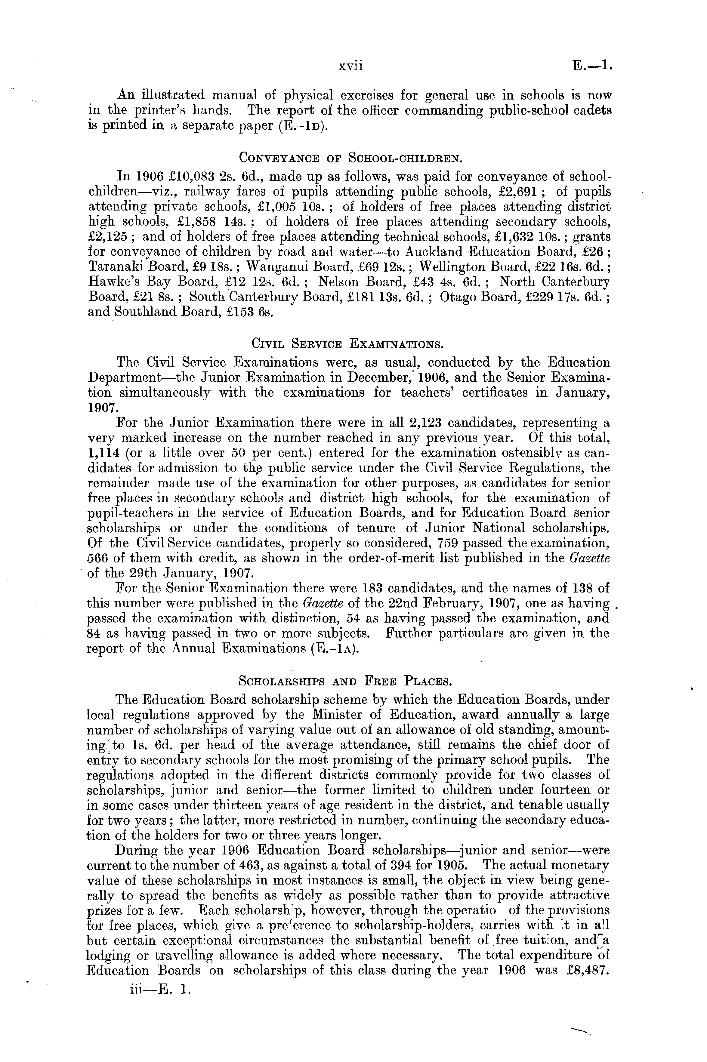 An illustrated manual of physical exercises for general use in schools is now in the printer's hands. The report of the officer commanding public-school cadets is printed in a separate paper (8.-1 d). Conveyance of School-childben. In 1906 £10,083 2s. 6d., made up as follows, was paid for conveyance of schoolchildren—viz., railway fares of pupils attending public schools, £2,691 ; of pupils attending private schools, £1,005 10s. ; of holders of free places attending district high schools, £1,858 14s. ; of holders of free places attending secondary schools, £2,125 ; and of holders of free places attending technical schools, £1,632 10s.; grants for conveyance of children by road and water—to Auckland Education Board, £26 ; Taranaki Board, £9 18s.; Wanganui Board, £69 125.; Wellington Board, £22 16s. 6d.; Hawke's Bay Board, £12 12s. 6d. ; Nelson Board, £43 4s. 6d. ; North Canterbury Board, £21 Bs. ; South Canterbury Board, £181 13s. 6d. ; Otago Board, £229 17s. 6d."; and Southland Board, £153 6s. Civil Sebvice Examinations. The Civil Service Examinations were, as usual, conducted by the Education Department—the Junior Examination in December, 1906, and the Senior Examination simultaneously with the examinations for teachers' certificates in January, 1907. For the Junior Examination there were in all 2,123 candidates, representing a very marked increase on the number reached in any previous year. Of this total, 1,114 (or a little over 50 per cent.) entered for the examination ostensibly as candidates for admission to th,e public service under the Civil Service Kegulations, the remainder made use of the examination for other purposes, as candidates for senior free places in secondary schools and district high schools, for the examination of pupil-teachers in the service of Education Boards, and for Education Board senior scholarships or under the conditions of tenure of Junior National scholarships. Of the Civil Service candidates, properly so considered, 759 passed the examination, 566 of them with credit, as shown in the order-of-merit list published in the Gazette of the 29th January, 1907. For the Senior Examination there were 183 candidates, and the names of 138 of this number were published in the Gazette of the 22nd February, 1907, one as having passed the examination with distinction, 54 as having passed the examination, and 84 as having passed in two or more subjects. Further particulars are given in the report of the Annual Examinations (E.-Ia). SCHOLABSHIPS AND FeEE PLACES. The Education Board scholarship scheme by which the Education Boards, under local regulations approved by the Minister of Education, award annually a large number of scholarships of varying value out of an allowance of old standing, amounting to Is. 6d. per head of the average attendance, still remains the chief door of entry to secondary schools for the most promising of the primary school pupils. The regulations adopted in the different districts commonly provide for two classes of scholarships, junior and senior—the former limited to children under fourteen or in some cases under thirteen years of age resident in the district, and tenable usually for two years; the latter, more restricted in number, continuing the secondary education of the holders for two or three years longer. During the year 1906 Education Board scholarships—junior and senior—were current to the number of 463, as against a total of 394 for 1905. The actual monetary value of these scholarships in most instances is small, the object in view being generally to spread the benefits as widely as possible rather than to provide attractive prizes for a few. Each scholarship, however, through the operatio of the provisions for free places, which give a preference to scholarship-holders, carries with it in a'l but certain exceptional circumstances the substantial benefit of free tuit ; on, and"a lodging or travelling allowance is added where necessary. The total expenditure of Education Boards on scholarships of this class during the year 1906 was £8,487.