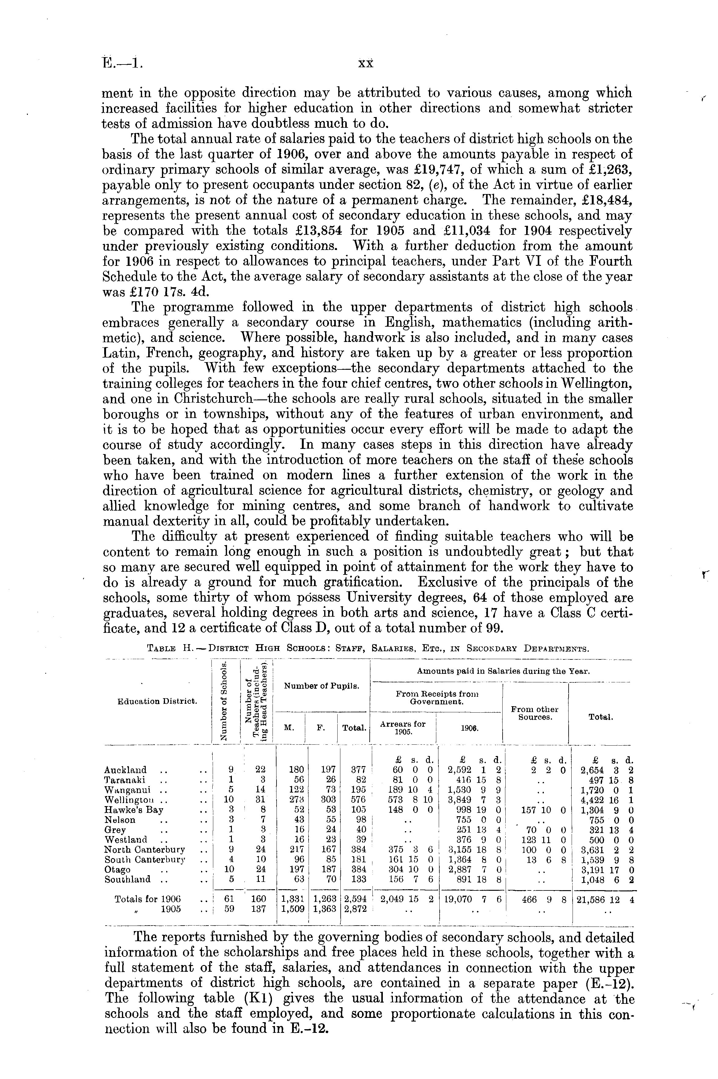 ment in the opposite direction may be attributed to various causes, among which increased facilities for higher education in other directions and somewhat stricter tests of admission have doubtless much to do. The total annual rate of salaries paid to the teachers of district high schools on the basis of the last quarter of 1906, over and above the amounts payable in respect of ordinary primary schools of similar average, was £19,747, of which a sum of £1,263, payable only to present occupants under section 82, (c), of the Act in virtue of earlier arrangements, is not of the nature of a permanent charge. The remainder, £18,484, represents the present annual cost of secondary education in these schools, and may be compared with the totals £13,854 for 1905 and £11,034 for 1904 respectively under previously existing conditions. With a further deduction from the amount for 1906 in respect to allowances to principal teachers, under Part VI of the Fourth Schedule to the Act, the average salary of secondary assistants at the close of the year was £170 17s. 4d. The programme followed in the upper departments of district high schools embraces generally a secondary course in English, mathematics (including arithmetic), and science. Where possible, handwork is also included, and in many cases Latin, French, geography, and history are taken up by a greater or less proportion of the pupils. With few exceptions—the secondary departments attached to the training colleges for teachers in the four chief centres, two other schools in Wellington, and one in Christchurch—the schools are really rural schools, situated in the smaller boroughs or in townships, without any of the features of urban environment, and it is to be hoped that as opportunities occur every effort will be made to adapt the course of study accordingly. In many cases steps in this direction have already been taken, and with the introduction of more teachers on the staff of these schools who have been trained on modern lines a further extension of the work in the direction of agricultural science for agricultural districts, chemistry, or geology and allied knowledge for mining centres, and some branch of handwork to cultivate manual dexterity in all, could be profitably undertaken. The difficulty at present experienced of finding suitable teachers who will be content to remain long enough in such a position is undoubtedly great; but that so many are secured well equipped in point of attainment for the work they have to do is already a ground for much gratification. Exclusive of the principals of the schools, some thirty of whom possess University degrees, 64 of those employed are graduates, several holding degrees in both arts and science, 17 have a Class C certificate, and 12 a certificate of Class D, out of a total number of 99.