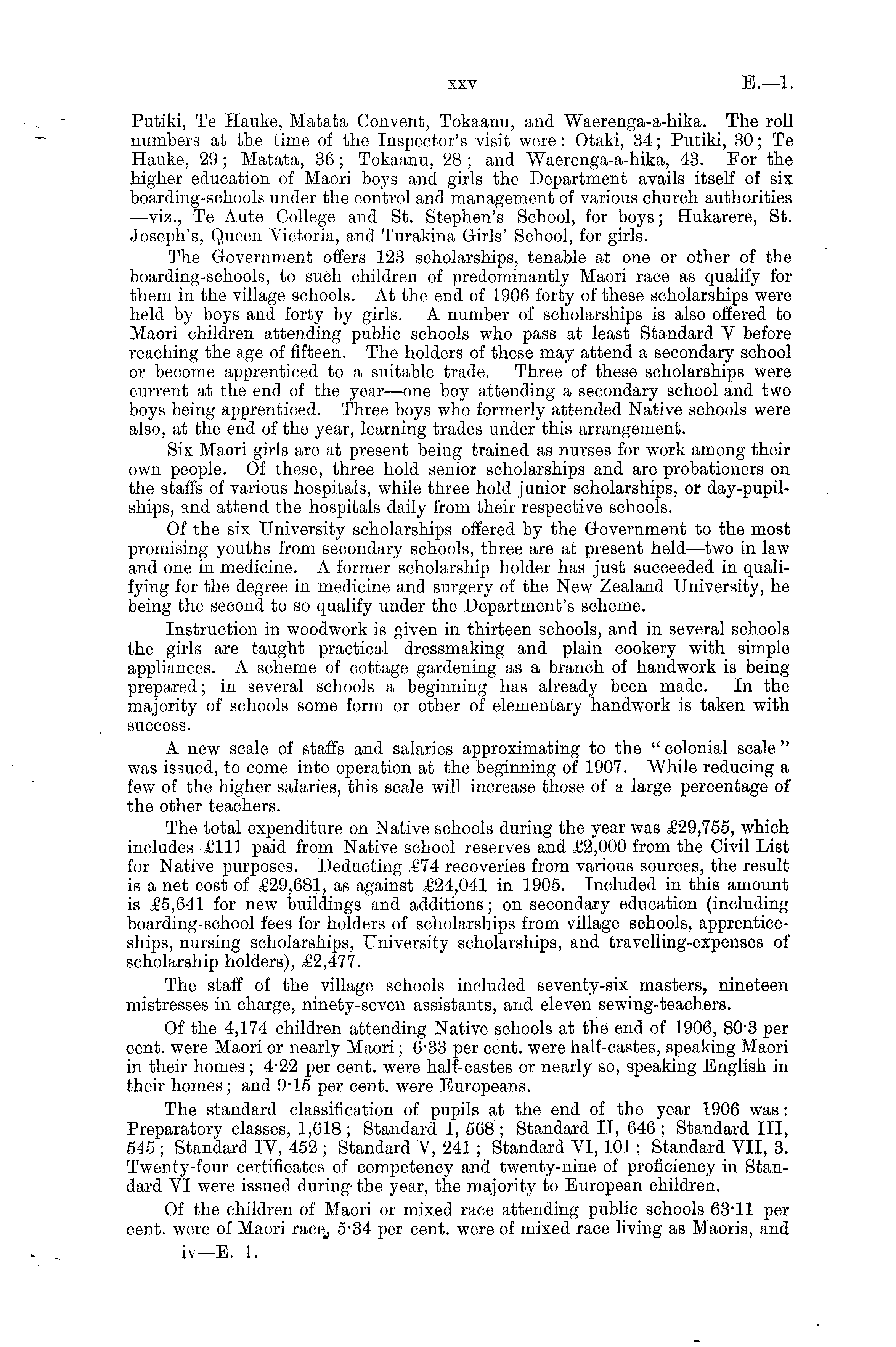 Putiki, Te Hauke, Matata Convent, Tokaanu, and Waerenga-a-hika. The roll numbers at the time of the Inspector's visit were: Otaki, 34; Putiki, 30; Te Hauke, 29; Matata, 36 ; Tokaanu, 28 ; and Waerenga-a-hika, 43. For the higher education of Maori boys and. girls the Department avails itself of six boarding-schools under the control and management of various church authorities —viz., Te Aute College and St. Stephen's School, for boys; Hukarere, St. Joseph's, Queen Victoria, and Turakina Girls' School, for girls. The Government offers 123 scholarships, tenable at one or other of the boarding-schools, to such children of predominantly Maori race as qualify for them in the village schools. At the end of 1906 forty of these scholarships were held by boys and forty by girls. A number of scholarships is also offered to Maori children attending public schools who pass at least Standard V before reaching the age of fifteen. The holders of these may attend a secondary school or become apprenticed to a suitable trade. Three of these scholarships were current at the end of the year—one boy attending a secondary school and two boys being apprenticed. Three boys who formerly attended Native schools were also, at the end of the year, learning trades under this arrangement. Six Maori girls are at present being trained as nurses for work among their own people. Of these, three hold senior scholarships and are probationers on the staffs of various hospitals, while three hold junior scholarships, or day-pupil-ships, and attend the hospitals daily from their respective schools. Of the six University scholarships offered by the Government to the most promising youths from secondary schools, three are at present held—two in law and one in medicine. A former scholarship holder has just succeeded in qualifying for the degree in medicine and surgery of the New Zealand University, he being the second to so qualify under the Department's scheme. Instruction in woodwork is given in thirteen schools, and in several schools the girls are taught practical dressmaking and plain cookery with simple appliances. A scheme of cottage gardening as a branch of handwork is being prepared; in several schools a beginning has already been made. In the majority of schools some form or other of elementary handwork is taken with success. A new scale of staff's and salaries approximating to the " colonial scale " was issued, to come into operation at the beginning of 1907. While reducing a few of the higher salaries, this scale will increase those of a large percentage of the other teachers. The total expenditure on Native schools during the year was £29,755, which includes £111 paid from Native school reserves and .£2,000 from the Civil List for Native purposes. Deducting £74 recoveries from various sources, the result is a net cost of £29,681, as against £24,041 in 1905. Included in this amount is £5,641 for new buildings and additions; on secondary education (including boarding-school fees for holders of scholarships from village schools, apprenticeships, nursing scholarships, University scholarships, and travelling-expenses of scholarship holders), £2,477. The staff of the village schools included seventy-six masters, nineteen mistresses in charge, ninety-seven assistants, and eleven sewing-teachers. Of the 4,174 children attending Native schools at the end of 1906, 803 per cent, were Maori or nearly Maori; 633 per cent, were half-castes, speaking Maori in their homes; 4-22 per cent, were half-castes or nearly so, speaking English in their homes ; and 9-15 per cent, were Europeans. The standard classification of pupils at the end of the year 1906 was: Preparatory classes, 1,618; Standard I, 568; Standard 11, 646; Standard 111, 545 ; Standard IV, 452 ; Standard V, 241 ; Standard VI, 101; Standard VII, 3. Twenty-four certificates of competency and twenty-nine of proficiency in Standard VI were issued during-the year, the majority to European children. Of the children of Maori or mixed race attending public schools 6311 per cent, were of Maori race,, 5*34 per cent, were of mixed race living as Maoris, and