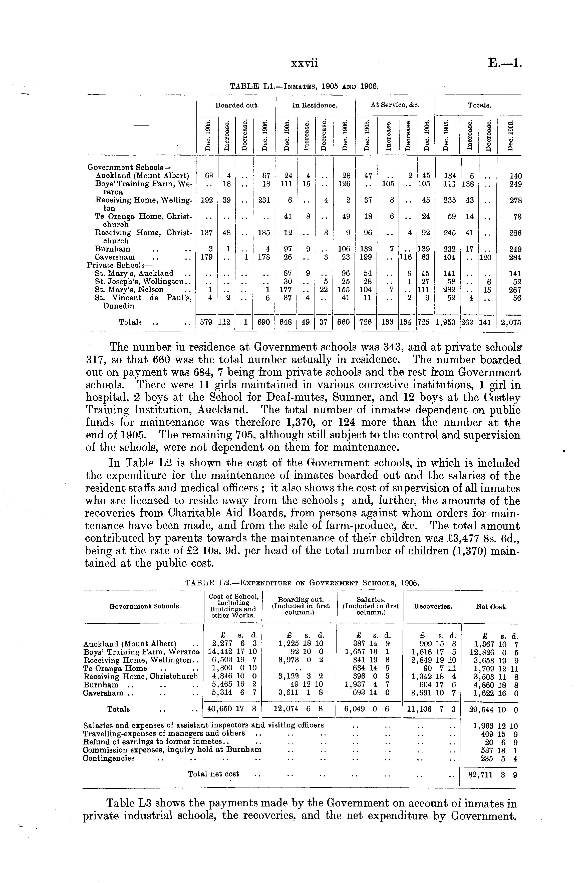 The number in residence at Government schools was 343, and at private schools' 317, so that 660 was the total number actually in residence. The number boarded out on payment was 684, 7 being from private schools and the rest from Government schools. There were 11 girls maintained in various corrective institutions, 1 girl in hospital, 2 boys at the School for Deaf-mutes, Sumner, and 12 boys at the Costley Training Institution, Auckland. The total number of inmates dependent on public funds for maintenance was therefore 1,370, or 124 more than the number at the end of 1905. The remaining 705, although still subject to the control and supervision of the schools, were not dependent on them for maintenance. In Table L 2 is shown the cost of the Government schools, in which is included the expenditure for the maintenance of inmates boarded out and the salaries of the resident staffs and medical officers ; it also shows the cost of supervision of all inmates who are licensed to reside away from the schools ; and, further, the amounts of the recoveries from Charitable Aid Boards, from persons against whom orders for maintenance have been made, and from the sale of farm-produce, &c. The total amount contributed by parents towards the maintenance of their children was £3,477 Bs. 6d., being at the rate of £2 10s. 9d. per head of the total number of children (1,370) maintained at the public cost.