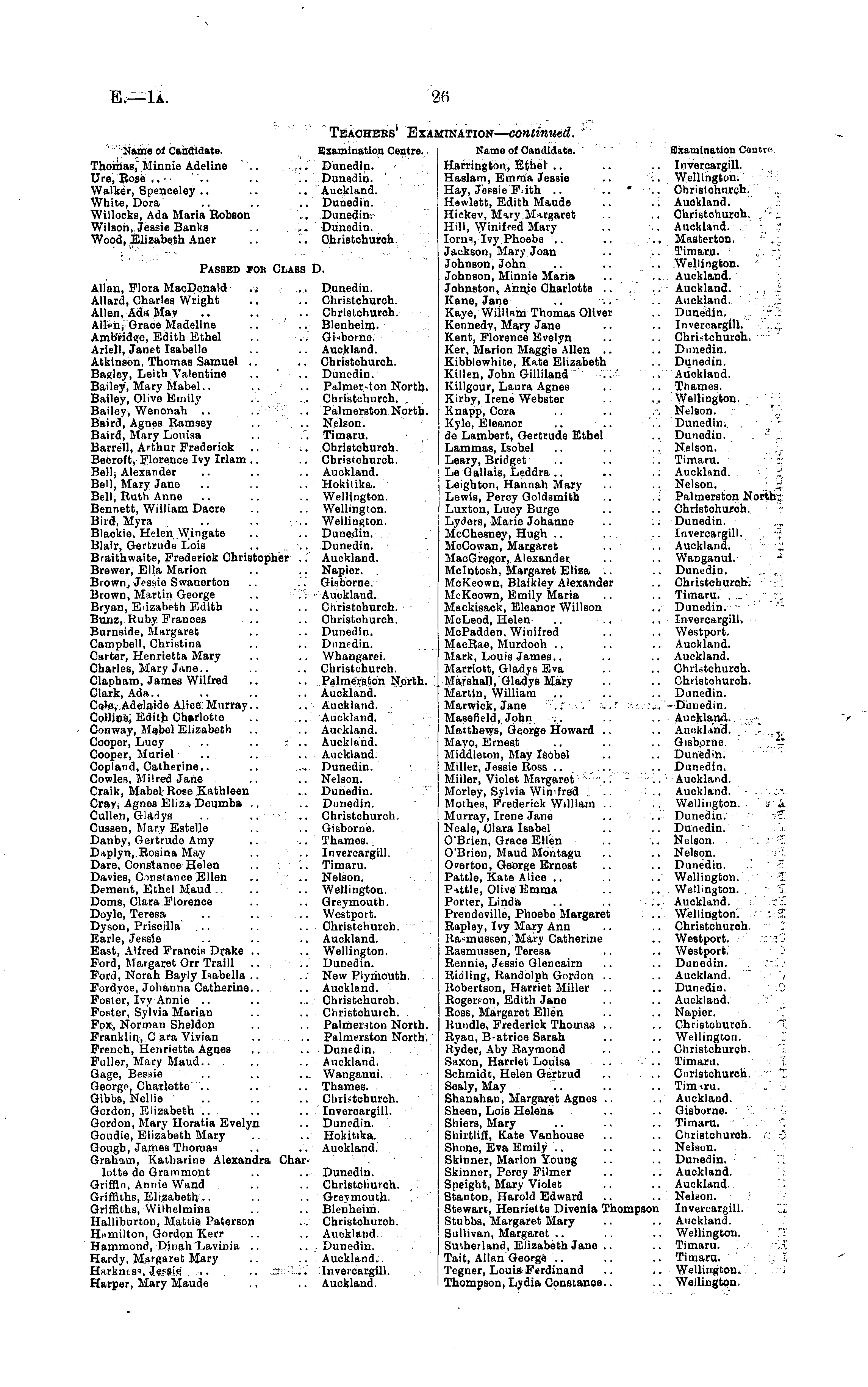 Name of Candidate. Examination Centre. Thomas, Minnie Adeline .. ~. Dunedin. Ure, Rose .. - ■ ".. .. .. Dunedin. Walker, Spenceley .. .. .. Auckland. White, Dora .. .. .. Dunedin. Willocks, Ada Maria Robson .. Dunedin. Wilson, Jessie Banks .. .. Dunedin. Wood, Elizabeth Aner .. .', Christchuroh. Passed for Class D. Allan, Flora Mac Donald .. ... Dunedin. Allard, Charles Wright .. .. Christchurch. Allen, Ada May .. .. .. Christchurch. Allen, Grace Madeline .. .. Blenheim. Ambridge, Edith Ethel .. .. Gisborne. Ariell, Janet Isabelle .. .. Auckland. Atkinson. Thomas Samuel .. .. Christchurch. Bagley, Leith Valentine .. .. Dunedin. Bailey, Mary Mabel.. ... '■ .. Palmer-ton North. Bailey, Olive Emily .. .. Christchurch. Bailey, Wenonah .. ..-■-.' .. Palmerston North. Baird, Agnes Ramsey .. .. Nelson. Baird, Mary Louisa .. .. Timaru. Barrell, Arthur Frederick .. .. Christohuroh. Becroft, Florence Ivy Irlam .. .. Christchurch. Bell, Alexander .. .. .. Auckland. Bell, Mary Jane .. .. .. Hokitika. Bell, Ruth Anne .. .. .. Wellington. Bennett, William Dacre .. Wellington. Bird, Myra ... .. .. .. Wellington. Blaokie, Helen Wingate .. .. Dunedin. Blair, Gertrude Lois .. .. Dunedin. Braithwaite, Frederick Christopher .. Auckland. Brewer, Ella Marion .. .. Napier. Brown, Jessie Swanerton .. Gisborne. Brown, Martin George .. Auckland. Bryan, Eizabeth Edith .. .. Christchuroh. Bunz, Ruby Frances ... .. Christohuroh. Burnside, Margaret .. .. Dunedin. Campbell, Christina .. .. Dunedin. Carter, Henrietta Mary .. .. Whangarei. Charles, Mary Jane.. .. Christchurch. Clapham, James Wilfred .. .. Palmerston North. Clark, Ada.. .. .. .. Auckland. Co>e, Adelaide Alies:Murray.. .. Auckland. Collins, Edith Charlotte .. .. Auckland. Conway, Mabel Elizabeth .. .. Auckland. Cooper, Lucy .. .. .... Auckland. Cooper, Muriel -'"".. .. .. Auckland. Copland, Catherine.. .. ~,. Dunedin. Cowles, Milred Jane .. .. Nelson. Craik, Mabel Rose Kathleen ... Dunedin. Cray, Agnes Eliza, Deumba .. .. Dunedin. Cullen, Gladys .. .... Christchurch. Cussen, Mary Estelle .. .. Gisborne. Danby, Gertrude Amy .. .. Thames. Daplyn,.Rosina May .. .. Invercargill. Dare, Constance Helen .. .. Timaru. Davies, Constance Ellen .. .. Nelson. Dement, Ethel Maud .. .. .. Wellington. Doms, Clara Florence .. .. Greymouth. Doyle, Teresa .. .. .. Westport. Dyson, Priscilla ... .. Christchuroh. Earle, Jessie .. .. .. Auckland. East, Alfred Francis Drake .. .. Wellington. Ford, Margaret Orr Traill .. .. Dunedin. Ford, Norah Bayly Isabella .. .. New Plymouth. Fordyce, Johanna Catherine.. .. Auckland. Foster, Ivy Annie .. .. ... Christchuroh. Foster, Sylvia Marian .. .. Christohutoh. Fpx : , Norman Sheldon .. .. Palmerston North. Franklin, C ara Vivian .. Palmerston North. French, Henrietta Agnes .. .. Dunedin. Fuller, Mary Maud.. .. .. Auckland. Gage, Bessie ~ .. ... Wanganui. George, Charlotte'".. .. .. Thames. Gibbs, Nellie .. .. .. ChrLtchurch. Gordon, Elizabeth .. .. .. Invercargill. Gordon, Mary Horatia Evelyn .. Dunedin. Goudie, Elizabeth Mary .. .. Hokitika. Gough, James Thomas .. .. Auckland. Graham, Katharine Alexandra Charlotte de Grammont .. .. Dunedin. Griffin, Annie Wand .. .. Christohuroh. Griffiths, Elizabeth.. .. .. GreymouthGriffiths, Wilhelmina .. .. Blenheim. Halliburton, Mattie Paterson .. Christchuroh. Hamilton, Gordon Kerr .. .. Auckland. Hammond, Dinah Lavinia .. ... Dunedin. Hardy, Margaret Mary .. .. Auckland.. Harkntss Jessie .. .. " .. Invercargill. Harper, Mary Maude ~ ~ Auckland.