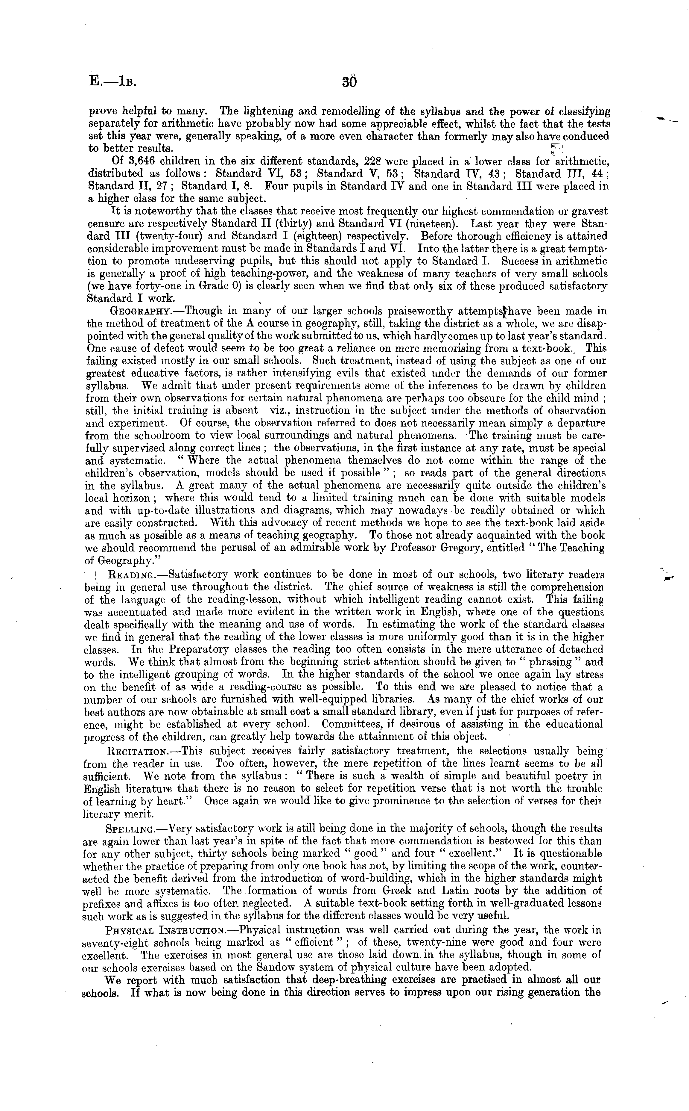 prove helpful to many. The lightening and remodelling of the syllabus and the power of classifying separately for arithmetic have probably now had some appreciable effect, whilst the fact that the tests set this year were, generally speaking, of a more even character than formerly may also have conduced to better results. |T' Of 3,646 children in the six different standarda, 228 were placed in a lower claas for arithmetic, diatributed aa follows : Standard VI, 53 ; Standard V, 53 ; Standard IV, 43 ; Standard 111, 44 ; Standard 11, 27 ; Standard I, 8. Four pupils in Standard IV and one in Standard 111 were placed in a higher class for the same subject. Tt is noteworthy that the classes that receive most frequently our highest commendation or gravest censure are respectively Standard II (thirty) and Standard VI (nineteen). Last year they were Standard 111 (twenty-four) and Standard I (eighteen) respectively. Before thorough efficiency is attained considerable improvement must be made in Standards I and VI. Into the latter there is a great temptation to promote undeserving pupils, but this should not apply to Standard I. Success in arithmetic is generally a proof of high teaching-power, and the weakness of many teachers of very small schools (we have forty-one in Grade 0) is clearly seen when we find that only six of these produced satisfactory Standard I work. Geography.—-Though in many of our larger schools praiseworthy attempts|;have been made in the method of treatment of the A course in geography, still, taking the district as a whole, we are disappointed with the general quality of the work submitted to us, which hardly cornea up to last year'a atandard. One cause of defect would aeem to be too great a reliance on mere memoriaing from a text-book. This failing existed mostly in our small schools. Such treatment, instead of using the subject as one of our greatest educative factors, is rather intensifying evils that existed under the demands of our former syllabus. We admit that under present requirements some of the inferences to be drawn by children from their own observations for certain natural phenomena are perhaps too obscure for the child mind ; still, the initial training is absent —viz., instruction in the subject under the methods of observation and experiment. Of course, the observation referred to does not necessarily mean simply a departure from the schoolroom to view local surroundings and natural phenomena. The training must be carefully supervised along correct lines ; the observations, in the first instance at any rate, must be special and systematic. " Where the actual phenomena themselves do not come within the range of the children's observation, models should be used if possible " ; so reads part of the general directions in the ayllabua. A great many of the actual phenomena are neceaaarily quite outaide the children's local horizon; where thia would tend to a limited training much can be done with auitable modela and with up-to-date illustrations and diagrams, which may nowadays be readily obtained or which are easily constructed. With this advocacy of recent methods we hope to see the text-book laid aside as much as possible as a means of teaching geography. To those not already- acquainted with the book we should recommend the perusal of an admirable work by Professor Gregory, entitled " The Teaching of Geography." Reading.—Satisfactory work continues to be done in most of our achoola, two literary readers being in general uae throughout the diatrict. The chief source of weakness is still the comprehension of the language of the reading-lesson, without which intelligent reading cannot exist. This failing was accentuated and made more evident in the written work in English, where one of the questions dealt specifically with the meaning and use of words. In estimating the work of the standard classes we find in general that the reading of the lower classes is more uniformly good than it is in the higher classes. In the Preparatory classea the reading too often consists in the mere utterance of detached words. We think that almost from the beginning strict attention should be given to " phrasing " and to the intelligent grouping of words. In the higher standards of the school we once again lay stress on the benefit of as wide a reading-courae as possible. To this end we are pleased to notice that a number of our schools are furnished with well-equipped libraries. As many of the chief works of our best authors are now obtainable at small cost a small standard library, even if just for purposes of reference, might be established at every school. Committees, if desirous of assisting in the educational progress of the children, can greatly help towards the attainment of this object. Recitation. —This subject receives fairly satisfactory treatment, the selections usually- being from the reader in use. Too often, however, the mere repetition of the lines learnt seems to be all sufficient. We note from the syllabus : " There is such a wealth of simple and beautiful poetry in English literature that there is no reason to select for repetition verse that is not worth the trouble of learning by heart." Once again we would like to give prominence to the selection of verses for theii literary merit. Spelling.—Very satisfactory- work is still being done in the majority of schools, though the results are again lower than last year's in spite of the fact that more commendation is bestowed for this than for any other subject, thirty schools being marked " good " and four " excellent." It is questionable whether the practice of preparing from only one book has not, by limiting the scope of the work, counteracted the benefit derived from the introduction of word-building, which in the higher standards might well be more systematic. The formation of words from Greek and Latin roots by the addition of prefixes and affixes is too often neglected. A suitable text-book setting 