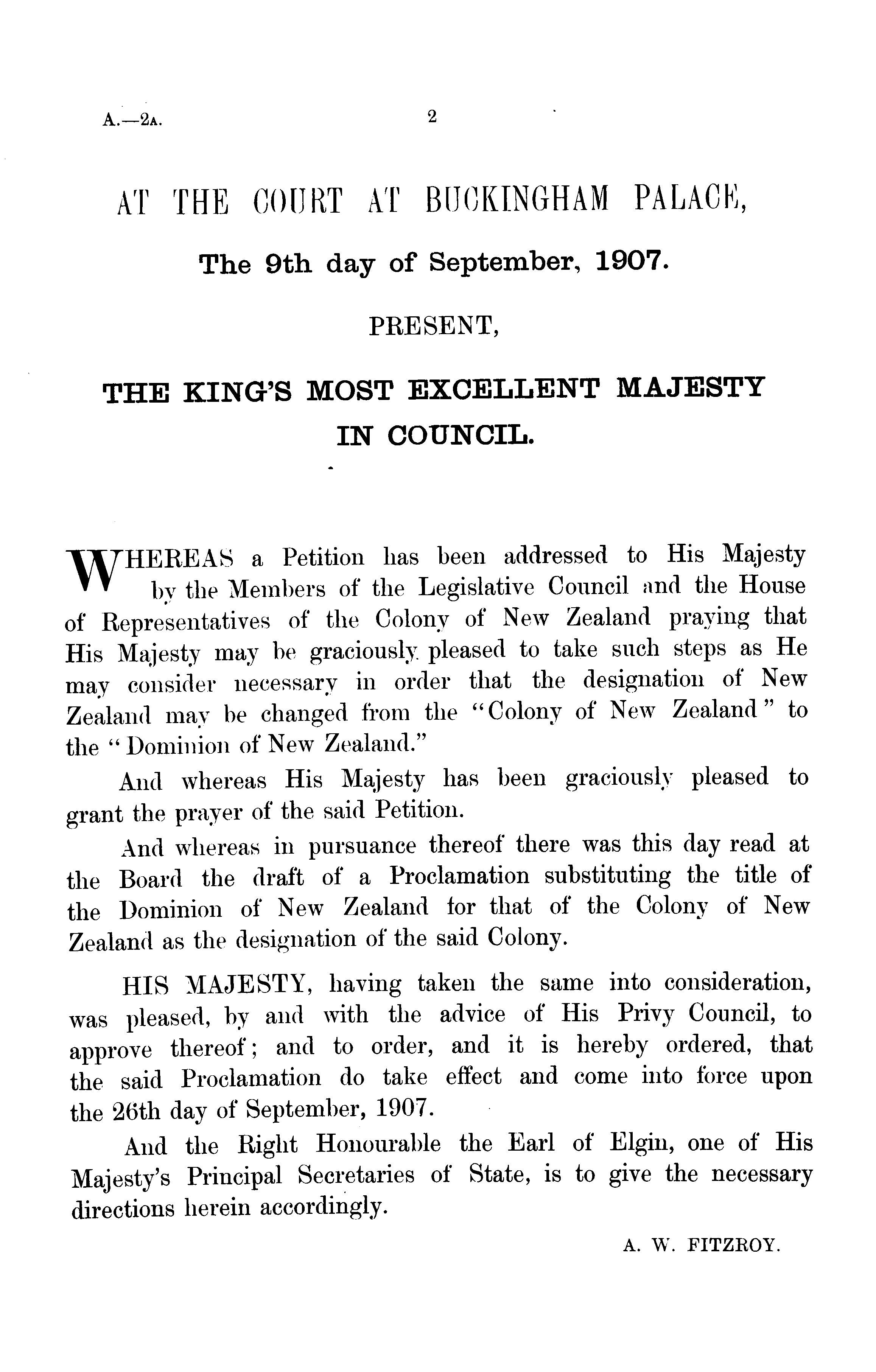 AT THE COURT AT BUCKINGHAM PALAOK, The 9th day of September, 1907. PRESENT, THE KING'S MOST EXCELLENT MAJESTY IN COUNCIL. WHEREAS a Petition has been addressed to His Majesty by the Members of the Legislative Council and the House of Representatives of the Colony of New Zealand praying that His Majesty may be graciously, pleased to take such steps as He may consider necessary in order that the designation of New Zealand may be changed from the "Colony of New Zealand to the " Dominion of New Zealand." And whereas His Majesty has been graciously pleased to grant the prayer of the said Petition. And whereas in pursuance thereof there was this day read at the Board the draft of a Proclamation substituting the title of the Dominion of New Zealand tor that of the Colony of New Zealand as the designation of the said Colony. HIS MAJESTY, having taken the same into consideration, was pleased, by and with the advice of His Privy Council, to approve thereof; and to order, and it is hereby ordered, that the said Proclamation do take effect and come into force upon the 26th day of September, 1907. And the Right Honourable the Earl of Elgin, one of His Majesty's Principal Secretaries of State, is to give the necessary directions herein accordingly. A. W. FITZROY.