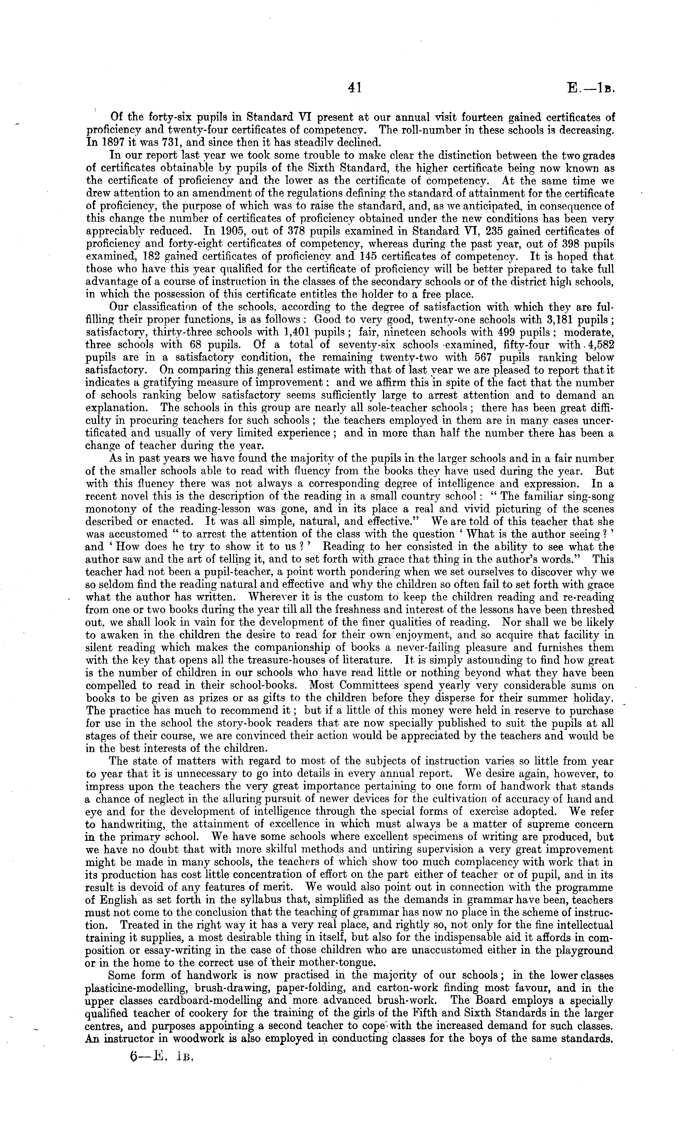 Of the forty-six pupils in Standard VI present at our annual visit fourteen gained certificates of proficiency and twenty-four certificates of competency. The roll-number in these schools is decreasing. In 1897 it was 731, and since then it has steadily declined. In our report last year we took some trouble to make clear the distinction between the two grades of certificates obtainable by pupils of the Sixth Standard, the higher certificate being now known as the certificate of proficiency and the lower as the certificate of competency. At the same time we drew attention to an amendment of the regulations defining the standard of attainment for the certificate of proficiency, the purpose of which was to raise the standard, and, as we anticipated, in consequence of this change the number of certificates of proficiency obtained under the new conditions has been very appreciably- reduced. In 1905, out of 378 pupils examined in Standard VI, 235 gained certificates of proficiency and forty-eight certificates of competency, whereas during the past year, out of 398 pupils examined, 182 gained certificates of proficiency and 145 certificates of competency. It is hoped that thoae who have thia year qualified for the certificate of proficiency will be better prepared to take full advantage of a courae of instruction in the claaaea of the secondary achoola or of the diatrict high schools, in which the posseasion of this certificate entitles the holder to a free place. Our classification of the schools, according to the degree of satisfaction with which the)- are fulfilling their proper functions, is as follows : Good to very good, twenty-one schools with 3,181 pupils ; satisfactory, thirty-three schools with 1,401 pupils ; fair, nineteen schools with 499 pupils ; moderate, three schools with 68 pupils. Of a total of seventy-six schoola examined, fifty-four with 4,582 pupila are in a aatisfactory condition, the remaining twenty-two with 567 pupils ranking below satisfactory. On comparing this general estimate with that of last year we are pleased to report that it indicates a gratifying measure of improvement; and we affirm this in spite of the fact that the number of schools ranking below satisfactory seems sufficiently large to arrest attention and to demand an explanation. The schools in this group are nearly all sole-teacher schools ; there has been great difficulty in procuring teachers for such schools ; the teachers employed in them are in many cases uncertificated and usually of very limited experience ; and in more than half the number there has been a change of teacher during the year. As in past years we have found the majority of the pupils in the larger schools and in a fair number of the smaller schoola able to read with fluency from the books they have used during the year. But with this fluency there was not always a corresponding degree of intelligence and expression. In a recent novel this is the description of the reading in a small country school: " The familiar sing-song monotony of the reading-lesson was gone, and in its place a real and vivid picturing of the scenea described or enacted. It was all simple, natural, and effective." We are told of this teacher that she was accustomed " to arrest the attention of the class with the question ' What is the author seeing ? ' and ' How does he try to show it to us ? ' Reading to her consisted in the ability to see what the author saw and the art of telling it, and to set forth with grace that thing in the author's words." This teacher had not been a pupil-teacher, a point worth pondering when we set ourselves to discover why we so seldom find the reading natural and effective and why the children so often fail to set forth with grace what the author has written. Wherever it is the custom to keep the children reading and re-reading from one or two books during the year till all the freshneaa and interest of the leaaona have been threahed out, we ahall look in vain for the development of the finer qualities of reading. Nor shall we be likely to awaken in the children the desire to read for their own enjoyment, and so acquire that facility in silent reading which makes the companionship of books a never-failing pleasure and furnishes them with the key that opens all the treasure-houses of literature. It is simply astounding to find how great ia the number of children in our achools who have read little or nothing beyond what they have been compelled to read in their school-books. Most Committees spend yearly very considerable sums on books to be given as prizes or as gifts to the children before they disperse for their summer holiday. The practice has much to recommend it; but if a little of this money were held in reaerve to purchaae for uae in the achool the story-book readera that are now apecially published to suit the pupils at all stages of their course, we are convinced their action would be appreciated by the teachers and would be in the best interests of the children. The state of matters with regard to most of the subjects of instruction varies so little from year to year that it is unnecessary to go into details in every annual report. We desire again, however, to impress upon the teachers the very great importance pertaining to one form of handwork that stands a chance of neglect in the alluring pursuit of newer devices for the cultivation of accuracy of hand anei eye and for the development of intelligence through the special forms of exercise adopted. We refer to handwriting, the attainment of excellence in which must always be a matter of supreme concern in the primary school. We have some schools where excellent specimens of writing are produced, but we have no doubt that with more skilful methods and untiring supervision a very great improvement might be made in many schools, the teachers of which show too much complacency with work that in its production has cost little concentration of effort on the part either of tea