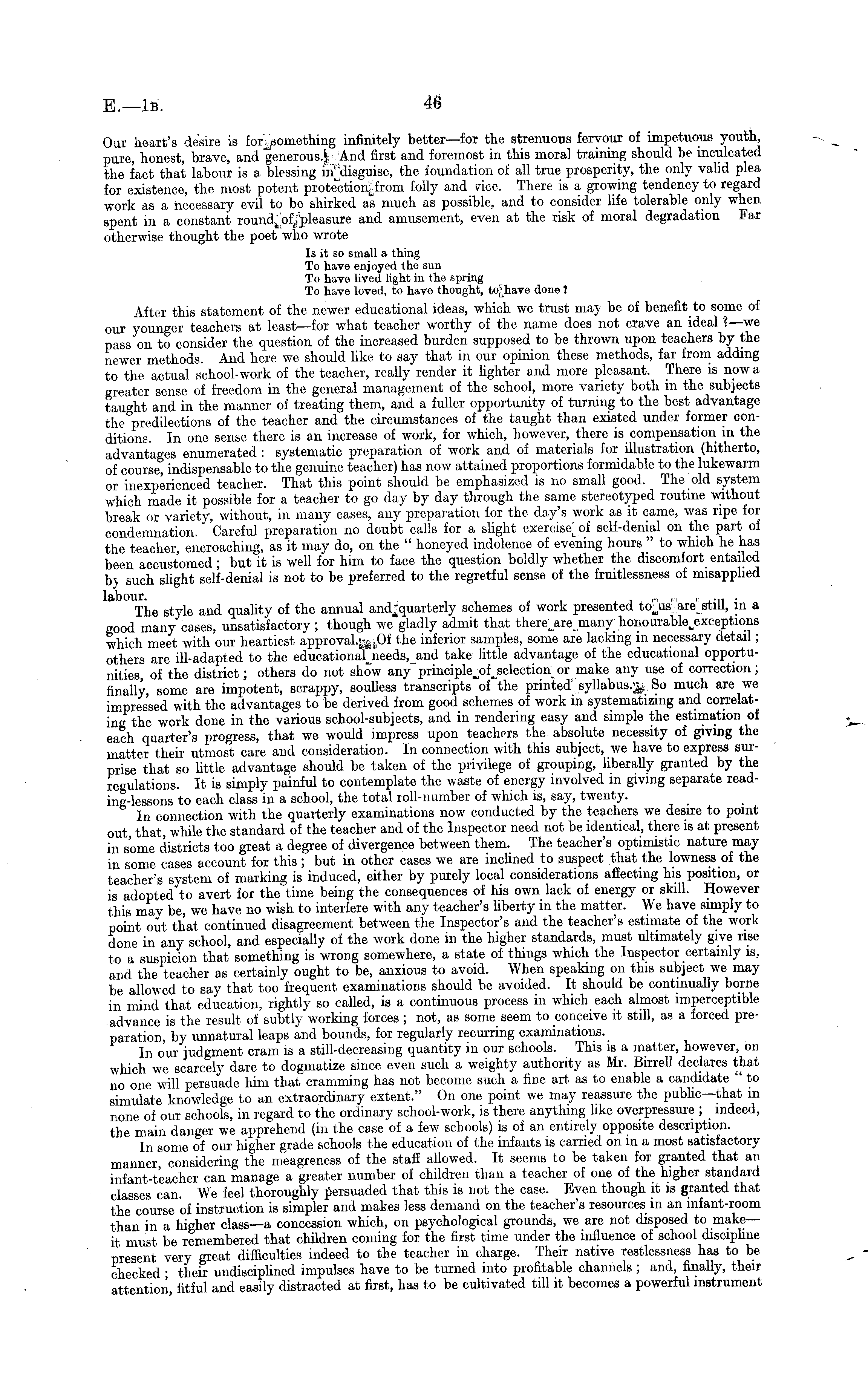 Our heart's desire is for/something infinitely better—for the strenuous fervour of impetuous youth, pure, honest, brave, and generous.! And first and foremost in this moral training should be inculcated the fact that labour is a blessing iil'disguise, the foundation of all true prosperity, the only valid plea for existence, the most potent protectionfrom folly and dee. There is a growing tendency to regard work as a necessary evil to be shirked as much as possible, and to consider life tolerable only when spent in a constant round k pf,ipleasure and amusement, even at the risk of moral degradation Far otherwise thought the poet who wrote Is it so small a thing To have enjoyed the sun To have lived light in the spring To have loved, to have thought, done T After this statement of the newer educational ideas, which we trust may be of benefit to some of our younger teachers at least—for what teacher worthy of the name does not crave an ideal ?—we pass on to consider the question of the increased burden supposed to be thrown upon teachers by the newer methods. And here we should like to say that in our opinion these methoda, far from adding to the actual achool-work of the teacher, really render it lighter and more pleaaant. There ia now a greater sense of freedom in the general management of the school, more variety both in the subjecta taught and in the manner of treating them, and a fuller opportunity of turning to the best advantage the predilections of the teacher and the circumstances of the taught than existed under former conditions. In one sense there is an increase of work, for which, however, there is compensation in the advantages enumerated : systematic preparation of work and of materials for illustration (hitherto, of course, indispensable to the genuine teacher) has now attained proportions formidable to the lukewarm or inexperienced teacher. That this point should be emphasized is no small good. The old system which made it possible for a teacher to go day by day through the same stereotyped routine without break or variety, without, in many cases, any preparation for the day's work as it came, was ripe for condemnation. Careful preparation no doubt calls for a slight self-denial on the part of the teacher, encroaching, as it may do, on the " honeyed indolence of evening hours " to which he has been accustomed ; but it is well for him to face the question boldly whether the discomfort entailed by such slight self-denial is not to be preferred to the regretful sense of the fruitlessness of misapplied The style and quality of the annual and;quarterly schemes of work presented are' still, in a good many cases, unsatisfactory ; though we gladly admit that which meet with our heartiest the inferior samples, some are lacking in necessary detail; others are ill-adapted to the educational needs, and take little advantage of the educational opportunities of the district; others do not show any - principle or make any use of correction; finally, some are impotent, scrappy, soulless transcripts of the printed' syllabus.,,,. So much are we impressed with the advantages to be derived from good schemes of work m systematizing and correlating the work done in the various school-subjects, and in rendering easy and simple the estimation of each quarter's progress, that we would impress upon teachers the absolute necessity of giving the matter their utmost care and consideration. In connection with this subject, we have to express surprise that so little advantage should be taken of the privilege of grouping, liberally granted by the regulations. It is simply painful to contemplate the waste of energy involved in giving separate read-ing-lessons to each class in a school, the total roll-number of which is, say, twenty. ' In connection with the quarterly examinations now conducted by the teachers we desire to point out that, while the standard of the teacher and of the Inspector need not be identical, there is at present in some districts too great a degree of divergence between them. The teacher's optimistic nature may in some cases account for this ; but in other cases we are inclined to suspect that the lowness of the teacher's system of marking is induced, either by purely local considerations affecting his position, or is adopted to avert for the time being the consequences of his own lack of energy or skill. However this may be, we have no wish to interfere with any teacher's liberty in the matter. We have simply to point out that continued disagreement between the Inspector's and the teacher's estimate of the work done in any school, and especially of the work done in the higher standards, must ultimately give rise to a suspicion that something is wrong somewhere, a state of things which the Inspector certainly is, and the teacher as certainly ought to be, anxious to avoid. When speaking on this subject we may be allowed to say that too frequent examinations should be avoided. It should be continually borne in mind that education, rightly so called, is a continuous process in which each almost imperceptible advance is the result of subtly working forces ; not, as some seem to conceive it still, as a forced preparation, by unnatural leaps and bounds, for regularly recurring examinations. In our judgment cram is a still-decreasing quantity in our schools. This is a matter, however, on which we scarcely dare to dogmatize since even such a weighty authority as Mr. Birrell declares that no one will persuade him that cramming has not become such a fine art as to enable a candidate " to simulate knowledge to an extraordinary extent." On one point we may reassure the public—that in none of our schools, in regard to the ordinary school-work, is there anything like overpressure ; indeed, the main danger we apprehend (in the case of a few schools) is of an entirely opposite description. In some of our higher grade schools the education of the infants is carried on in a most satisfactory ma