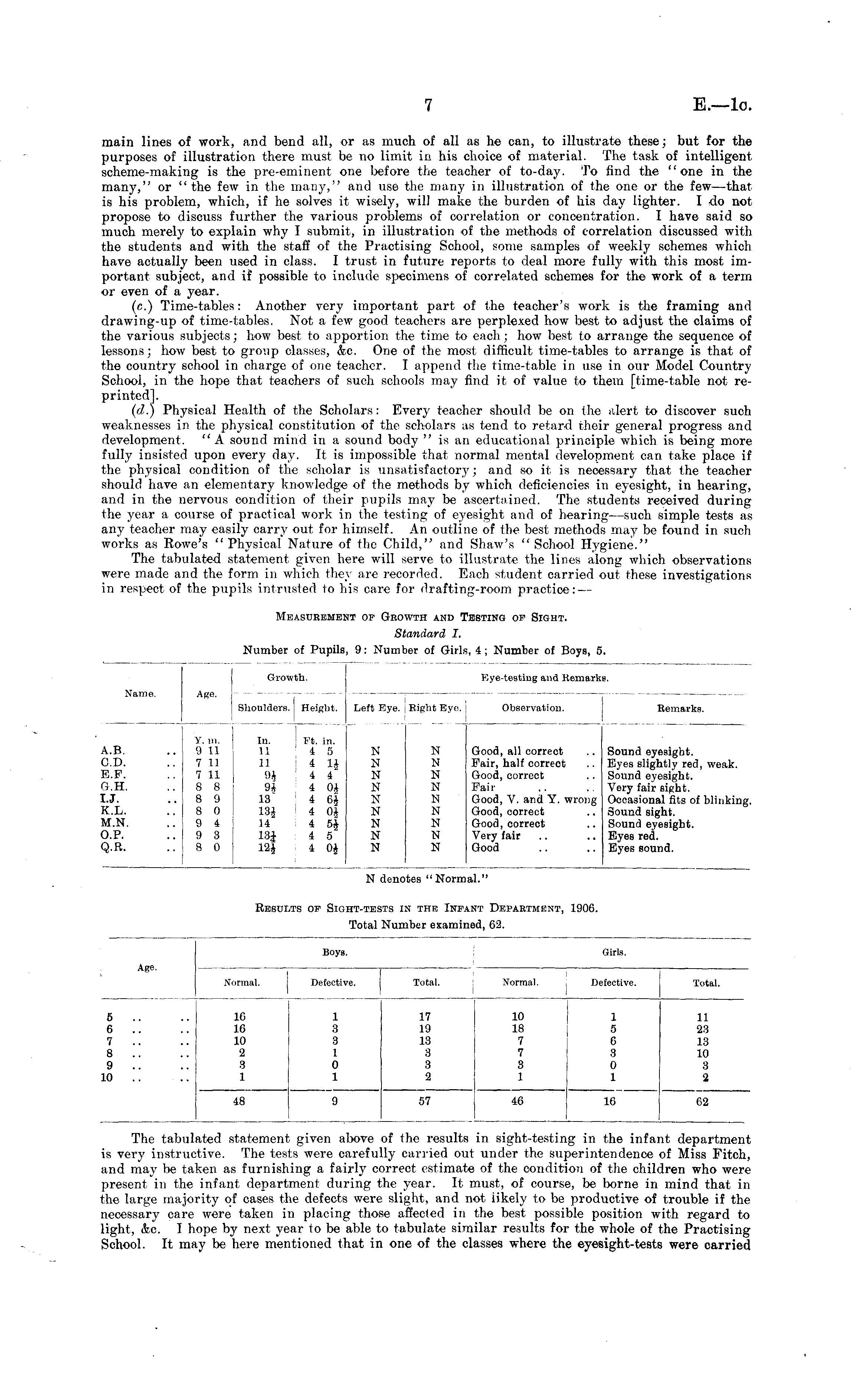main lines of work, and bend all, or as much of all as he can, to illustrate these; but for the purposes of illustration there must be no limit in his choice of material. The task of intelligent scheme-making is the pre-eminent one before the teacher of to-day. To find the "one in the many," or " the few in the many," and use the many in illustration of the one or the few —that is his problem, which, if he solves it wisely, will make the burden of his day lighter. Ido not propose to discuss further the various problems of correlation or concentration. I have said so much merely to explain why I submit, in illustration of the methods of correlation discussed with the students and with the staff of the Practising School, some samples of weekly schemes which have actually been used in class. I trust in future reports to deal more fully with this most important subject, and if possible to include specimens of correlated schemes for the work of a term or even of a year. (c.) Time-tables: Another very important part of the teacher's work is the framing and drawing-up of time-tables. Not a few good teachers are perplexed how best to adjust the claims of the various subjects; how best to apportion the time to each; how best to arrange the sequence of lessons; how best to group classes, &c. One of the most difficult time-tables to arrange is that of the country school in charge of one teacher. I append the time-table in use in our Model Country School, in the hope that teachers of such schools may find it of value to them [time-table not reprinted]. (d.) Physical Health of the Scholars: Every teacher should be on the <'Jert to discover such weaknesses in the physical constitution of the scholars as tend to retard their general progress and development. "A sound mind in a sound body "is an educational principle which is being more fully insisted upon every day. It is impossible that normal mental development can take place if the physical condition of the scholar is unsatisfactory; and so it is necessary that the teacher should have an elementary knowledge of the methods by which deficiencies in eyesight, in hearing, and in the nervous condition of their pupils may be ascertained. The students received during the year a course of practical work in the testing of eyesight and of hearing—such simple tests as any teacher may easily carry out for himself. An outline of the best methods may be found in such works as Rowe's "Physical Nature of the Child," and Shaw's "School Hygiene." The tabulated statement given here will serve to illustrate the lines along which observations were made and the form in which they are recorded. Each student carried out these investigations in respect of the pupils intrusted to his care for drafting-room practice: —