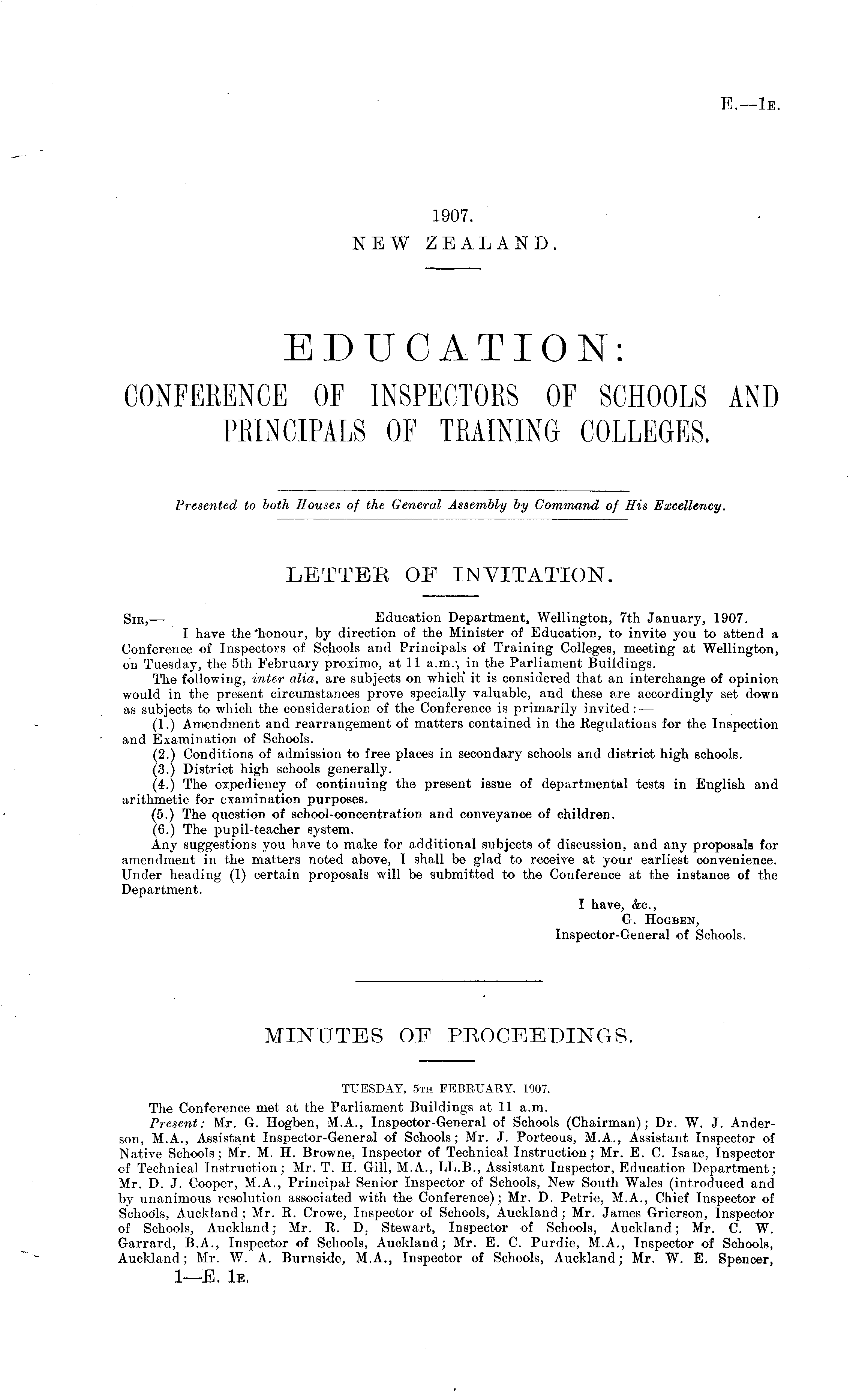 TUESDAY, sth FEBRUARY, 1907. The Conference met at the Parliament Buildings at 11 a.m. Present: Mr. G. Hogben, M.A., Inspector-General of Schools (Chairman); Dr. W. J. Anderson, M.A., Assistant Inspector-General of Schools; Mr. J. Porteous, M.A., Assistant Inspector of Native Schools; Mr. M. H. Browne, Inspector of Technical Instruction; Mr. E. C. Isaac, Inspector of Technical Instruction; Mr. T. H. Gill, M.A., LL.B., Assistant Inspector, Education Department; Mr. D. J. Cooper, M.A., Principal Senior Inspector of Schools, New South Wales (introduced and by unanimous resolution associated with the Conference); Mr. D. Petrie, M.A., Chief Inspector of Schools, Auckland ; Mr. R. Crowe, Inspector of Schools, Auckland ; Mr. James Grierson, Inspector of Schools, Auckland; Mr. R. D, Stewart, Inspector of Schools, Auckland; Mr. C. W. Garrard, 8.A., Inspector of Schools, Auckland; Mr. E. C. Purdie, M.A., Inspector of Schools, Auckland; Mr. W. A. Burnside, M.A., Inspector of Schools, Auckland; Mr. W. E. Spencer,