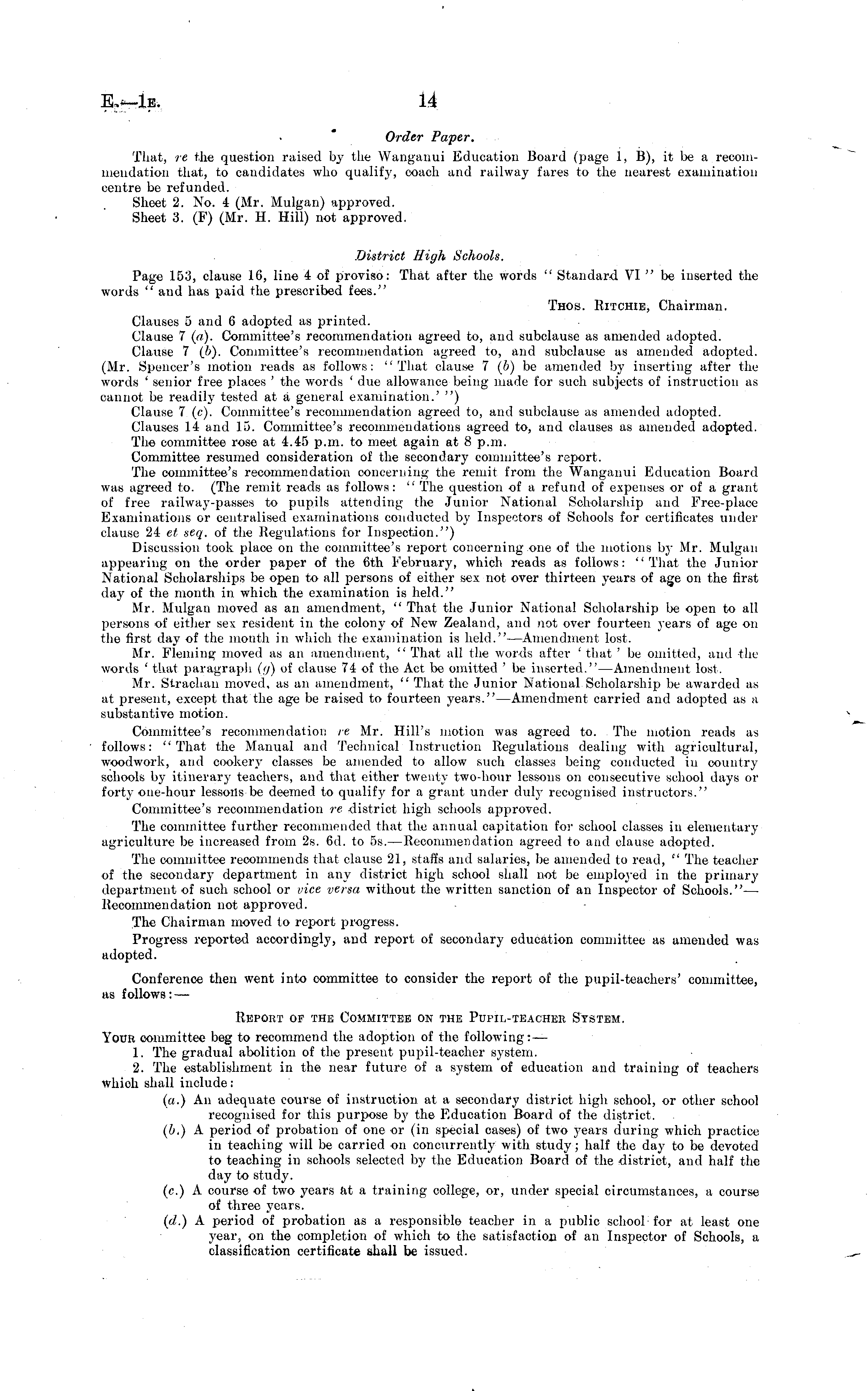 Order Paper. That, re the question raised by the Wanganui Education Board (page 1, B), it be a recommendation that, to candidates who qualify, coach and railway fares to the nearest examination centre be refunded. Sheet 2. No. 4 (Mr. Mulgan) approved. Sheet 3. (F) (Mr. H. Hill) not approved. District High Schools. Page 153, clause 16, line 4 of proviso: That after the words " Standard VI " be inserted the words " and has paid the prescribed fees." Thos. Ritchie, Chairman. Clauses 5 and 6 adopted as printed. Clause 7 (a). Committee's recommendation agreed to, and subclause as amended adopted. Clause 7 (b). Committee's recommendation agreed to, and subclause as amended adopted. (Mr. Spencer's motion reads as follows: "That clause 7 (h) be amended by inserting after the words ' senior free places ' the words ' due allowance being made for such subjects of instruction as cannot be readily tested at a general examination.' ") Clause 7 (c). Committee's recommendation agreed to, and subclause as amended adopted. Clauses 14 and 15. Committee's recommendations agreed to, and clauses as amended adopted. The committee rose at 4.45 p.m. to meet again at 8 p.m. Committee resumed consideration of the secondary committee's report. The committee's recommendation concerning the remit from the Wanganui Education Board was agreed to. (The remit reads as follows: " The question of a refund of expenses or of a grant of free railway-passes to pupils attending the Junior National Scholarship and Free-place Examinations or centralised examinations conducted by Inspectors of Schools for certificates under clause 24 et seq. of the Regulations for Inspection.") Discussion took place on the committee's report concerning one of the motions by Mr. Mulgan appearing on the order paper of the 6th February, which reads as follows: "That the Junior National Scholarships be open to all persons of either sex not over thirteen years of age on the first day of the month in which the examination is held." Mr. Mulgan moved as an amendment, " That the Junior National Scholarship be open to all persons of either sex resident in the colony of New Zealand, and not over fourteen years of age on the first day of the mouth in which the examination is held."—Amendment, lost. Mr. Fleming moved as an amendment, " That all the words after ' that ' be omitted, and the words ' that paragraph (g) of clause 74 of the Act be omitted ' be inserted." —Amendment lost. Mr. Strachan moved, as an amendment, " That the Junior National Scholarship be awarded as at present, except that the age be raised to fourteen years."—Amendment carried and adopted as a substantive motion. Committee's recommendation re Mr. Hill's motion was agreed to. The motion reads as follows: "That the Manual and Technical Instruction Regulations dealing with agricultural, woodwork, and cookery classes be amended to allow such classes being conducted in country schools by itinerary teachers, and that either twenty two-hour lessons on consecutive school days or forty one-hour lessons be deemed to qualify- for a grant under duly recognised instructors." Committee's recommendation re district high schools approved. The committee further recommended that the annual capitation for school classes in elementary agriculture be increased from 2s. 6d. to ss.—Recommendation agreed to and clause adopted. The committee recommends that clause 21, staffs and salaries, be amended to read, " The teacher of the secondary department in any district high school shall not be employed in the primary department of such school or vice versa without the written sanction of an Inspector of Schools."— Recommendation not approved. The Chairman moved to report progress. Progress reported accordingly, and report of secondary education committee as amended was adopted. Conference then went into committee to consider the report of the pupil-teachers' committee, as follows: — Report of the Committee on the Pupil-teacher System. Your committee beg to recommend the adoption of the following: — 1. The gradual abolition of the present pupil-teacher sj-stem. 2. The establishment in the near future of a system of education and training of teachers which shall include: (a.) An adequate course of instruction at a secondary district high school, or other school recognised for this purpose by the Education Board of the district. (b.) A period of probation of one or (in special cases) of two years during which practice in teaching will be carried on concurrently with study; half the day to be devoted to teaching in schools selected by the Education Board of the district, and half the day to study. (c.) A course of two years at a training college, or, under special circumstances, a course of three years. (d.) A period of probation as a responsible teacher in a public school for at least one year, on the completion of which to the satisfaction of an Inspector of Schools, a classification certificate shall be issued.