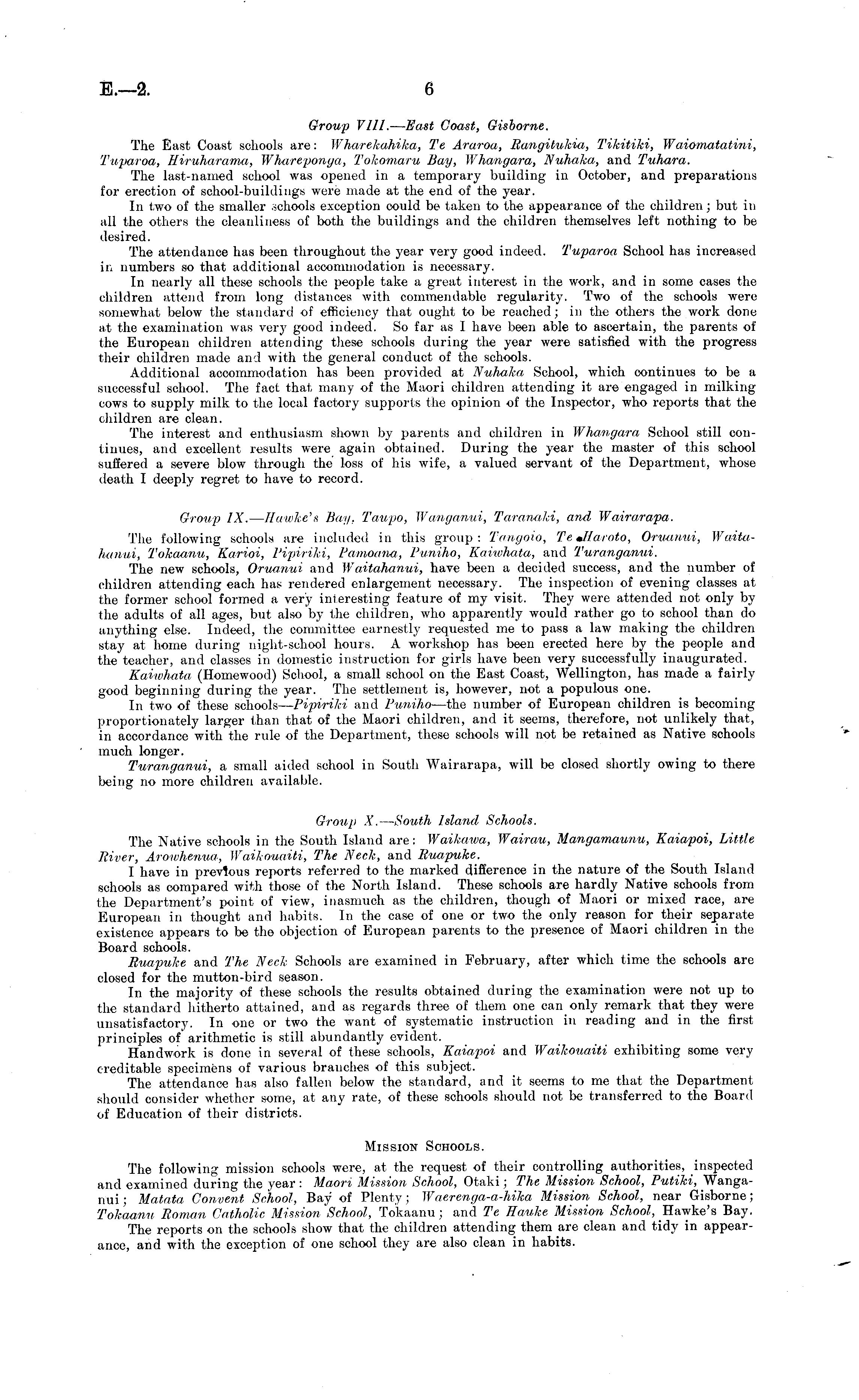 Group VIII. — East Coast, Gisborne. The East Coast schools are: Wharekahika, Te Ararou, Rangitukia, Tikitiki, Waiomatatini, Tuparoa, Hiruharania, Whareponya, Tokomaru Bay, Whangara, Nuhaka, and Tuhara. The last-named school was opened in a temporary building in October, and preparations for erection of school-buildings were made at the end of the year. In two of the smaller schools exception could be taken to the appearance of the children; but in all the others the cleanliness of both the buildings and the children themselves left nothing to be desired. The attendance has been throughout the year very good indeed. Tuparoa School has increased in numbers so that additional accommodation is necessary. In nearly all these schools the people take a great interest in the work, and in some cases the children attend from long distances with commendable regularity. Two of the schools were somewhat below the standard of efficiency that ought to be reached; in the others the work done at the examination was very good indued. So far as 1 have been able to ascertain, the parents of the European children attending these schools during the year were satisfied with the progress their children made and with the general conduct of the schools. Additional accommodation has been provided at Nuhaka School, which continues to be a successful school. The fact that many of the Maori children attending it are engage-d in milking cows to supply milk to the local factory supports the opinion of the Inspector, who reports that the children are clean. The interest and enthusiasm shown by parents and children in Whangara School still continues, and excellent results were again obtained. During the year the master of this school suffered a severe blow through the loss of his wife, a valued servant of the Department, whose death I deeply regret to have to record. Group IX. — Hawke's Bay, Taupo, Wanganui, Taranaki, and Wairarapa. The following schools are included in this group: Tangoio, Te allaroto, Oruanui, Waitaluinui, Tokaanu, Karioi, Pipiriki, Pamoana, Puniho, Kaiwhata, and Turanganui. The new schools, Oruanui and Waitahanui, have been a decided success, and the number of children attending each has rendered enlargement necessary. The inspection of evening classes at the former school formed a very interesting feature of my visit. They were attended not only by the adults of all ages, but also by the children, who apparently would rather go to school than do anything else. Indeed, the committee earnestly requested me to pass a law making the children stay at home during night-school hours. A workshop has been erected here by the people and the teacher, and classes in domestic instruction for girls have been very successfully inaugurated. Kaiwhata (Homewood) School, a small school on the East Coast, Wellington, has made a fairly good beginning during the year. The settlement is, however, not a populous one. In two of these schools — Pipiriki and Puniho —the number of European children is becoming proportionately larger than that of the Maori children, and it seems, therefore, not unlikely that, in accordance with the ride of the Department, these schools will not be retained as Native schools much longer. Turanganui, a small aided school in South Wairarapa, will be closed shortly owing to there being no more children available. Group X. — South Island Schools. The Native schools in the South Island are: Waikawa, Wairau, Mangamaunu, Kaiapoi, Little "River, Aroirhenua, Waikouaiti, The Neck, and Ruapuke. I have in previous reports referred to the marked difference in the nature of the South Island schools as compared with those of the North Island. These schools are hardly Native schools from the Department's point of view, inasmuch as the children, though of Maori or mixed race, are European in thought and habits. In the case of one or two the only reason for their separate existence appears to be the objection of European parents to the presence of Maori children in the Board schools. Ruapuke and The Neck Schools are examined in February, after which time the schools are closed for the mutton-bird season. In the majority of these schools the results obtained during the examination were not up to the standard hitherto attained, and as regards three of them one can only remark that they were unsatisfactory. In one or two the want of systematic instruction in reading and in the first principles of arithmetic is still abundantly evident. Handwork is done in several of these schools, Kaiapoi and Waikouaiti exhibiting some very creditable specimens of various branches of this subject. The attendance has also fallen below the standard, and it seems to me that the Department should consider whether some, at any rate, of these schools should not be transferred to the Board of Education of their districts. Mission Schools. The following mission schools were, at the request of their controlling authorities, inspected and examined during the year : Maori Mission School, Otaki; The Mission School, Putiki, Wanganui; Matnta Convent School, Bay of Plenty; Waerenga-a-hika Mission School, near Gisborne; Tokaanu Roman Catholic Mission School, Tokaanu; and Te Hauke Mission School, Hawke's Bay. The reports on the schools show that the children attending them are clean and tidy in appearance, and with the exception of one school they are also clean in habits.