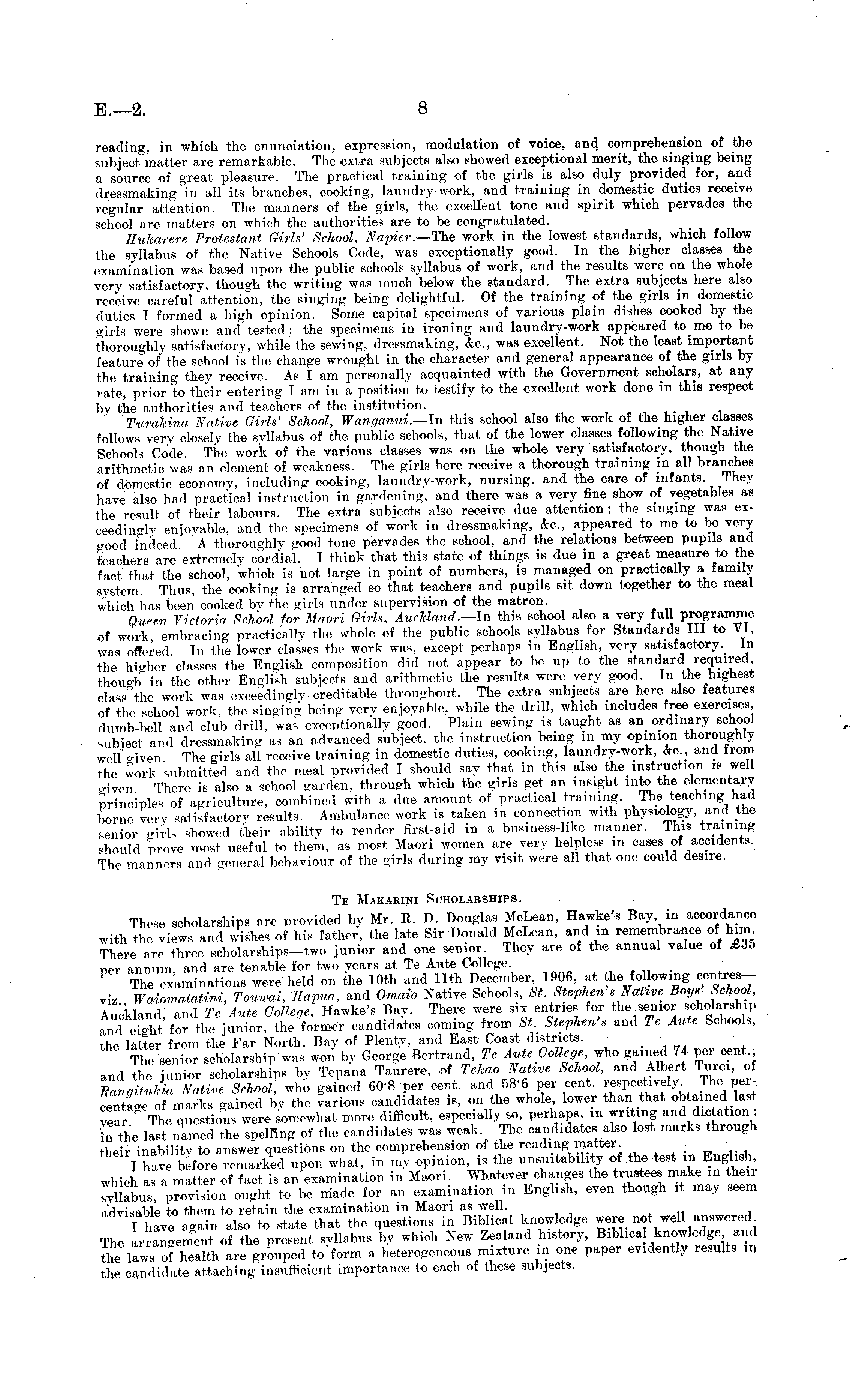 reading, in which the enunciation, expression, modulation of voice, and comprehension of the subject matter are remarkable. The extra subjects also showed exceptional merit, the singing being a source of great pleasure. The practical training of the girls is also duly provided for, and dressmaking in all its branches, cooking, laundry-work, and training in domestic duties receive regular attention. The manners of the girls, the excellent tone and spirit which pervades the school are matters on which the authorities are to be congratulated. ffukarere Protestant Girls' School, Napier. —The work in the lowest standards, which follow the syllabus of the Native Schools Code, was exceptionally good. In the higher classes the examination was based upon the public schools syllabus of work, and the results were on the whole very satisfactory, though" the writing was much below the standard. The extra subjects here also receive careful attention, the singing being delightful. Of the training of the girls in domestic duties I formed a high opinion. Some capital specimens of various plain dishes cooked by the girls were shown and tested ; the specimens in ironing and laundry-work appeared tome to be thoroughly satisfactory, while the sewing, dressmaking, ice., was excellent. Not the least important feature of the school is the change wrought in the character and general appearance of the girls by the training they receive. As lam personally acquainted with the Government scholars, at any rate, prior to their entering I am in a position to testify to the excellent work done in this respect by the authorities and teachers of the institution. ' Tural-ina Native Girls , School, Wanrjanui. —ln this school also the work of the higher classes follows very closely the syllabus of the public schools, that of the lower classes following the Native Schools Code The work of the various classes was on the whole very satisfactory, though the arithmetic was an element of weakness. The girls here receive a thorough training in all branches of domestic economy, including cooking, laundry-work, nursing, and the care of infants, lhey have also had practical instruction in gardening, and there was a very fine show of vegetables as the result of their labours. The extra subjects also receive due attention; the singing was exceedingly enjoyable, and the specimens of work in dressmaking, kc, appeared to me to be very pood indeed! A thoroughly good tone pervades the school, and the relations between pupils and teachers are extremely cordial. I think that this state of things is due in a great measure to the fact that the school, which is not large in point of numbers, is managed on practically a family system. Thus, the cooking is arranged so that teachers and pupils sit down together to the meal which has been cooked by the girls under supervision of the matron. Queen Victoria School for Maori Girls, Auckland.— ln this school also a very full programme of work embracing practically the whole of the public schools syllabus for Standards 111 to VI, was offered Tn the lower classes the work was, except perhaps in English, very satisfactory. In the higher classes the English composition did not appear to be up to the standard required though in the other English subjects and arithmetic the results were very good. In the highest class the work was exceedingly-creditable throughout, The extra subjects are here also features of the school work, the singing being very enjoyable, while the drill, which includes free exercises dumb-bell and club drill, was exceptionally good. Plain sewing is taught as an ordinary school subject and dressmaking as an advanced subject, the instruction being in my opinion thoroughly well eiven The "-iris all receive training in domestic duties, cooking, laundry-work, he, and from the work submitted and the meal provided I should say that in this also the instruction is well given There is nlso a school jjardon, through which the girls get an insight into the elementary principles of agriculture, combined with a due amount of practical training. The teaching had borne vorv satisfactory results. Ambulance-work is taken in connection with physiology, and the senior girls showed their ability to render first-aid in a business-like manner. This training should prove most useful to them, as most Maori women are very helpless in cases of accidents. The manners and general behaviour of the girls during my visit were all that one could desire. Tβ Makarini Scholarships. These scholarships are provided by Mr. R. D. Douglas McLean, Hawke's Bay in accordance with the views and wishes of his father, the late Sir Donald McLean, and in remembrance of him. There are three scholarships-two junior and one senior. They are of the annual value of £35 per annum and are tenable for two years at Te Aute College. P The examinations were held on the 10th and 11th December 1906, at the following centresviz Waiomaiatini, Towvcti, Napua, and Omaio Native Schools, St. Stephen s Native Boys School, Auckland and Te Aute College, Hawke's Bay. There were six entries for the senior scholarship id eSt'for the junior, the former candidates coming from St. Stephen's and Te Aute Schools, the latter from the Far North, Bay of Plenty, and East Coast districts. The senio™ scholarship was won by George Bertrand, Te Aute College, who gained 74 per cent and he junior scholarships by Tepana Taurere, of Tekao Native School, and Albert Turei, of EmgUukm Native School, who gained 608 per cent, and 58"6 per cent, The perSSe of marks gained by the various candidates is, on the whole lower than that obtained last rear Tho question* were somewhat more difficult, especially so, perhaps, in writing and dictation : in the lasilned the spelling of the candidates was weak. The candidates also lost marks through their inability to answer questions on the comprehension of the wading matter. I have before remarked upon what, in my opinion, is the unsu