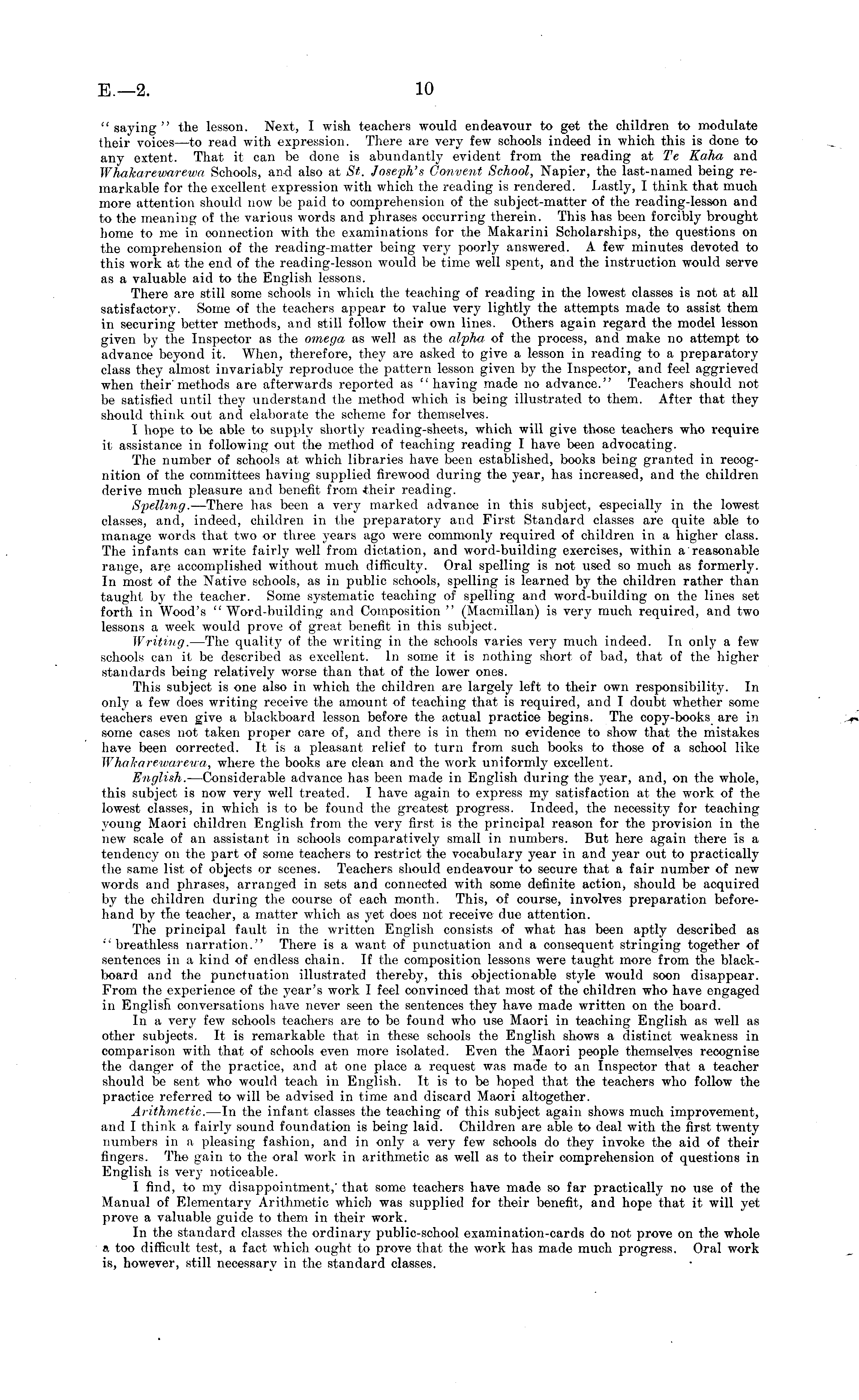 "saying" the lesson. Next, I wish teachers would endeavour to get the children to modulate their voices—to read with expression. There are very few schools indeed in which this is done to any extent. That it can be done is abundantly evident from the reading at Te Kaha and Whakarewarewa Schools, and also at St. Joseph's Convent School, Napier, the last-named being remarkable for the excellent expression with which the reading is rendered. Lastly, I think that much more attention should now be paid to comprehension of the subject-matter of the reading-lesson and to the meaning of the various words and phrases occurring therein. This has been forcibty brought home to me in connection with the examinations for the Makarini Scholarships, the questions on the comprehension of the reading-matter being very poorly answered. A few minutes devoted to this work at the end of the reading-lesson would be time well spent, and the instruction would serve as a valuable aid to the English lessons. There are still some schools in which the teaching of reading in the lowest classes is not at all satisfactory. Some of the teachers appear to value very lightly the attempts made to assist them in securing better methods, and still follow their own lines. Others again regard the model lesson given by the Inspector as the omega as well as the alpha of the process, and make no attempt to advance beyond it. When, therefore, they are asked to give a lesson in reading to a preparatory class they almost invariably reproduce the pattern lesson given by the Inspector, and feel aggrieved when their'methods are afterwards reported as "having made no advance." Teachers should not be satisfied until they understand the method which is being illustrated to them. After that they should think out and elaborate the scheme for themselves. I hope to be able to supply shortly reading-sheets, which will give those teachers who require it assistance in following out the method of teaching reading I have been advocating. The number of schools at which libraries have been established, books being granted in recognition of the committees having supplied firewood during the year, has increased, and the children derive much pleasure and benefit from their reading. Spelling. —There has been a very marked advance in this subject, especially in the lowest classes, and, indeed, children in the preparatory and First Standard classes are quite able to manage words that two or three years ago were commonly required of children in a higher class. The infants can write fairly well from dictation, and word-building exercises, within a reasonable range, are accomplished without much difficulty. Oral spelling is not used so much as formerly. In most of the Native schools, as in public schools, spelling is learned by the children rather than taught by the teacher. Some systematic teaching of spelling and word-building on the lines set forth in Wood's "Word-building and Composition " (Macmillan) is very much required, and two lessons a week would prove of great benefit in this subject. Writing. —The quality of the writing in the schools varies very much indeed. In only a few schools can it be described as excellent. In some it is nothing short of bad, that of the higher standards being relatively worse than that of the lower ones. This subject is one also in which the children are largely left to their own responsibilit}-. In only a few does writing receive the amount of teaching that is required, and I doubt whether some teachers even give a blackboard lesson before the actual practice begins. The copy-books are in some cases not taken proper care of, and there is in them no evidence to show that the mistakes have been corrected. It is a pleasant relief to turn from such books to those of a school like Whakarewarewa, where the books are clean and the work uniforml} - excellent. English. —Considerable advance has been made in English during the year, and, on the whole, this subject is now very well treated. I have again to express my satisfaction at the work of the lowest classes, in which is to be found the greatest progress. Indeed, the necessity for teaching young Maori children English from the very first is the principal reason for the provision in the new scale of an assistant in schools comparatively small in numbers. But here again there is a tendency on the part of some teachers to restrict the vocabulary year in and year out to practically the same list of objects or scenes. Teachers should endeavour to secure that a fair number of new words and phrases, arranged in sets and connected with some definite action, should be acquired by the children during the course of each month. This, of course, involves preparation beforehand by the teacher, a matter which as yet does not receive due attention. The principal fault in the written English consists of what has been aptly described as "breathless narration." There is a want of punctuation and a consequent stringing together of sentences in a kind of endless chain. If the composition lessons were taught more from the blackboard and the punctuation illustrated thereby, this objectionable style would soon disappear. From the experience of the year's work I feel convinced that most of the children who have engaged in English conversations have never seen the sentences they have made written on the board. In a very few schools teachers are to be found who use Maori in teaching English as well as other subjects. It is remarkable that in these schools the English shows a distinct weakness in comparison with that of schools even more isolated. Even the Maori people themselves recognise the danger of the practice, and at one place a request was made to an Inspector that a teacher should be sent who would teach in English. It is to be hoped that the teachers who follow the practice referred to will be advised in time and discard Maori altogether. Arithmetic. —ln the infant classes the teachin