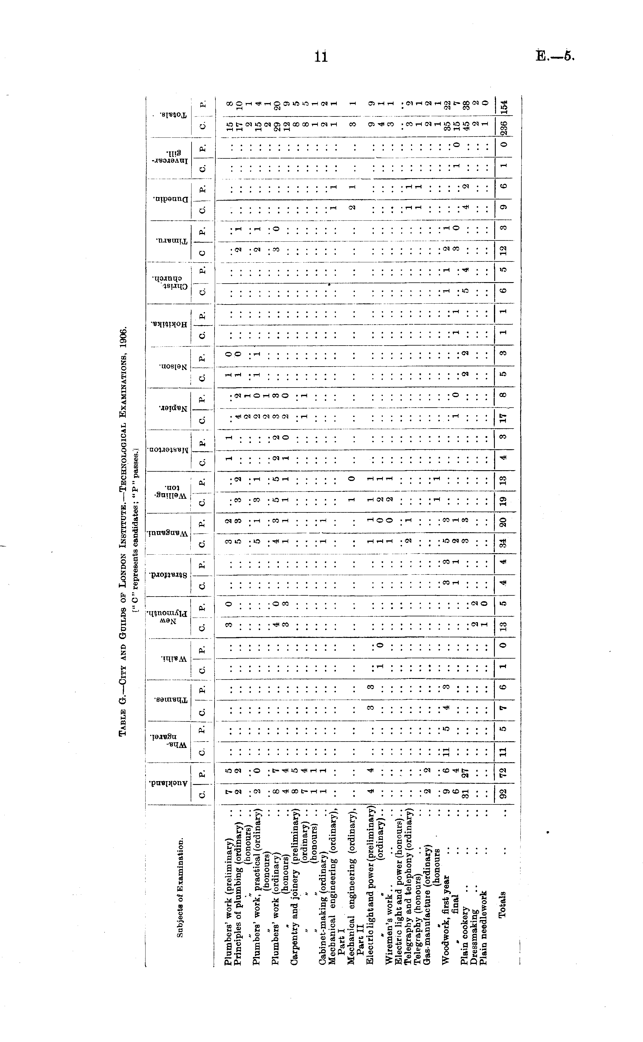 Table G. —City and Guilds of London Institute.— Technological Examinations, 1906. [" C" represents candidates; "P" passes.]