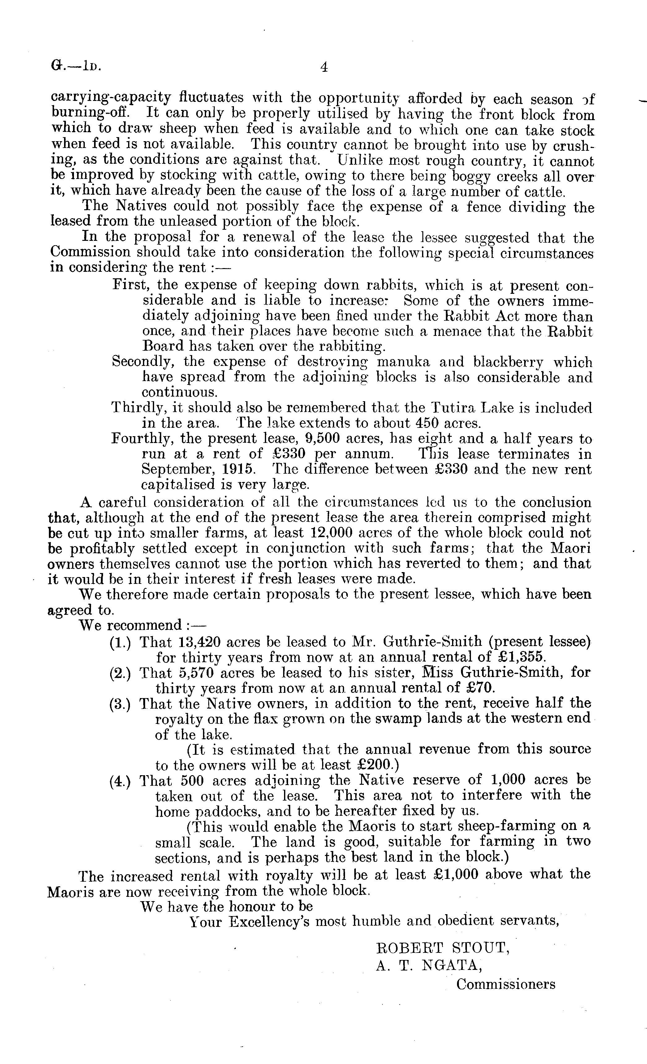 carrying-capacity fluctuates with the opportunity afforded by each season of burning-off. It can only be properly utilised by'having the front block from which to draw sheep when feed is available and to which one can take stock when feed is not available. This country cannot be brought into use by crushing, as the conditions are against that. Unlike most rough country, it cannot be improved by stocking with cattle, owing to there being boggy creeks all over it, which have already been the cause of the loss of a large number of cattle. The Natives could not possibly face the expense of a fence dividing the leased from the unleased portion of the block. In the proposal for a renewal of the lease the lessee suggested that the Commission should take into consideration the following special circumstances in considering the rent: — First, the expense of keeping down rabbits, which is at present considerable and is liable to increase: Some of the owners immediately adjoining have been fined under the Rabbit Act more than once, and their places have become such a menace that the Rabbit Board has taken over the rabbiting. Secondly, the expense of destroying manuka and blackberry which have spread from the adjoining blocks is also considerable and continuous. Thirdly, it should also be remembered that the Tutira Lake is included in the area. The lake extends to about 450 acres. Fourthly, the present lease, 9,500 acres, has eight and a half years to run at a rent of £330 per annum. This lease terminates in September, 1915. The difference between £330 and the new rent capitalised is very large. A careful consideration of all the circumstances led us to the conclusion that, although at the end of the present lease the area therein comprised might be cut up into smaller farms, at least 12,000 acres of the whole block could not be profitably settled except in conjunction with such farms; that the Maori owners themselves cannot use the portion which has reverted to them; and that it would be in their interest if fresh leases were made. We therefore made certain proposals to the present lessee, which have been agreed to. We recommend : — (1.) That 13,420 acres be leased to Mr. Guthrie-Smith (present lessee) for thirty years from now at an annual rental of £1,355. (2.) That 5,570 acres be leased to his sister, Miss Guthrie-Smith, for thirty years from now at an annual rental of £70. (3.) That the Native owners, in addition to the rent, receive half the royalty on the flax grown on the swamp lands at the western end of the lake. (It is estimated that the annual revenue from this source to the owners will be at least £200.) (4.) That 500 acres adjoining the Native reserve of 1,000 acres be taken out of the lease. This area not to interfere with the home paddocks, and to be hereafter fixed by us. (This would enable the Maoris to start sheep-farming on a small scale. The land is good, suitable for farming in two sections, and is perhaps the best land in the block.) The increased rental with royalty will be at least £1,000 above what the Maoris are now receiving from the whole block. We have the honour to be Your Excellency's most humble and obedient servants, ROBERT STOUT, A. T. NGATA, Commissioners