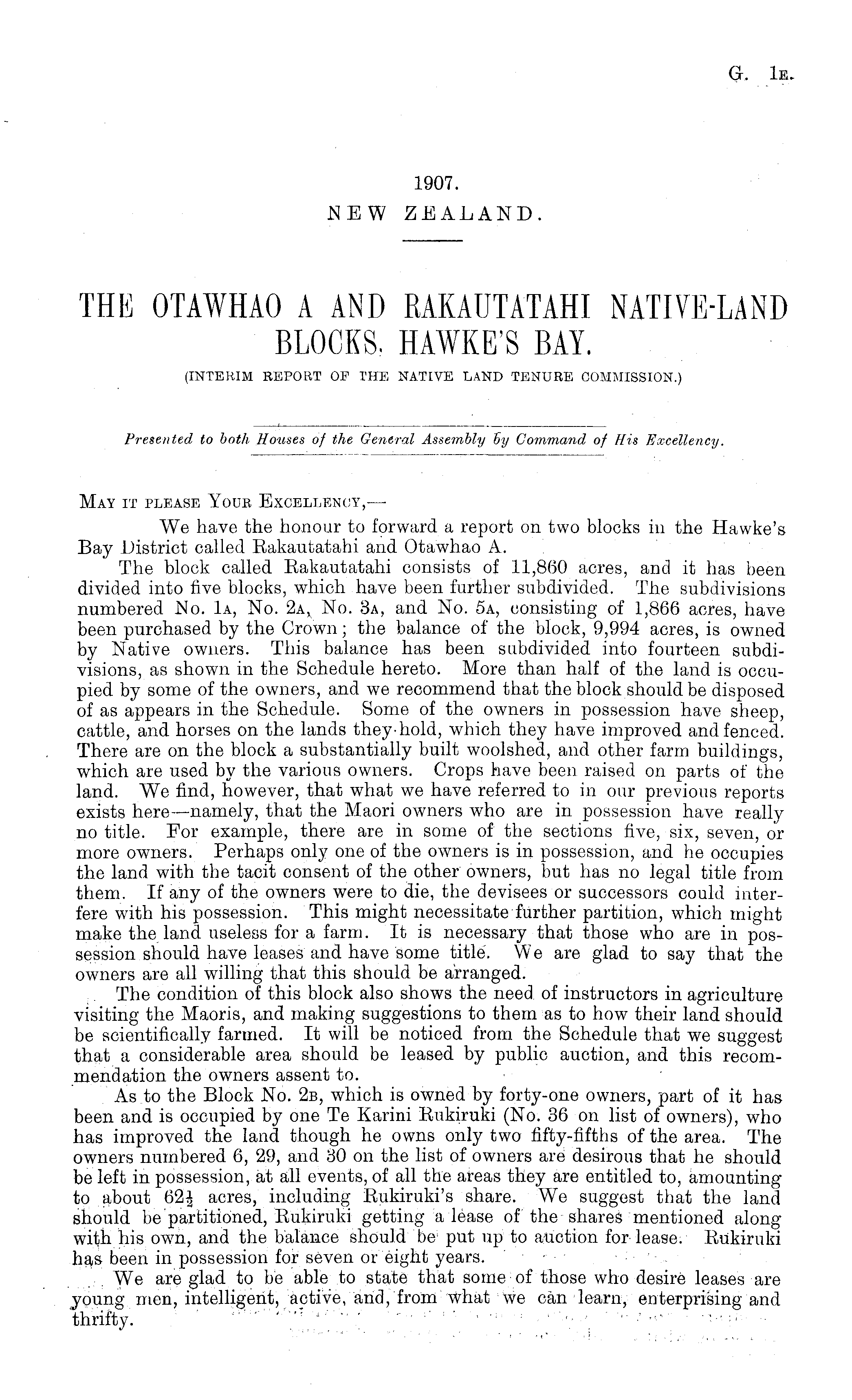 May it please Your Excellency,—■ We have the honour to forward a report on two blocks in the Hawke's Bay District called Rakautatahi and Otawhao A. The block called Rakautatahi consists of 11,860 acres, and it has been divided into five blocks, which have been further subdivided. The subdivisions numbered No. la, No. 2a, No. 3a, and No. sa, consisting of 1,866 acres, have been purchased by the Crown; the balance of the block, 9,994 acres, is owned by Native owners. This balance has been subdivided into fourteen subdivisions, as shown in the Schedule hereto. More than half of the land is occupied by some of the owners, and we recommend that the block should be disposed of as appears in the Schedule. Some of the owners in possession have sheep, cattle, and horses on the lands theyhold, which they have improved and fenced. There are on the block a substantially built woolshed, and other farm buildings, which are used by the various owners. Crops have been raised on parts of the land. We find, however, that what we have referred to in our previous reports exists here —namely, that the Maori owners who are in possession have really no title. For example, there are in some of the sections five, six, seven, or more owners. Perhaps only one of the owners is in possession, and he occupies the land with the tacit consent of the other owners, but has no legal title from them. If any of the owners were to die, the devisees or successors could interfere with his possession. This might necessitate further partition, which might make the land useless for a farm. It is necessary that those who are in possession should have leases and have some title. We are glad to say that the owners are all willing that this should be arranged. The condition of this block also shows the need of instructors in agriculture visiting the Maoris, and making suggestions to them as to how their land should be scientifically farmed. It will be noticed from the Schedule that we suggest that a considerable area should be leased by public auction, and this recommendation the owners assent to. As to the Block No. 2b, which is owned by forty-one owners, part of it has been and is occupied by one Te Karini Rukiruki (No. 36 on list of owners), who has improved the land though he owns only two fifty-fifths of the area. The owners numbered 6, 29, and 30 on the list of owners are desirous that he should be left in possession, at all events, of all the areas they are entitled to, amounting to about acres, including Rukiruki's share. VVe suggest that the land should be partitioned, Rukiruki getting a lease of the shares mentioned along with his own, and the balance should be put up to auction for lease. Rukiruki has been in possession for seven or eight years. We are glad to be able to state that some of those who desire leases are young men, intelligent, active, and, from what we can learn, enterprising and thrifty. ' ' : '