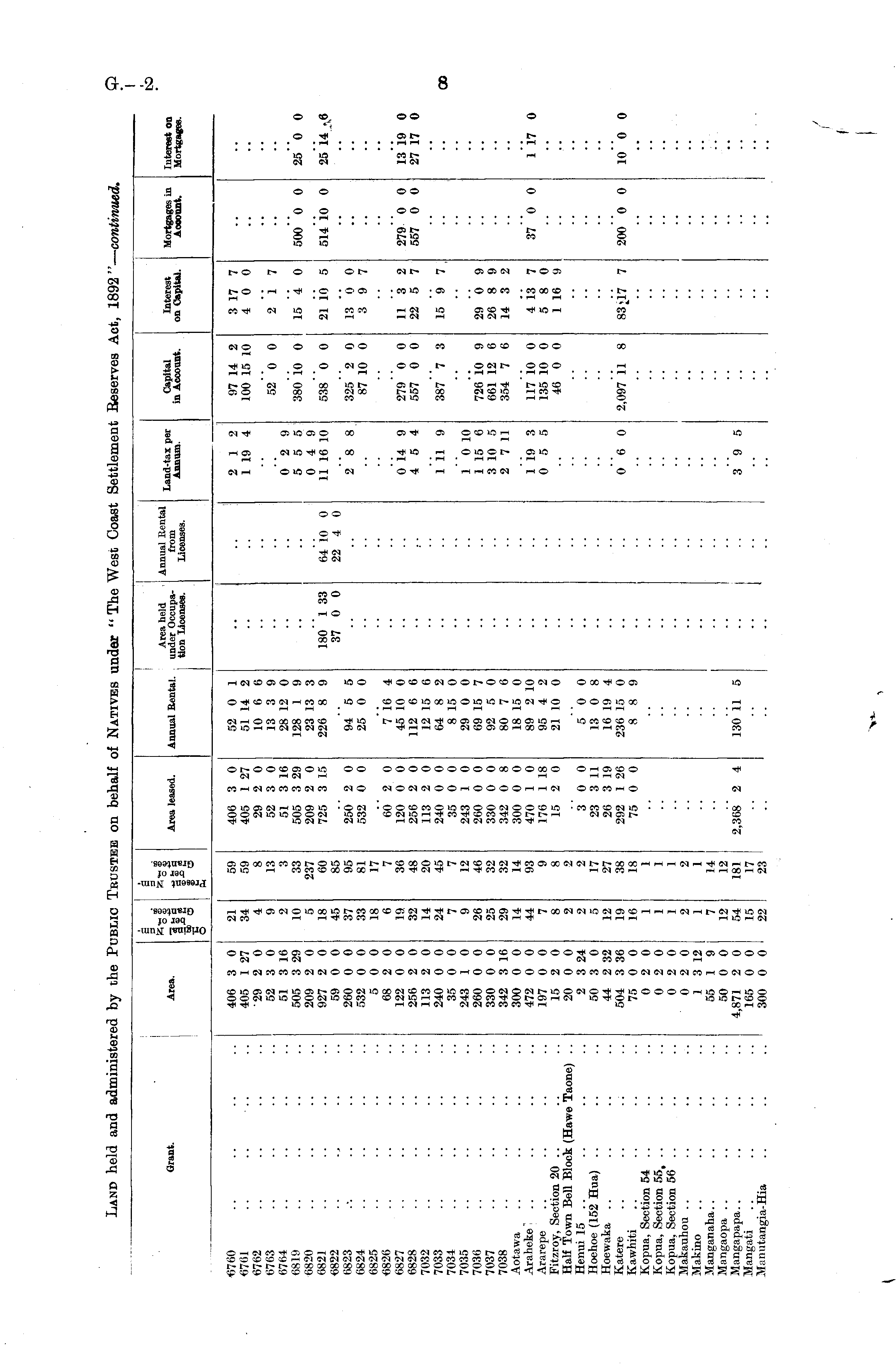 Grant. Area. Pi Ft Area leased. Area held Annual Rental T . t Annual Rental. under Occupa- from a™ ™ p tton Licensee. Licenses. Annum. Capital in Account. Interest on Capital. Mortgages in Interest on Acoount. Mortgages. ■6760 6761 6763 6764 6819 6820 (1821 6822 6823 6824 6825 6826 6827 6828 7032 7033 7034 7035 7036 7037 7038 Aotawa Araheke .. Ararepe Fitzroy, Section 20 .. Half Town Bell Block (Hawe Taone) .. Henui 15 Hoehoe (152 Hua) Hoewaka .. Katere Kawhiti Kopua, Section 54 .. Kopua, Section 55, Kopua, Section 56 .. Makauhou Makino Manganaha Mangaopa Mangapapa Mangati Miinutangia-Hia 406 3 0 405 1 27 29 2 0 52 3 0 51 3 16 505 3 29 209 2 0 927 2 0 59 0 0 260 0 0 532 0 0 5 0 0 68 2 0 122 0 0 256 2 0 113 2 0 240 0 0 35 0 0 243 1 0 260 0 0 330 0 0 342 3 16 300 0 0 472 0 0 197 0 0 15 2 0 20 0 0 2 3 24 50 3 0 44 2 32 504 3 36 75 0 0 0 2 0 0 2 0 0 2 0 0 2 0 1 3 12 55 1 9 50 0 0 4,871 2 0 165 0 0 300 0 0 21 34 4 9 2 JO 5 IS 4.5 33 18 6 19 32 14 24 7 9 26 29 14 44 7 8 2 2 5 12 19 Iβ 1 1 1 2 1 7 12 54 22 59 59 8 13 3 33 237 60 85 95 81 17 7 36 48 20 45 7 12 46 32 32 14 93 9 8 2 2 17 27 38 18 1 1 1 2 1 14 12 181 17 23 406 3 0 405 1 27 29 2 0 52 3 0 51 3 16 505 3 29 209 2 0 725 3 15 250 2 0 532 0 0 60 2 0 120 0 0 256 2 0 113 2 0 240 0 0 35 0 0 243 1 0 260 0 0 330 0 0 342 0 8 300 0 0 470 1 0 176 1 18 15 2 0 52 0 1 51 14 2 10 6 6 13 3 9 28 12 0 128 1 9 23 13 3 226 8 9 94 5 5 25 0 0 7 16 4 45 10 0 112 6 6 12 15 6 64 8 2 8 15 0 29 0 0 69 15 7 92 5 0 80 7 6 18 15 0 89 2 10 95 4 2 21 10 0 180 1 33 37 0 0 64 io 0 22 4 0 2 12 1 19 4 0 2 9 5 5 5 0 4 9 11 16 10 2"8 8 0 14 9 4 5 4 1 il 9 1 0 10 1 15 6 3 10 5 2 7 11 97 14 2 100 15 10 52 0 0 380 10 0 538 0 0 325 2 0 87 10 0 279 0 0 557 0 0 387 7 3 726 10 9 661 12 6 354 7 6 3 17 7 4 0 0 2 17 15 4 0 21 io 5 13 0 0 3 9 7 11 3 2 22 5 7 15 9 7 29 0 9 26 8 9 14 3 2 500 0 0 514 10 0 279 0 0 557 0 0 25 0 ( 25 14 A < 13 19 ( 27 17 ( 1 19 3 0 5 5 117 10 0 135 10 0 46 0 0 4 13 7 5 8 0 1 16 9 37 0 0 1 17 ( 3 0 0 23 3 11 26 3 19 292 1 26 75 0 0 5 0 0 13 0 8 16 19 4 236 15 0 8 8 9 0 6 0 2,097 11 8 7 200 0 0 10 0 I .. • 2,368 2 4 130 11 5 3 9 5 - • - I