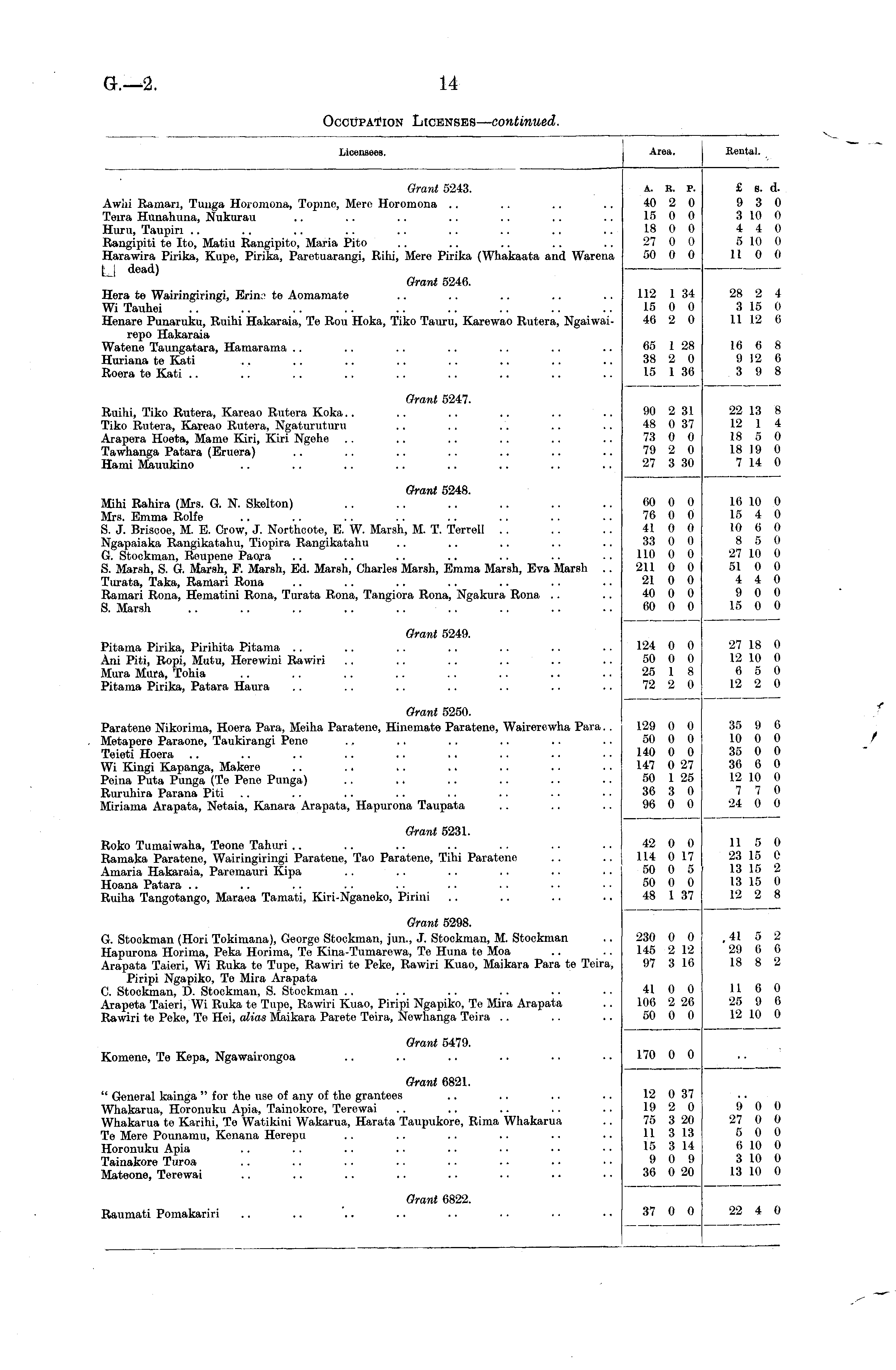 Licensees. Area. Rental. Grant 5243. A. B. P. 40 2 0 15 0 0 18 0 0 27 0 0 50 0 0 £ s. d. 9 3 0 3 10 0 4 4 0 5 10 0 110 0 Awlii Raman, Tunga Horomoiia, Topine, Mere Horomona Teira Hunahuna, Nukurau Hum, Taupiri .. Rangipiti te Ito, Matiu Rangipito, Maria Pito Harawira Pirika, Kupe, Pirika, Paretuarangi, Rihi, Mere Pirika (Whakaata and Warena [J dead) Grant 5246. Hera te Wairingiringi, Erin: 1 to Aomamate Wi Tauhei Henare Punaruku, Ruihi Hakaraia, Te Rou Hoka, Tiko Tauru, Karewao Rutera, Ngaiwairepo Hakaraia Watene Taungatara, Hamarama Huriana te Kati Roora te Kati 112 1 34 15 0 0 40 2 0 28 2 4 3 15 0 11 12 (i 05 1 28 38 2 0 15 1 30 16 6 8 9 12 0 3 9 8 Grant 5247. Ruihi, Tiko Rutera, Kareao Rutora Koka Tiko Rutera, Kareao Rutera, Ngaturuturu Arapera Hoeta, Maine Kiri, Kiri Ngehe Tawhanga Patara (Eruora) Hami Mauukino 9(1 2 31 48 0 37 73 0 0 79 2 0 27 3 30 22 13 8 12 1 4 18 5 0 18 19 0 7 14 0 Grant 5248. Mihi Rahira (Mrs. G. N. Skelton) Mrs. Emma Rolfe S. J. Briscoe, M. E. Crow, J. Northcote, E. W. Marsh, M. T. Terrell Ngapaiaka Rangikatahu, Tiopira Rangikatahu G. Stockman, Reupene Paoia S. Marsh, S. G. Marsh, F. Marsh, Ed. Marsh, Charles Marsh, Emma Marsh, Eva Marsh .. Turata, Taka, Raniari Rona Ramari Rona, Hematini Rona, Turata Rona, Tangiora Rona, Ngakura Rona .. S. Marsh 60 0 0 70 0 0 41 0 0 33 0 0 110 0 0 211 0 0 21 0 0 40 0 0 00 0 0 16 10 0 15 4 0 10 0 0 8 5 0 27 10 0 51 0 0 4 4 0 9 0 0 15 0 0 Grant 5249. 27 18 0 12 10 0 6 5 0 12 2 0 Pitama Pirika, Pirihita Pitama Ani Piti, Ropi, Mutu, Herewini Rawiri Mura Mura, Tohia Pitama Pirika, Patara Haura 124 0 0 50 0 0 25 1 8 72 2 0 Grant 5250. Paratene Nikorima, Hoera Para, Meiha Paratene, Hinemate Paratene, Wairerewha Para. . Metapere Paraone, Taukirangi Pene Teieti Hoera Wi Kingi Kapanga, Makere Peina Puta Punga (Te Pene Punga) Ruruhira Parana Piti Miriama Arapata, Netaia, Kanara Arapata, Hapurona Taupata 129 0 0 50 0 0 140 0 0 147 0 27 50 1 25 36 3 0 96 0 0 35 9 6 10 0 0 35 0 0 36 6 0 12 10 0 7 7 0 24 0 0 Grant 5231. 11 5 0 23 15 0 13 15 2 13 15 0 12 2 8 Roko Tumaiwaha, Teone Tahuri Ramaka Paratene, Wairingiringi Paratene, Tao Paratene, Tihi Parateno Amaria Hakaraia, Paremauri Kipa Hoana Patara Ruiha Tangotango, Maraea Tamati, Kiri-Nganeko, Pirini 42 0 0 114 0 17 50 0 5 50 0 0 48 1 37 Grant 5298. G. Stockman (Hori Tokimana), George Stockman, jun., J. Stockman, M. Stockman Hapurona Horima, Peka Horima, Te Kina-Tumarewa, Te Huna te Moa Arapata Taieri, Wi Ruka te Tupe, Rawiri te Peke, Rawiri Kuao, Maikara Para te Teira, Piripi Ngapiko, Te Mira Arapata C. Stockman, D. Stockman, S. Stockman Arapeta Taieri, Wi Ruka te Tupe, Rawiri Kuao, Piripi Ngapiko, To Mira Arapata Rawiri te Peke, Te Hei, alias Maikara Parete Teira, Newhanga Teira 2,'JO 0 0 145 2 12 97 3 16 , 41 ."> -1 29 0 0 18 8 2 41 0 0 106 2 26 50 0 0 11 6 0 25 9 6 12 10 0 Grant 5479. Komene, Te Kepa, Ngawairongoa 170 0 0 Grant 6821. " General kainga " for the use of any of the grantees Whakarua, Horonuku Apia, Tainokore, Terewai Whakarua te Karihi, Te Watikini Wakarua, Harata Taupukore, Rima Whakarua Te Mere Pounamu, Kenana Herepu Horonuku Apia Tainakore Turoa Mateone, Terewai 12 0 37 19 2 0 75 3 20 11 3 13 15 3 14 9 0 9 36 0 20 9 0 0 27 0 0 5 0 0 (i 10 0 3 10 0 13 10 0 Grant 6822. 22 4 0 Raumati Pomakariri 37 0 0