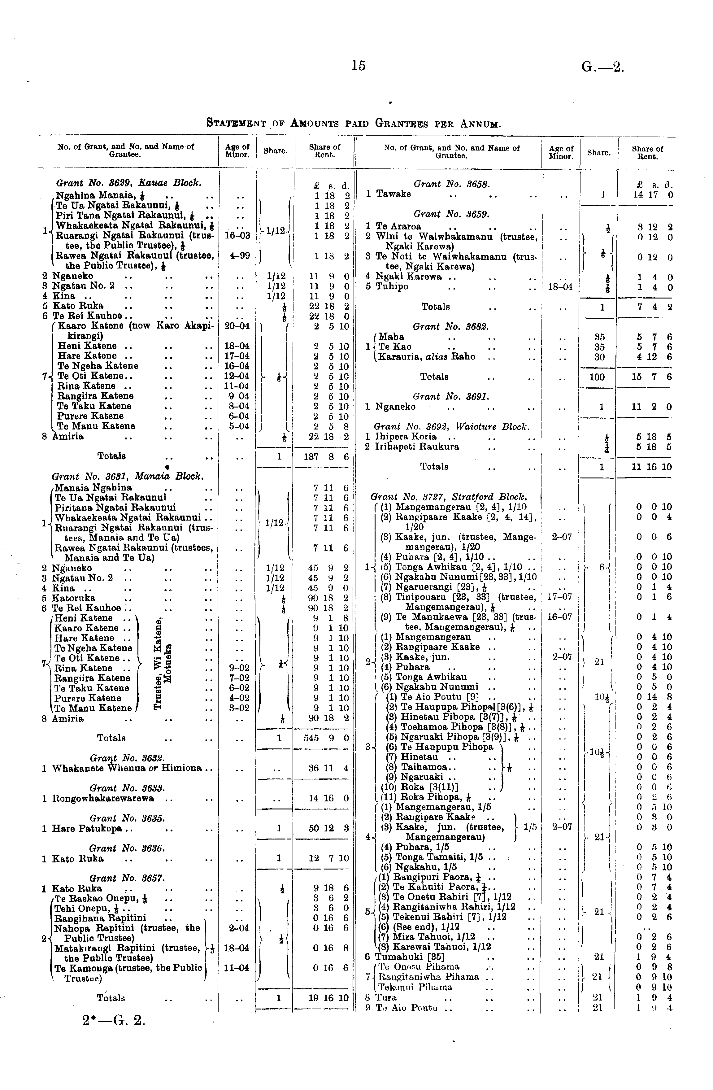 No. of Grant, and No. and Name o( Grantee. Age of Minor. »•«*■ s tr' Grant No. 8629, Rauae Block. Ngahina Manaia, J .. Te Ua Ngatai Rakaunui, J Firi Tana Ngatai Rakaunui, J .. Whakaekeata Ngatai Rakaunui, J Ruarangi Ngatai Rakaunui (trustee, the Public Trustee), £ Rawea Ngatai Rakaunui (trustee, the Publio Trustee), J : Nganeko I Ngatau No. 2 .. : Kinft .. i Eato Ruka i Te Rei Kauhoe .. fKaaro Katene (now Karo Akapikirangi) Heni Katene Hare Katene Te Ngeha Katene -{ Te Oti Katene.. Rina Katene Rangiira Katene Te Taku Katene Purere Katene Te Manu Katene i Amiria I -1/12-; (| £ r. a. i 1 18 2 1 18 2 1 18 2 1/12J 1 18 2 lllJ i\ 1 18 2 16-03 4-99 li 1 18 2 1/12 1/12 1/12 j i i ! 1/12 11 9 0 1/12 11 9 0 1/12 11 9 0 i 22 18 2 i j 22 18 0 f| 2 5 10 20-04 18-04 17-04 16-04 12-04 11-04 9 04 8-04 6-04 5-04 2 5 10 2 5 10 2 5 10 - i-{ 2 5 10 2 5 10 2 5 10 2 5 10 2 5 10 [ 2 5 8 is 22 18 2 Totals i 1 137 8 6 Grant No. 3631, Manaia Block. Manaia Ngabina Te Ua Ngatai Rakaunui Piritana Ngatai Rakaunui Wbakaekeata Ngatai Rakaunui .. ' Ruarangi Ngatai Rakaunui (trustees, Manaia and Te Ua) Rawea Ngatai Rakaunui (trustees, Manaia and Te Ua) Nganeko Ngatau No. 2 .. Kina .. Katoruka Te Rei Kauhoe Heni Katene .. \ Kaaro Katene .. g Hare Katene .. -g Te Ngeha Katene M j§ , Te Oti Katene ..I •"« \ Rina Katene .. f > -g Rangiira Katene g g Te Taku Katene Purere Katene g Te Manu Katene / Amiria 1/12i 1/12 1/12 1/12 7 11 6 7 11 6 7 11 6 1/12 7 U 6 1/12 " 7 11 6 7 11 6 1/12 45 9 2 1/12 45 9 2 1/12 45 9 0 is 90 18 2 I 90 18 2 j 9 18 9 1 10 9 1 10 9 1 10 J 9 1 10 " * K 9 1 10 9 1 10 9 1 10 9 1 10 9 1 10 4 90 18 2 9-02 7-02 6-02 4-02 3-02 4 Totals i 1 545 9 0 Grant No. 3632. Whakanete Whenua or Himiona .. 36 11 4 Grant No. 3633. Rongowhakarewarewa 14 16 0 Grant No. 3635. Hare Patukopa 1 50 12 3 Grant No. 3636. Kato Ruka 1 12 7 10 Grant No. 3657. Kato Ruka ,. /Te Raekao Onepu, | Tehi Onepu, J .. Rangihana Rapitini Nahopa Rapitini (trustee, the Publio Trustee) Matakirangi Rapitini (trustee, Vj the Publio Trustee) Te Kamocga (trustee, the Public j Trustee) I 2-04 4 j 9 18 6 3 6 2 3 6 0 0 16 6 0 16 6 18-04 0 16 8 11-04 0 16 6 Totals 1 19 16 10