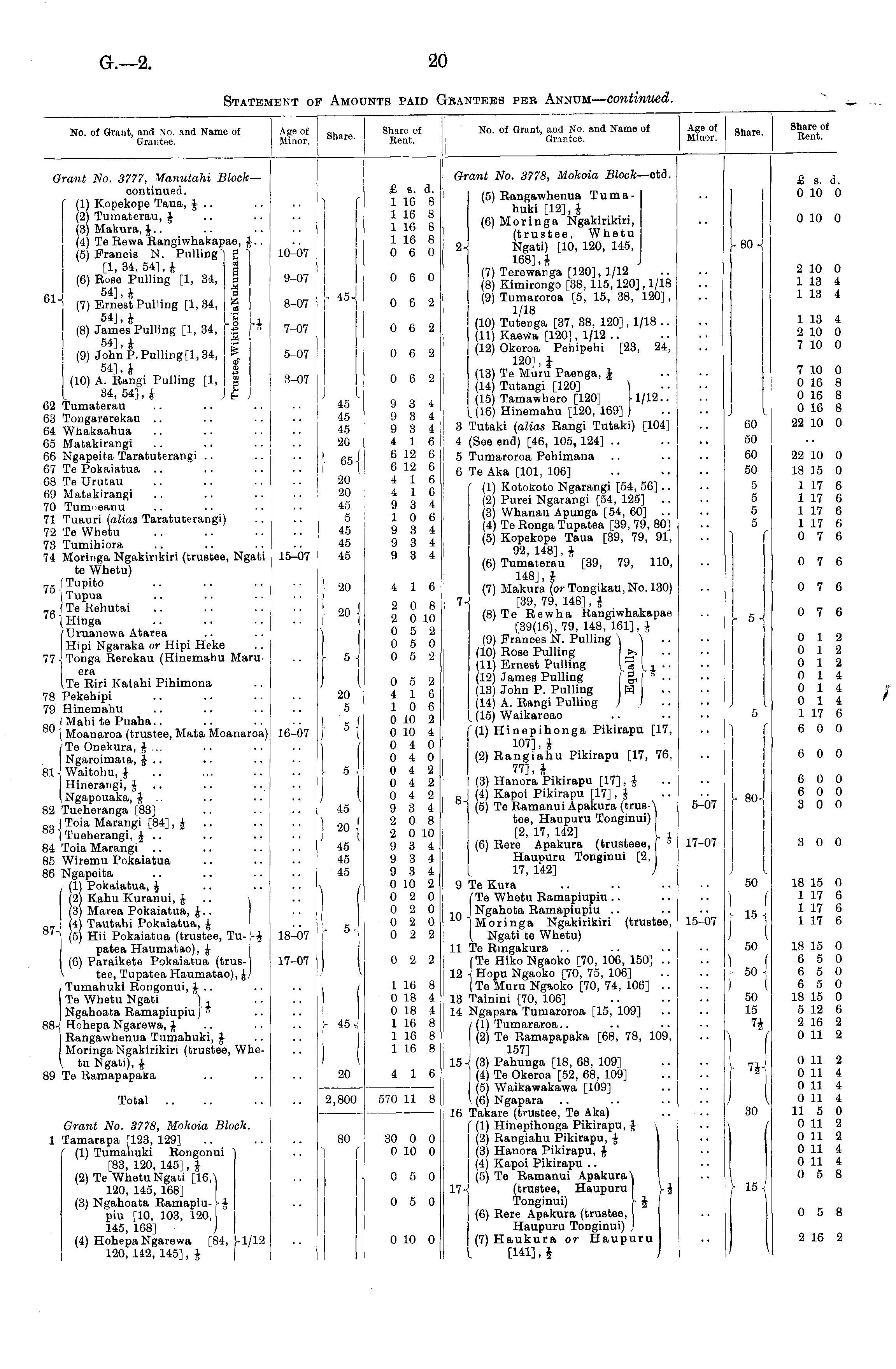No. of Grant, and No. and Name of Grantee. Ago of „. Minor. snare - Share of Rent. Grant No. 3777, Manutahi Blockcontinued. ( (1) Kopekope Taua, \ .. (2) Turaaterau, J I (8) Makura, J.. (4) Te Eewa Rangiwhakapae, J. . (5) Francis N. Pulling ~] g "] [1,34, 54], i § (6) Rose Pulling [1, 34, a | «1 j 54], i a bl (7) Ernest Pulsing [1, 34, 1 54j, 4 I* Li (8) James Pulling [1, 34, r s | * 5*3, 4 g (9) JohnP.Pulling[l,34, K 54]. * I (10) A. Rangi Pulling [1, g I 34, 54], i JS J 62 Tumaterau 63 Tongarerekau 64 Whakaahua 65 Matakirangi 66 Ngapeita Taratuterangi .. 67 Te Pokaiatua 68 Te Urutau 69 Matakirangi 70 Tum-'eanu 71 Tuauri (alias Taratuttrangi) 72 Te Whetu 73 Tumihiora 74 Moringa Ngakinkiri (trustee, Ngati te Whetu) 7 =(Tupito ' \Tupua „„ f Te Rehutai 76 lHinga /Uruanewa Atarea Hi pi Ngaraka or Hipi Heke 77 J Tonga Rerekau (Hinemahu Maruera (Te Riri Katahi Pihimona 78 Pekehipi 79 Hinemahu „„ ( Mabi te Puaha.. {Moanaroa (trustee, Mata Moanaroa) iTe Onekura, J ... I Ngaroimata, j .. 81-jWaitohu, J .. I Hinerangi, J .. iNgapouaka, J .. 82 Tueheranga [88] „,, I Toia Marangi [84] ,4 .. 8d I Tueherangi, J .. 84 Toia Marangi 85 Wiremu Pokaiatua 86 Ngapeita (1 Pokaiatua, J (2 Kahu Kuranui, i .. \ (3 Marea Pokaiatua, J .. (4 Tautahi Pokaiatua, £ ~\ (5) Hii Pokaiatua (trustee, Tu-i-J patea Haumatao), J I (6) Paraikete Pokaiatua (trusV tee, TupateaHaumatao), Tumahuki Rongonui, J .. Te Whetu Ngati \ , Ngahoata Ramapiupiu] * 88 Hohepa Ngarewa, J Rangawhenua Tumahuki, J Moringa Ngakirikiri (trustee, Whetu Ngati), J 89 Te Ramapapaka 10-07 9-07 8-07 7-07 5-07 3-07 15-07 ) i 45 45 45 20 ; «i 20 20 45 5 45 45 45 I 20 I 20) j-45 £ s. d. 1 16 8 1 16 8 1 16 8 1 16 8 0 6 0 0 6 0 0 6 2 0 6 2 0 6 2 0 6 2 9 3 4 9 3 4 9 3 4 4 1 6 6 12 6 6 12 6 4 16 4 16 9 3 4 10 6 9 3 4 9 3 4 9 3 4 4 16 2 0 8 2 0 10 0 5 2 0 5 0 0 5 2 5 16-07 45 I 20 5 5 5 0 5 2 4 16 10 6 0 10 2 0 10 4 0 4 0 0 4 0 0 4 2 0 4 2 0 4 2 9 3 4 2 0 8 2 0 10 9 3 4 9 3 4 9 3 4 0 10 2 0 2 0 0 2 0 0 2 0 0 2 2 1 20< ) I 45 45 45 18^07 I'I 17-07 0 2 2 ) ( :- 45 1 16 8 0 18 4 0 18 4 1 16 8 1 16 8 1 16 8 20 4 16 Total .. 2,800 570 11 8 Grant No. 3778, Mokoia Block. 1 Tamarapa [123, 129] (1) Tumahuki Rongonui ") [83, 120, 145], J (2) Te Whetu Ngati [16A 120, 145, 168] (3) Ngahoata Ramapiu- >■ J piu [10, 103, 120, 145, 168] ■ j (4) Hohepa Ngarewa [84, 120, 142, 145], i I 80 ] r 30 0 0 0 10 0 0 5 0 0 5 0 0 10 0 ■1/12