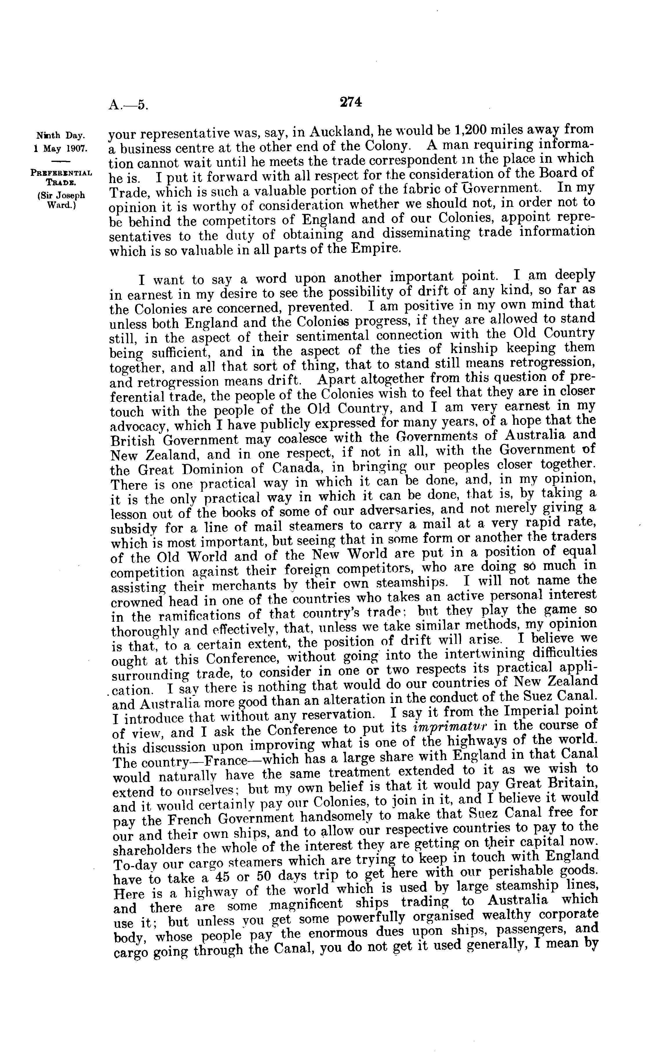 your representative was, say, in Auckland, he would be 1,200 miles away from a business centre at the other end of the Colony. A man requiring information cannot wait until he meets the trade correspondent in the place in which he is. I put it forward with all respect for the consideration of the Board of Trade, which is such a valuable portion of the fabric of Government. In my opinion it is worthy of consideration whether we should not, in order not to be behind the competitors of England and of our Colonies, appoint representatives to the duty of obtaining and disseminating trade information which is so valuable in all parts of the Empire. I want to say a word upon another important point. I am deeply in earnest in my desire to see the possibility of drift of any kind, so far as the Colonies are concerned, prevented. lam positive in my own mind that unless both England and the Colonies progress, if they are allowed to stand still in the aspect of their sentimental connection with the Old Country being sufficient, and in the aspect of the ties of kinship keeping them together, and all that sort of thing, that to stand still means retrogression, and retrogression means drift. Apart altogether from this question of preferential trade, the people of the Colonies wish to feel that they are in closer touch with the people of the Old Country, and I am very earnest in my advocacy, which I have publicly expressed for many years, of a hope that the British Government may coalesce with the Governments of Australia and New Zealand, and in one respect, if not in all, with the Government of the Great Dominion of Canada, in bringing our peoples closer together. There is one practical way in which it can be done, and, in my opinion, it is the only practical way in which it can be done, that is, by taking a lesson out of the books of some of our adversaries, and not merely giving a subsidy for a line of mail steamers to carry a mail at a very rapid rate, which is most important, but seeing that in some form or another the traders of the Old World and of the New World are put in a position of equal competition against their foreign competitors, who are doing so much in assisting their merchants by their own steamships. I will not name the crowned head in one of the countries who takes an active personal interest in the ramifications of that country's trade: but they play the game so thoroughly and effectively, that, unless we take similar methods my opinion is that to a certain extent, the position of drift will arise. I believe we ought at this Conference, without going into the intertwining difficulties surrounding trade, to consider in one or two respects its practical application I say there is nothing that would do our countries of New Zealand ' and Australia more good than an alteration in the conduct of the Suez Canal I introduce that without any reservation. I say it from the Imperial point of view, and I ask the Conference to put ,ts imprimatur in the course of this discussion upon improving what is one of the highways of the world. The eountry-France-which has a large share with England in that Canal would naturally have the same treatment extended to it as we wish to Txtend to o "serves; but mv own belief is that it would pay Great Britain and H would certainly pay our Colonies, to join in it, and I believe it would nay the French Government handsomely to make that Suez Canal free for our and their own ships, and to allow our respective countries to pay to the shareholders the whole of the interest they are getting on their capital To-daom cargo steamers which are trying to keep in touch with England have to take a 45 or 50 days trip to get here with our perishable goods. Here Ts a hVhwav of the world which is used by large steamship lines and there are some .magnificent ships trading to Australia which use if but unless voir get some powerfully organised wealthy corporate body whose people pay the enormous dues upon ships, passengers, and cargo gdng through the Canal, you do not get it used generally, I mean by