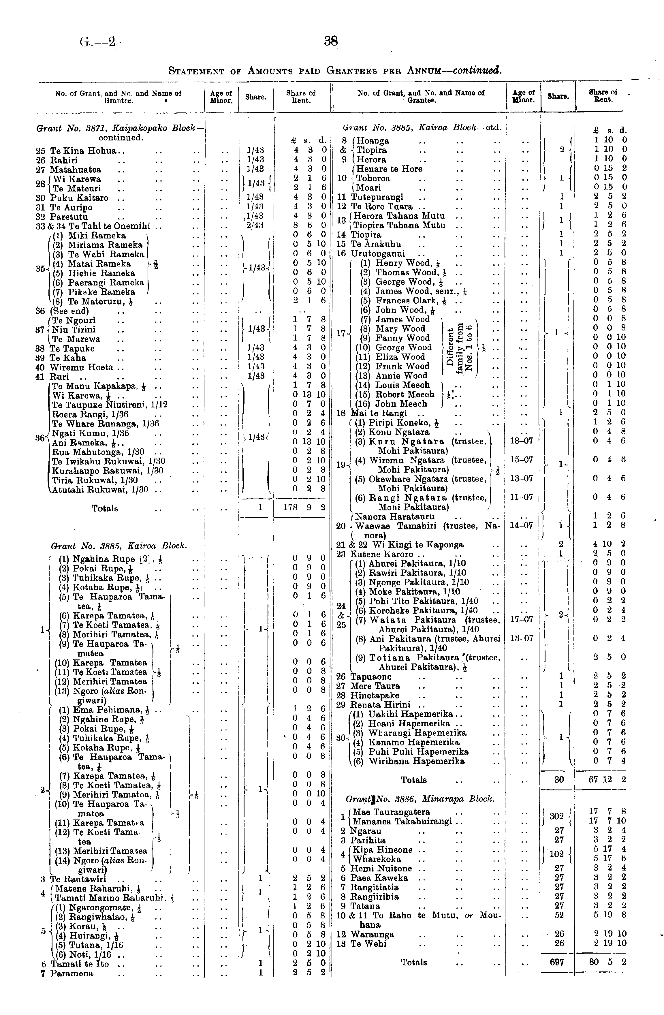No. of Grant, and No. and Name of Grantee. • Apsof Minor. Share. Share of Rent. Grant No. 3871, Kaipakopako Block — continued. 25 TeKina Hohua.. 26 Efthiri 27 Matahuatea oQ i Wi Karewa '"'jTe Mateuri 30 Puku Kaitaro 31 Tβ Auripo 32 Paretutu 33 & 34 Tβ Tahi te Onemihi .. (1) Miki Rameka (2) Miriama Rameka (3) Te Wehi Rameka o_J(4) Matai Rameka I (5) Hiehie Rameka (6) Paerangi Rameka (7) Pikftke Rameka \S) Te Materuru, J 36 (See end) (Tβ Ngouri 37 \ Niu Tirini (Te Marewa 38 Te Tapuke 39 Tβ Kaha 40 Wiremu Hoeta 41 Ruri .. Tβ Manu Kapakapa, £ .. Wi Karewa, £ .. Te Taupuke Niutireni, 1/12 Roera Rangi, 1/36 Tβ Whare Runanga, 1/36 •wjNgati Kumu, 1/36 dt MAm Rameka, J.. Rua Mahutonga, 1/30 Te Iwikahu Rukuwai, 1/30 Kurahaupo Rakuwai, 1/30 Tiria Rukuwai, 1/30 \Atutahi Rukuwai, 1/30 1/43 1/43 1/43 J 1/43) 1/43 1/43 .1/43 2/43 U s. d. 4 3 0 4 3 0 4 3 0 2 16 2 16 4 3 0 4 3 0 4 3 0 8 6 0 0 6 0 0 5 10 0 6 0 0 5 10 0 6 0 0 5 10 0 6 0 2 16 -1/4318 19 10 H } 1/43] 1/43 1/43 1/43 1/43 17 8 J 7 8 17 8 4 3 0 4 3 0 4 3 0 4 3 0 17 8 0 13 10 0 7 0 0 2 4 0 2 6 0 2 4 0 13 10 0 2 8 0 2 10 0 2 8 0 2 10 0 2 8 U/43, Totals 1 178 9 2 Grant No. 3885, Kairoa Block. 0 9 0 0 9 0 0 9 0 0 9 0 0 16 ( (1) Ngabina Rupe [2], J (2) Pokai Rupe, J (3) Tuhikaka Rupe, J .. 4) Kotaha Rupe, *l .. (5) Te Hauparoa Tama- j tea, I 6 Karepa Tamatea, £ j J 7 Te Koeti Tamatea, £ ] 8 Merihiri Tamatea, £ 9 Te Hauparoa Ta- \ K matea | | ' (10) Karepa Tamatea j (11) Te Koeti Tamatea V j (12) Merihiri Tamatea (13) Ngoro (alias Ron- [ giwari) J f (1) Ema Pehimana, J .. (2) Ngahine Rupe, £ 1 (3) Pokai Rupe, J (4) Tuhikaka Rupe, (5) Kotaha Rupe, § (6) Te Hauparoa Tama- \ tea, £ (7) Karepa Tamatea, £ « (8) Te Koeti Tamatea, i ) (9) Merihiri Tamatea, j r^ I (10) Te Hauparoa Ta- -, matea f-J (11) Karepa Tamatta (12) Te Koeti Tama- ■ , tea r* (13) Merihiri Tamatea (14) Ngoro (alias Rongiwari) J J 3 Te Rautawiri .. . (Matene Raharuhi. i jTamati Marino Rakjaruhi. « f(l) Ngarongomate, J (2) Rangiwhaiao, i (3)Korau, £ (4) HuiraDgi, J (5) Tutana, 1/16 (6)Noti,l/16 .. 6 Tamati te Ito .. 7 Paramena (■ (: ( (1] 3 M (5 6 O y .1 a ■8 :i] (a; 3 * 5) (g; 0 16 0 16 0 16 0 0 6 0 0 6 0 0 8 0 0 8 0 0 8 12 6 0 4 6 0 4 6 • 0 4 6 0 4 6 0 0 8 (7; 8 (9] (io; 0 0 8 0 0 8 0 0 10 0 0 4 J 0 0 4 0 0 4 (111 (l^ (18| (1*1 0 0 4 0 0 4 3 Te R (Mai 4 jTar /(i): (2): ,J 1 (4): (5)' 1(6): 6 Tam 7 Para .1 1 1 2 5 2 12 6 12 6 12 6 0 5 8 0 5 8 0 5 8 0 2 10 0 2 10 2 5 0 2 5 2 1 - 1 1