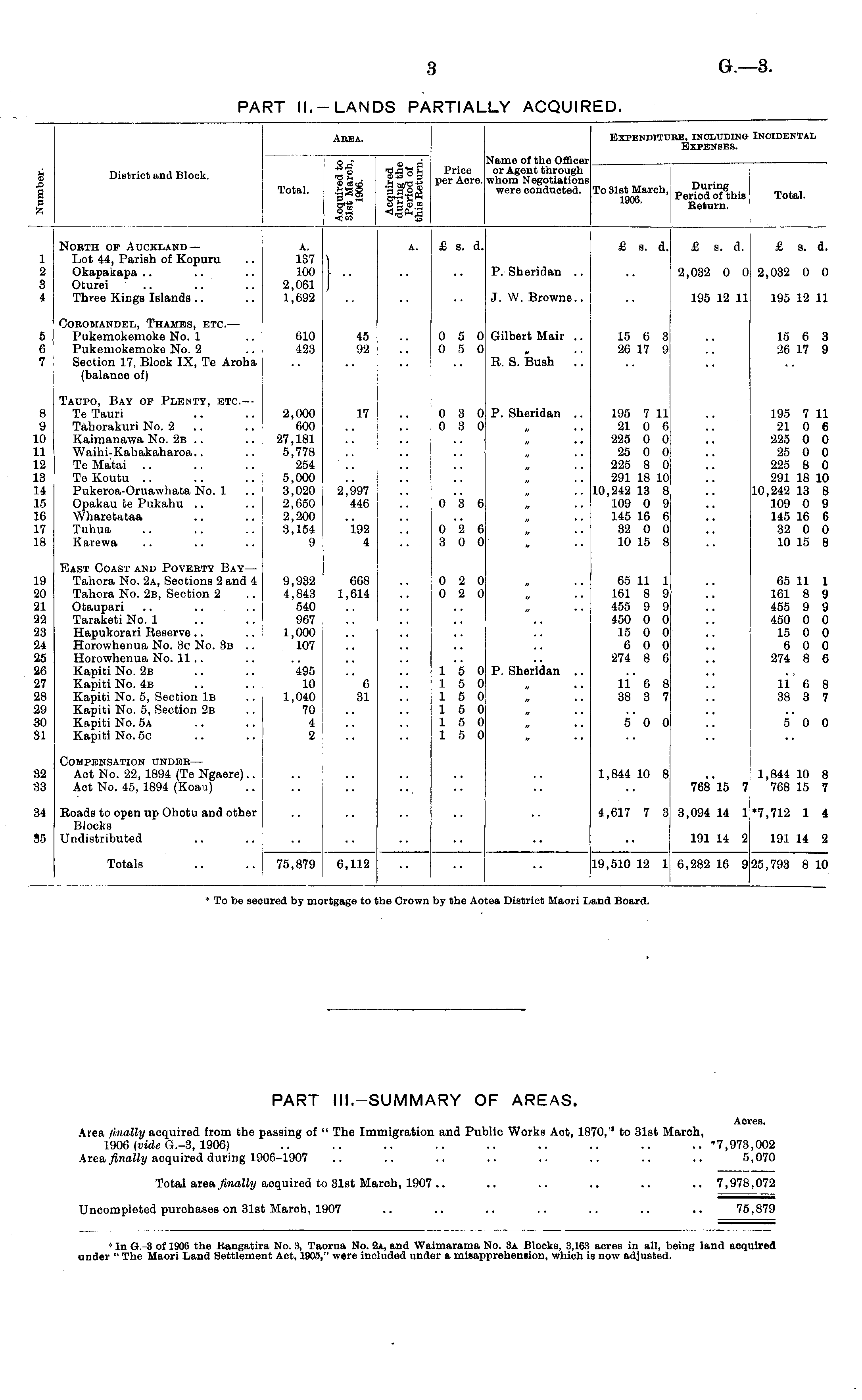 PART 111.-SUMMARY OF AREAS. Acres. Area finally acquired from the passing of " The Immigration and Public Worke Act, 1870," to 31st March, 1906 (vide G.-3, 1906) .. .. .. .. .. .. .. .. .. '7,973,002 Area finally acquired during 1906-1907 .. .. .. .. .. .. .. .. 5,070 Total area finally acquired to 31st Marob, 1907 .. .. .. .. .. ..7,978,072 Uncompleted purchases on 31st March, 1907 .. .. .. .. .. .. .. 75,879 *In G.-3 of 1906 the Kangatira No. 3, Taorua No. 2a, and Waimarama No. 3a Blocks, 3,163 acres in all, being land acquired under " The Maori Land Settlement Act, 1906," were included under a misapprehension, which is now adjusted.