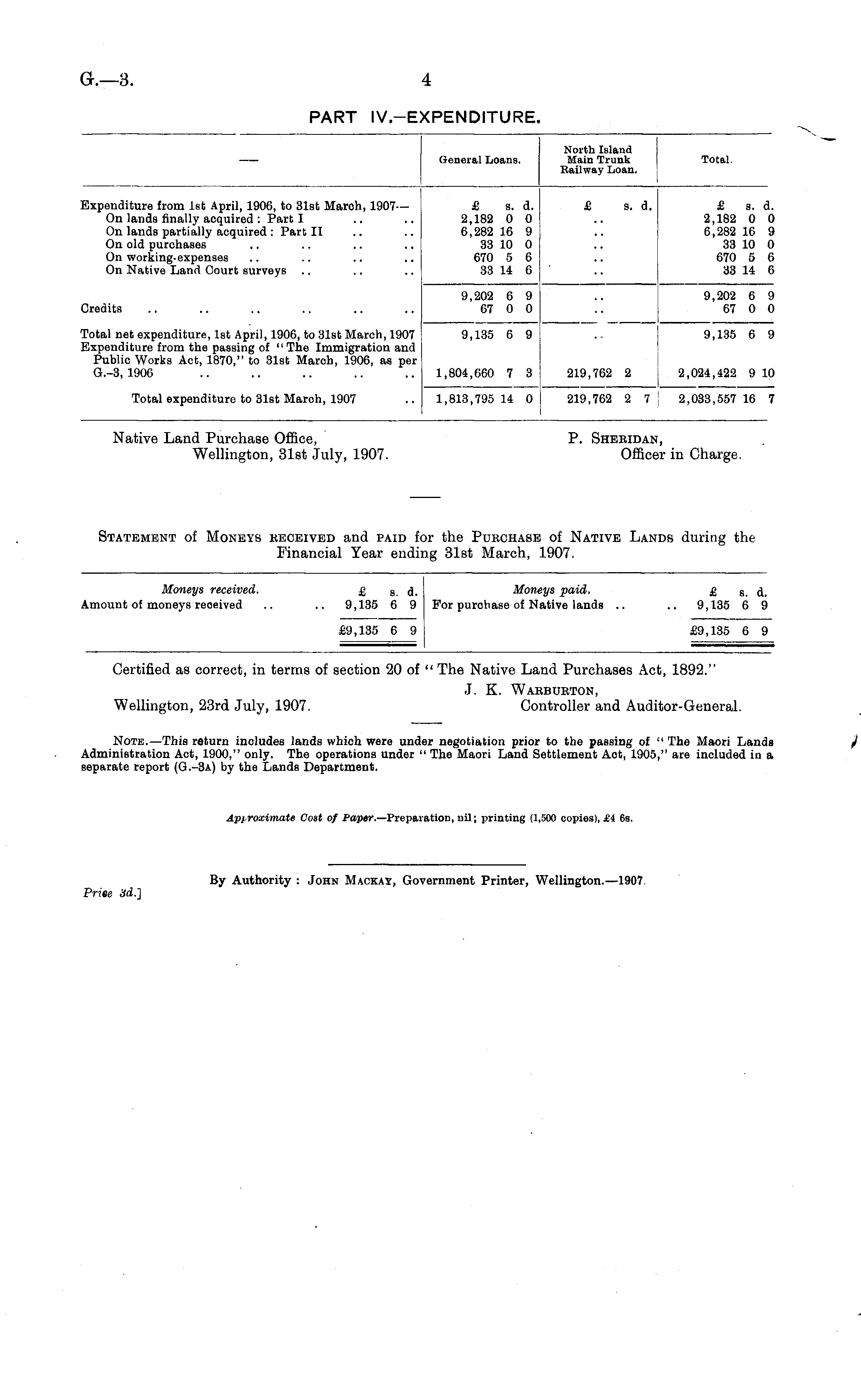 General Loans. North Island Main Trunk Railway Loan. I Total. Expenditure from 1st April, 1906, to 31st March, 1907 — On lands finally acquired : Part I On lands partially acquired : Part II On old purchases On working-expenses On Native Land Court surveys £ s. d. 2,182 0 0 6,282 16 9 33 10 0 670 5 6 33 14 6 £ s. d. £ a. d. 2,182 0 0 6,282 16 9 33 10 0 670 5 6 33 14 6 Iredits 9,202 6 9 67 0 0 9,202 6 9 67 0 0 'otal net expenditure, 1st April, 1906, to 31st March, 1907 Expenditure from the passing of "The Immigration and Public Works Act, 1870," to 31st March, 1906, as per G.-3, 1906 9,135 6 9 9,135 6 9 1,804,660 7 3 219,762 2 2,024,422 9 10 Total expenditure to 31st March, 1907 1,813,795 14 0 219,762 2 7 2,033,557 16 7 Native Land Purchase Office, P. Shekidan, Wellington, 31st July, 1907. Officer in Charge. Statement of Moneys received and paid for the Purchase of Native Lands during the Financial Year ending 31st March, 1907. Moneys received. .mount of moneys reoeived £ s. d. Moneys paid, 9,135 6 9 For purchase of Native lands .. £9,135 6 9 £ s. d. 9,135 6 9 £9,135 6 9