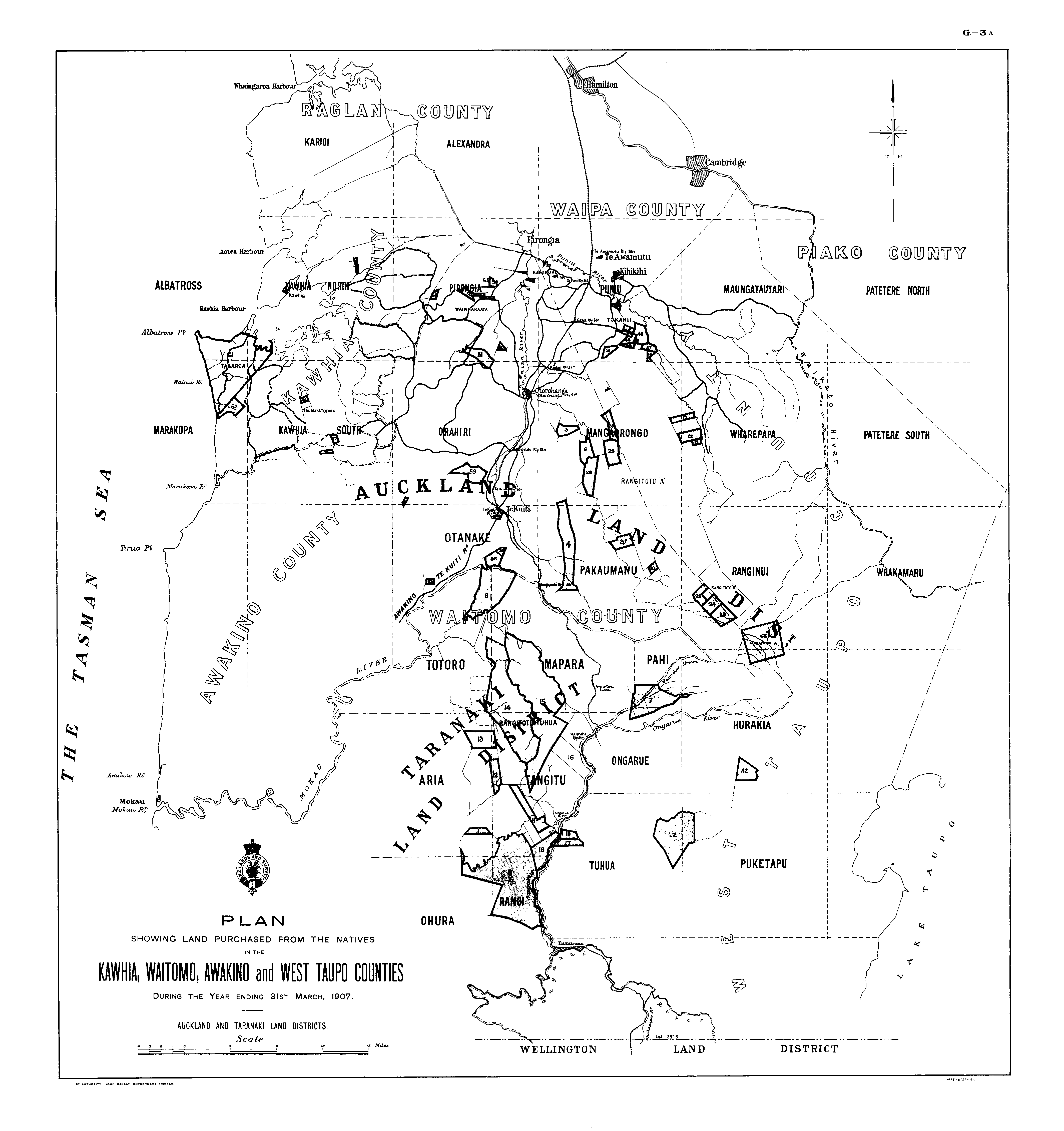 PLAN SHOWING LAND PURCHASED FROM THE NATIVES KAWHIA, WAITOMO, AMINO and WEST TAUPO COUNTIES During the Year ending 31st March, 1907. AUCKLAND AND TARANAKI LAND DISTRICTS.