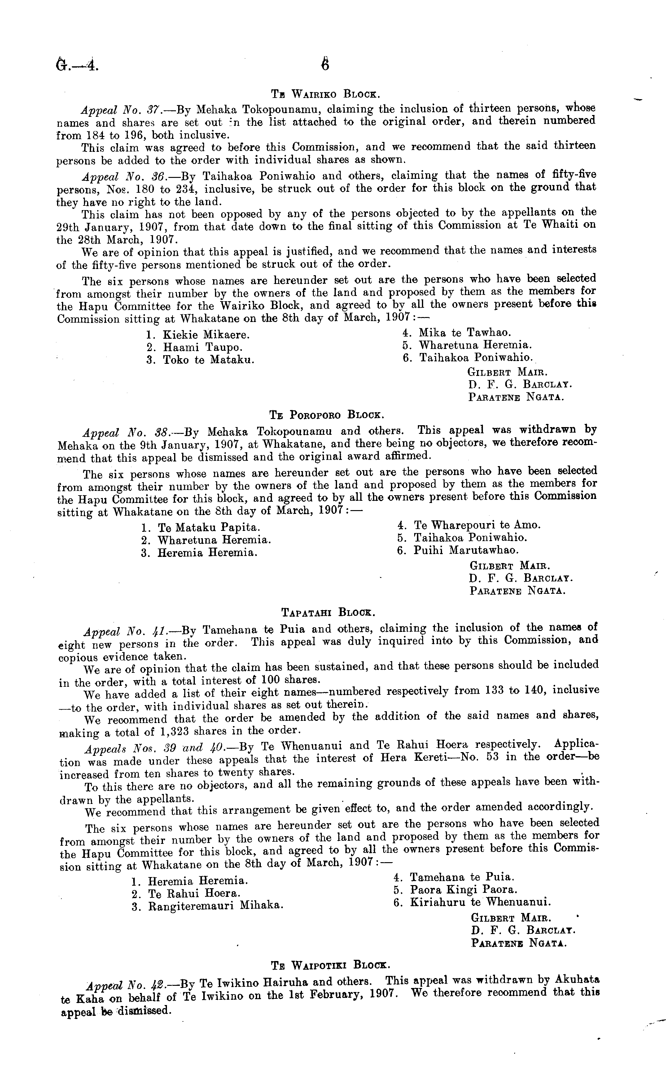 Tβ Wairiko Block. Appeal No. 37. —8y Mehaka Tokopounamu, claiming the inclusion of thirteen persons, whose names and shares are set out ; n the list attached to the original order, and therein numbered from 184 to 196, both inclusive. This claim was agreed to before this Commission, and we recommend that the said thirteen persons be added to the order with individual shares as shown. Appeal No. 36. —8y Taihakoa Poniwahio and others, claiming that the names of fifty-five persons, Nos. 180 to 234, inclusive, be struck out of the order for this block on the ground that they have no right to the land. This claim has not been opposed by any of the persons objected to by the appellants on the 29th January, 1907, from that date down to the final sitting of this Commission at Te Whaiti on the 28th March, 1907. We are of opinion that this appeal is justified, and we recommend that the names and interests of the fifty-five persons mentioned be struck out of the order. The six persons whose names are hereunder set out are the persons who have been selected from amongst their number by the owners of the land and proposed by them as the members for the Hapu Committee for the Wairiko Block, and agreed to by all the owners present before this Commission sitting at Whakatane on the Bth day of March, 1907: — 1. Kiekie Mikaere. 4. Mika te Tawhao. 2. Haami Taupo. 5. Wharetuna Heremia. 3. Toko te Mataku. 6. Taihakoa Poniwahio. Gilbert Mair. D. F. G. Barclay. Pabatene Ngata. Te Poroporo Block. Appeal No. 38. —By Mehaka Tokopounamu and others. This appeal was withdrawn by Mehaka on the 9th January, 1907, at Whakatane, and there being no objectors, we therefore recommend that this appeal be dismissed and the original award affirmed. The six persons whose names are hereunder set out are the persons who have been selected from amongst their number by the owners of the land and proposed by them as the members for the Hapu Committee for this block, and agreed to by all the owners present before this Commission sitting at Whakatane on the Bth day of March, 1907: — 1. Te Mataku Papita. 4- Te Wharepouri te Amo. 2. Wharetuna Heremia. 5. Taihakoa Poniwahio. 3. Heremia Heremia. 6. Puihi Marutawhao. Gilbert Mair. D. F. G. Barclay. Paratenb Ngata. Tapatahi Block. Appeal No. £1. By Tamehana te Puia and others, claiming the inclusion of the names of eight new persons in the order. This appeal was duly inquired into by this Commission, and copious evidence taken. . We are of opinion that the claim has been sustained, and that these persons should be included in the order, with a total interest of 100 shares. ,/„.,. We have added a list of their eight names—numbered respectively from 133 to 140, inclusive to the order, with individual shares as set out therein. We recommend that the order be amended by the addition of the said names and shares, making a total of 1,323 shares in the order. Appeals Nos 39 and 40.—8y Te Whenuanui and Te Rahui Hoera respectively. Application was made under these appeals that the interest of Hera Kereti—No. 53 in the order—be increased from ten shares to twenty shares. . To this there are no objectors, and all the remaining grounds of these appeals have been withdrawn by the appellants. ~ , We recommend that this arrangement be given effect to, and the order amended accordingly. The six persons whose names are hereunder set out are the persons who have been selected from amongst their number by the owners of the land and proposed by them as the members for the Hapu Committee for this block, and agreed to by all the owners present before this Commission sitting at Whakatane on the Bth day of March, 1907: — 1 Heremia Heremia. 4. Tamehana te Puia. 2. Te Rahui Hoera. 5- Paora Kingi Paora. 3. Rangiteremauri Mihaka. 6. Kiriahuru te Whenuanui. Gilbert Mair. D. F. G. Barclay. Paratenb Ngata. Tβ Waipotiki Block. Avveal No A2 —By Te Iwikino Hairuha and others. This appeal was withdrawn by Akuhata te Kaha on behalf of Te Iwikino on the Ist February, 1907. We therefore recommend that this appeal be dismissed.